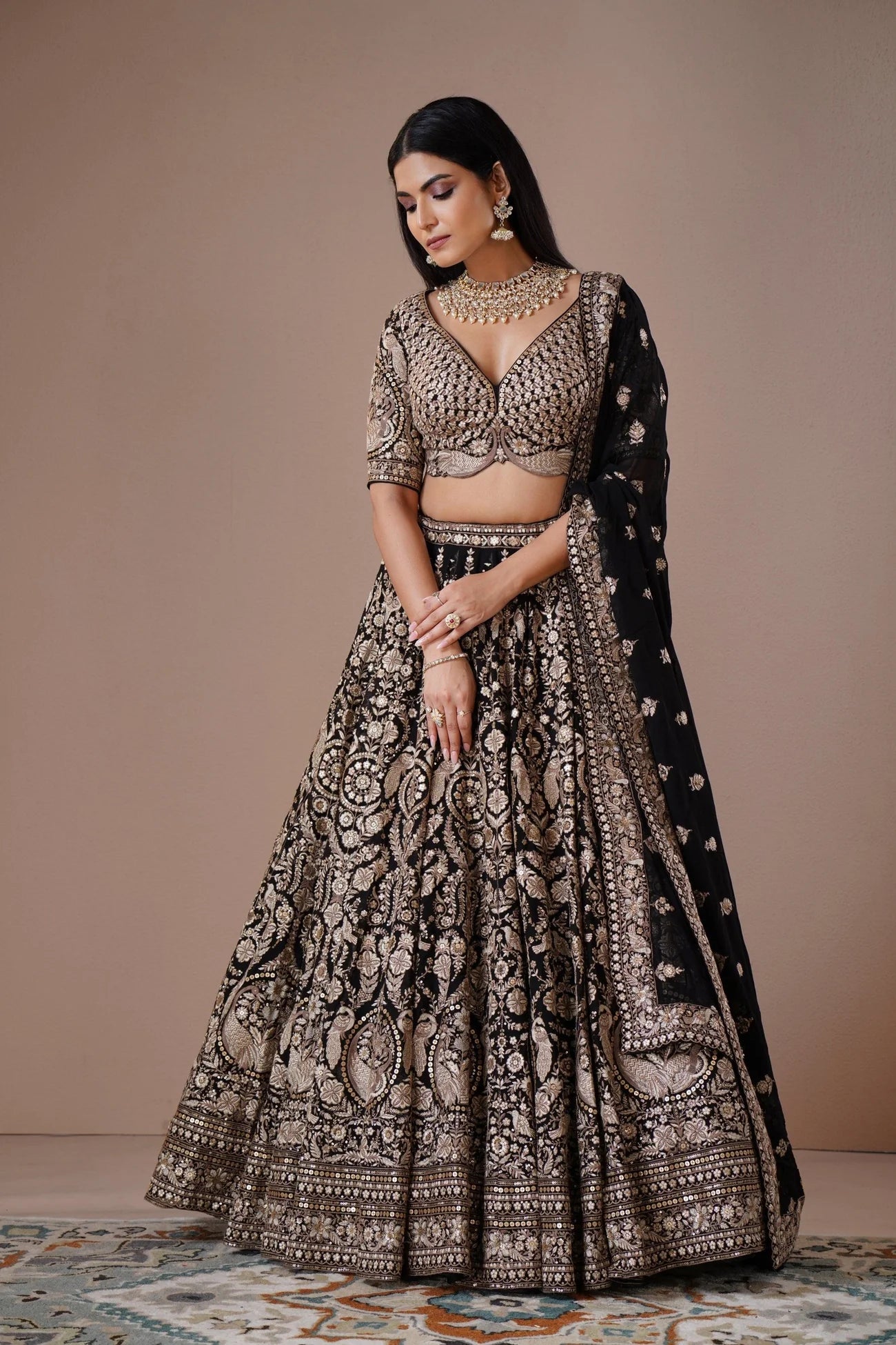 Exude regal charm in this luxurious black bridal lehenga, meticulously crafted in flowing georgette and adorned with opulent antique gold zardosi embroidery. The lehenga features an elaborate floral and paisley motif pattern throughout, rendered with intricate dabka, resham, and sequin detailing that brings richness and depth to the ensemble.