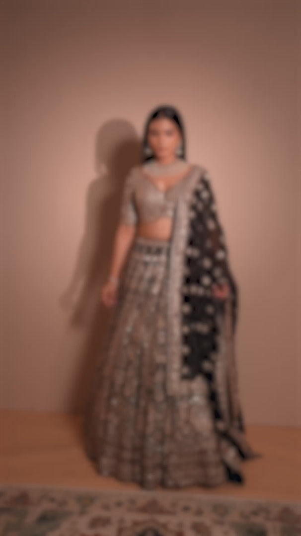 The deep sweetheart neckline blouse is fully embroidered in gold zardosi and mirror highlights, creating a sculpted silhouette with half sleeves that enhance the overall elegance. Complementing the ensemble is a sheer black dupatta, delicately sprinkled with floral buttas and edged with a detailed embroidered border that mirrors the lehenga’s ornate craftsmanship.