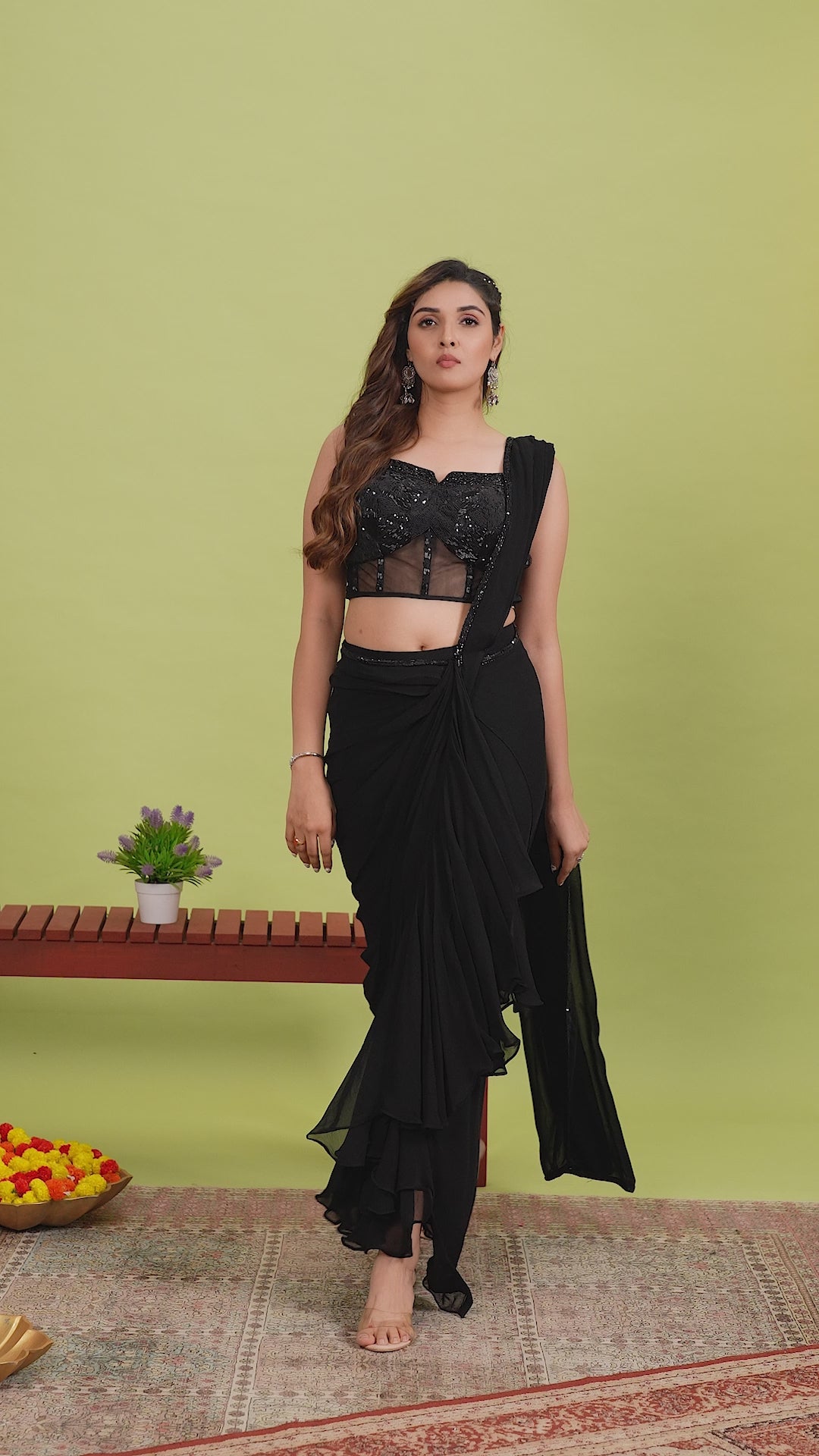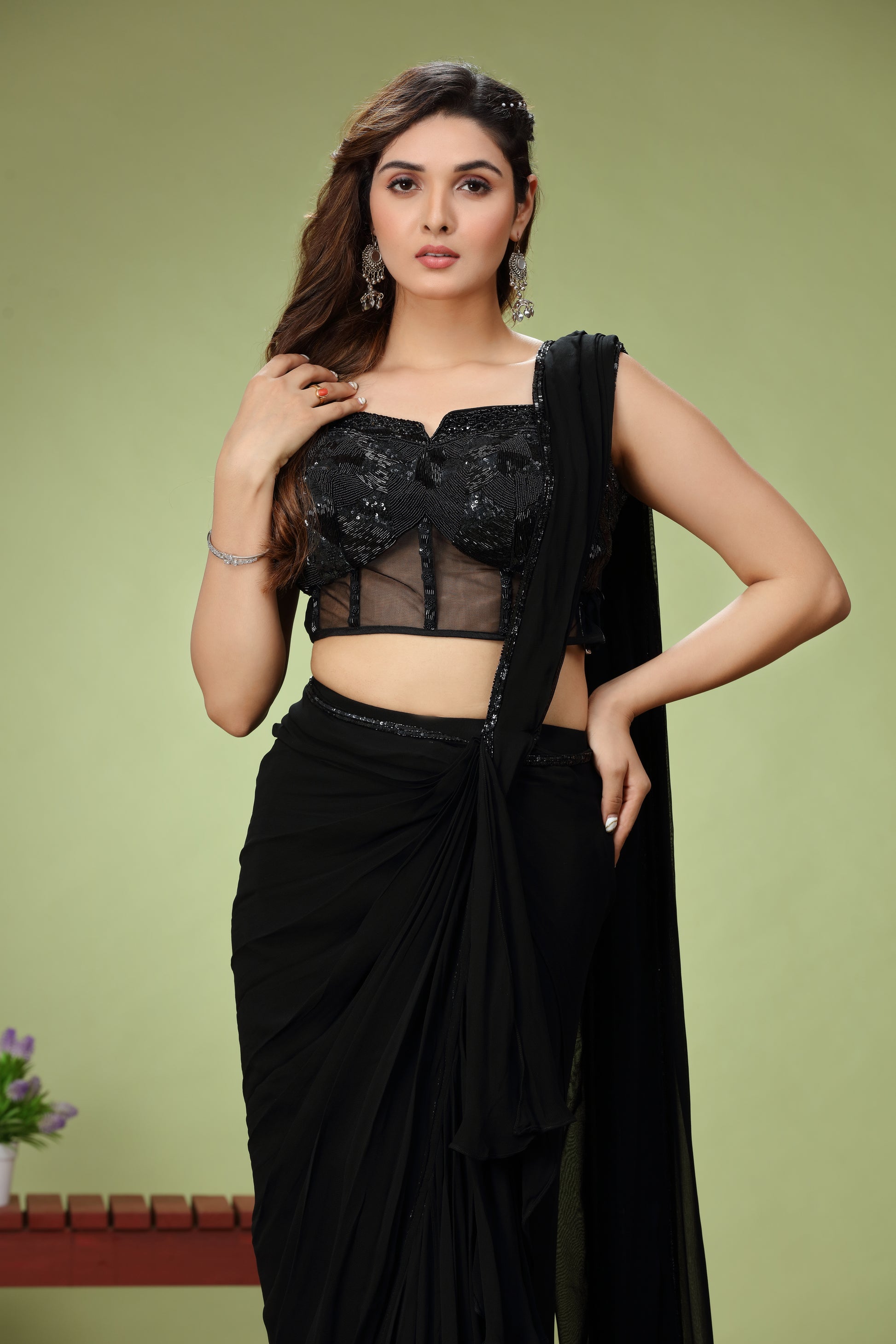 Black Georgette Designer Drape Saree With Sequins Work Blouses