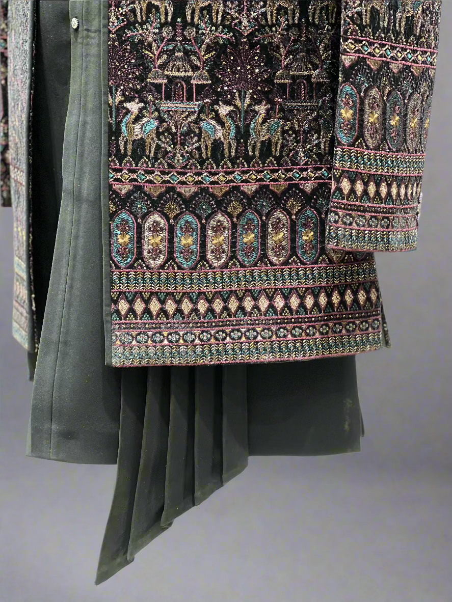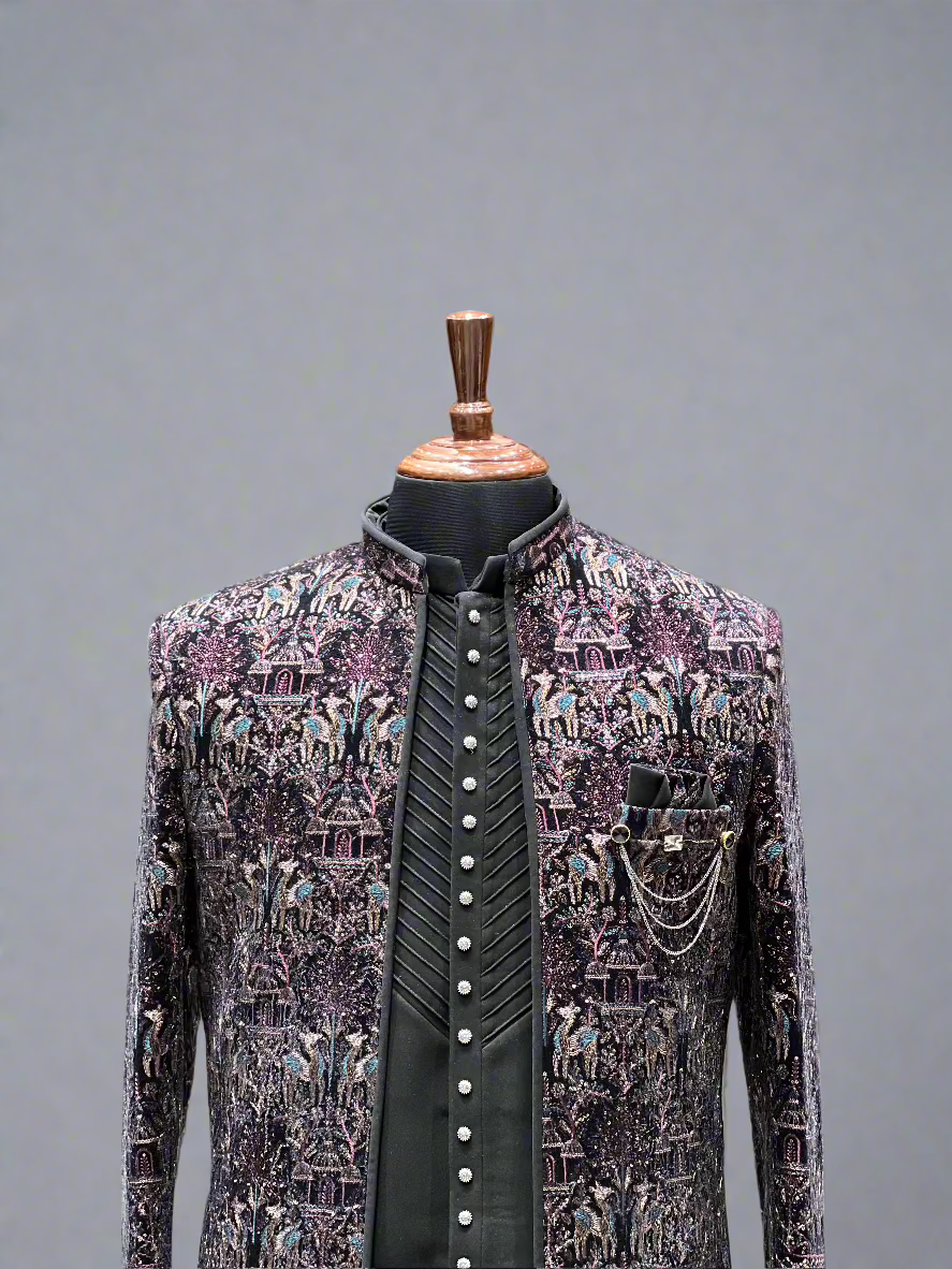 The inner layer is styled in rich black fabric with a pleated kurta finish and antique-finish buttons running down the front. A classic bandhgala collar, layered design, and elegant metallic chain brooch add layers of detail and sophistication.