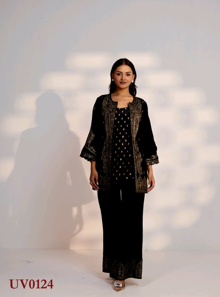 A black kurti pant set for women is elevated with a designer jacket, exuding timeless sophistication. The jacket's diamond work adds a touch of opulence and allure to the ensemble. Perfect for special occasions or formal gatherings, this outfit offers a blend of elegance and style, making a striking impression with its captivating details.