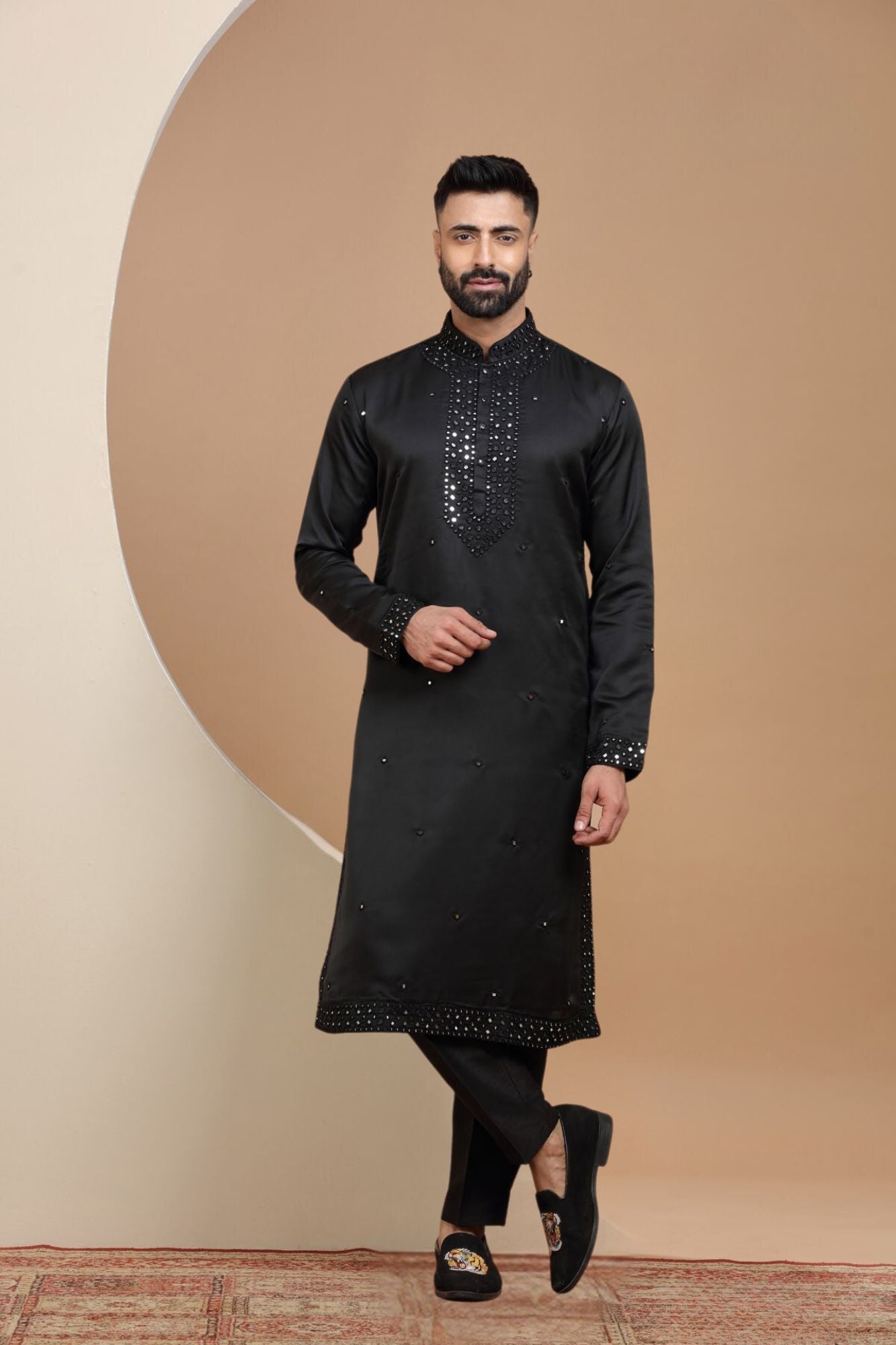 This kurta set is a stylish addition to your wardrobe with its black mirror work. Perfect for any occasion, this set will make you stand out in a crowd. The intricate mirror work adds a touch of elegance and the soft fabric ensures comfort. Upgrade your style game with this set today!