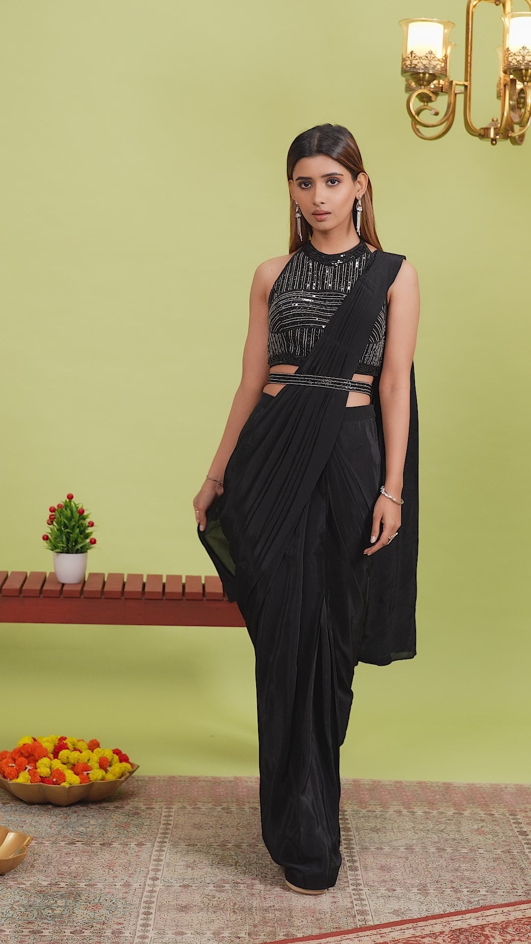 Get ready to turn heads in this Black Pre-Stitched Saree Set! Featuring an abstract embellished blouse and an embellished belt, this set is sure to make a statement. No need for stitching, just slip it on and hit the town. Perfect for those who want to make a bold and unique fashion statement.