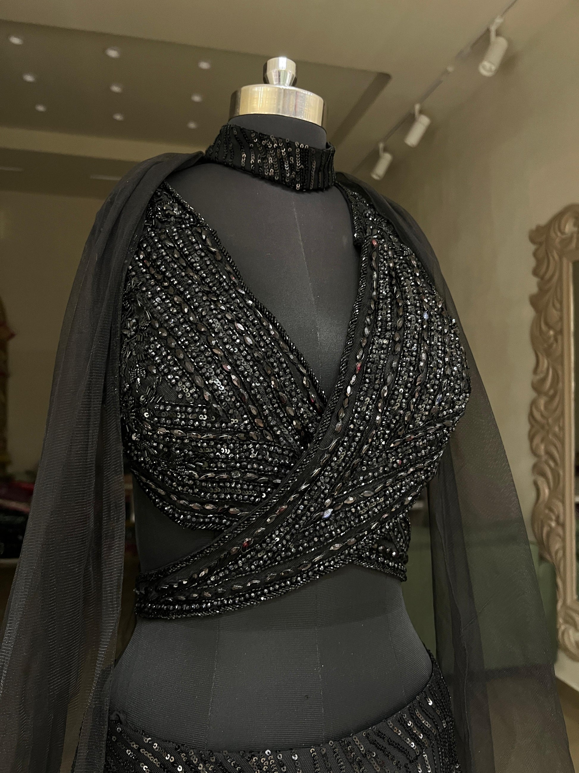 Black Sequins Pre-Draped Saree Style Lehenga with Halter Blouse & Cape Dupatta