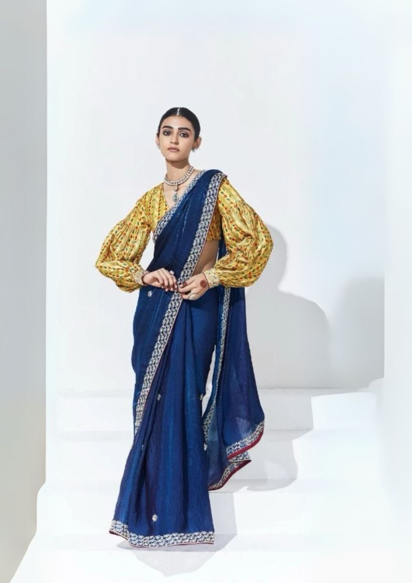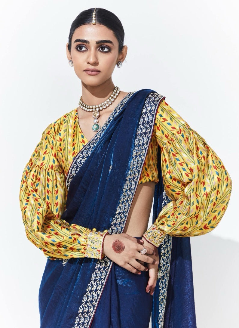 Blue Organza Saree with Yellow Satin Silk Blouse