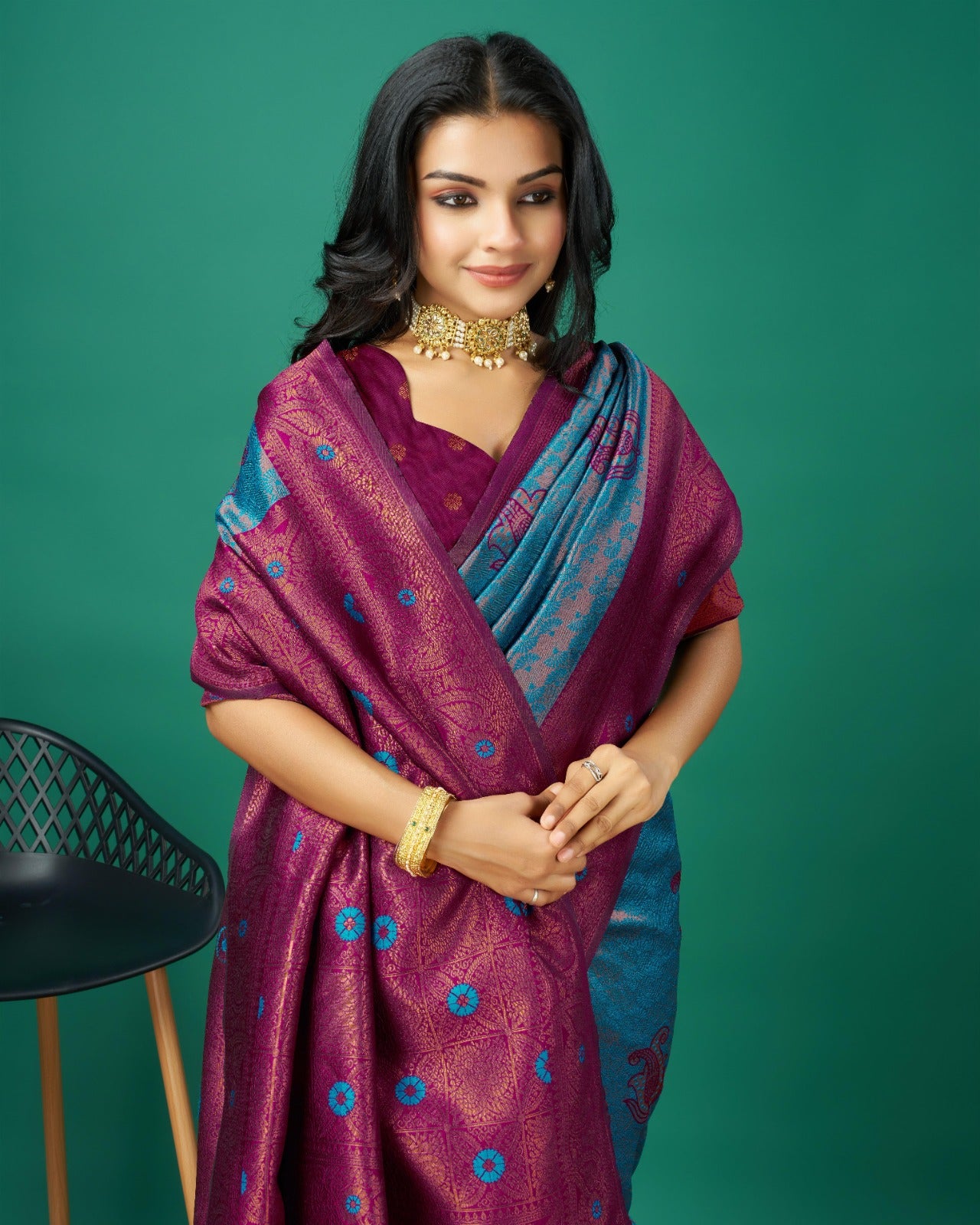 Add a touch of elegance to your wardrobe with our Blue Zari Woven Banarasi Silk Saree. Made with luxurious Banarasi silk and intricately woven with zari detailing, this saree is perfect for any occasion. The delicate tassels add a graceful charm to the saree, making it a must-have for any saree lover.