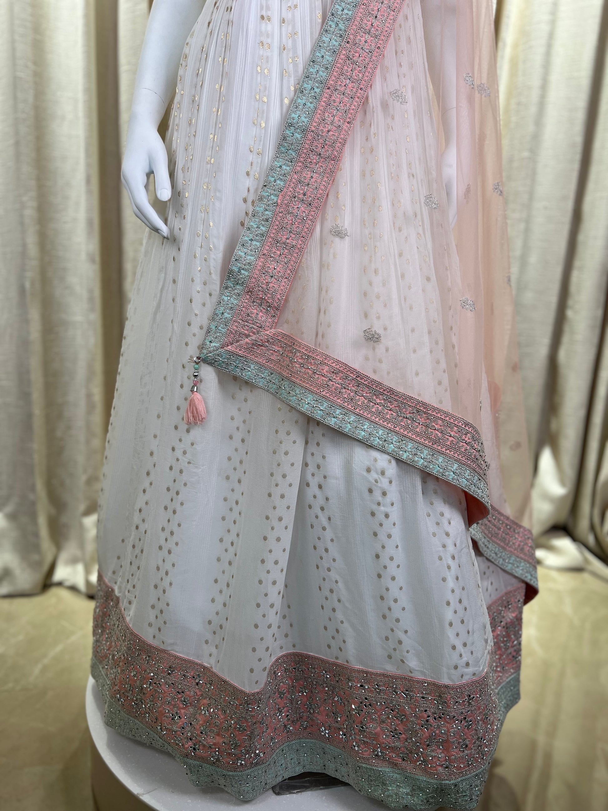 Ethereal and feminine, this Anarkali-style gown features a blush pink sleeveless bodice intricately adorned with mirror work and delicate embroidery, perfectly complemented by a flowy white flare accentuated with subtle gold vertical patterns. The hemline is richly bordered with sequins, zari embroidery, and contrast mint green edging for a refined finish. Paired with a soft peach net dupatta bordered in coordinating embroidery and tassel detailing, this ensemble is a celebration of grace and sparkle. Ideal for weddings, receptions, or festive evenings, this outfit blends traditional craftsmanship with modern elegance.