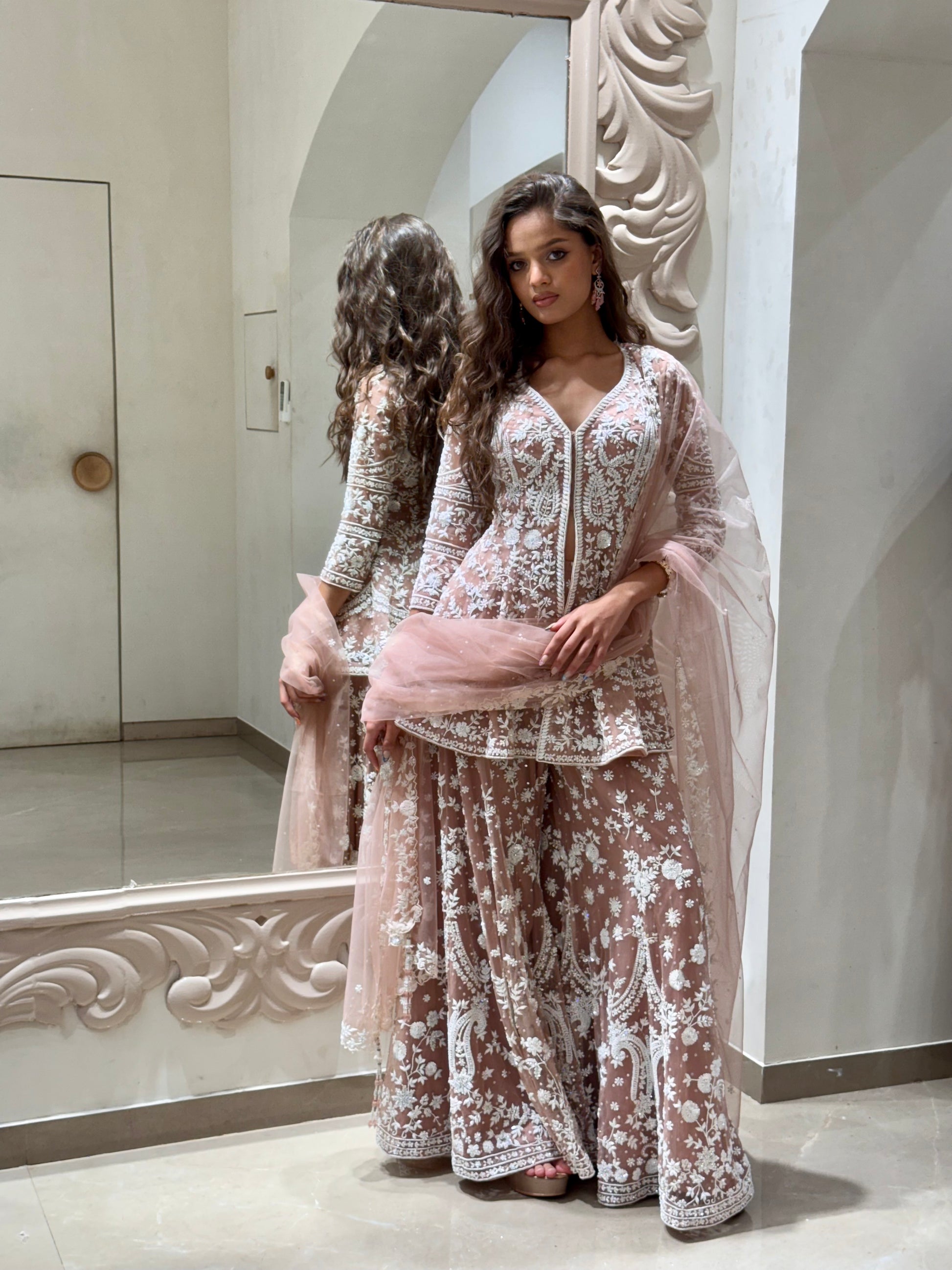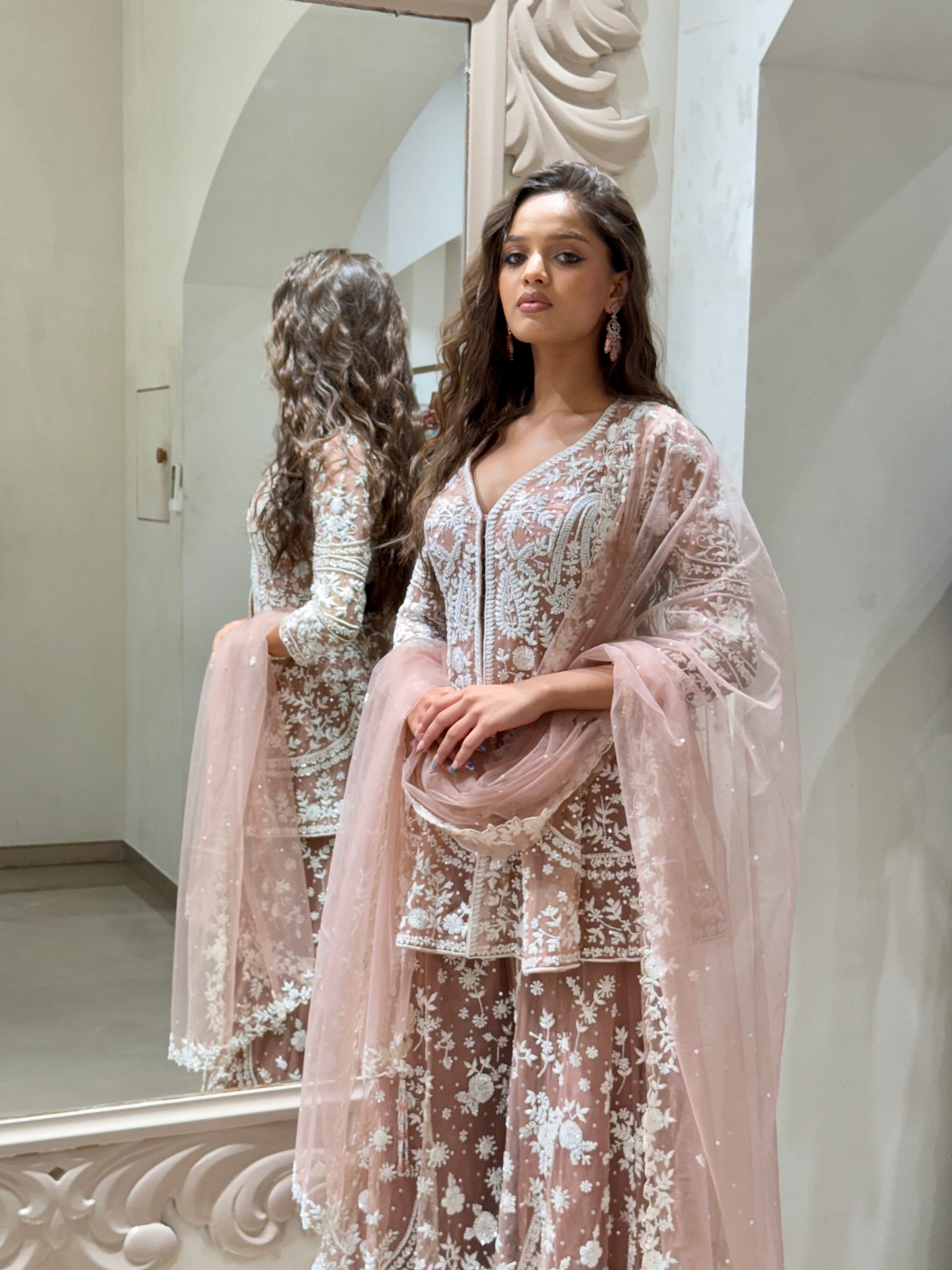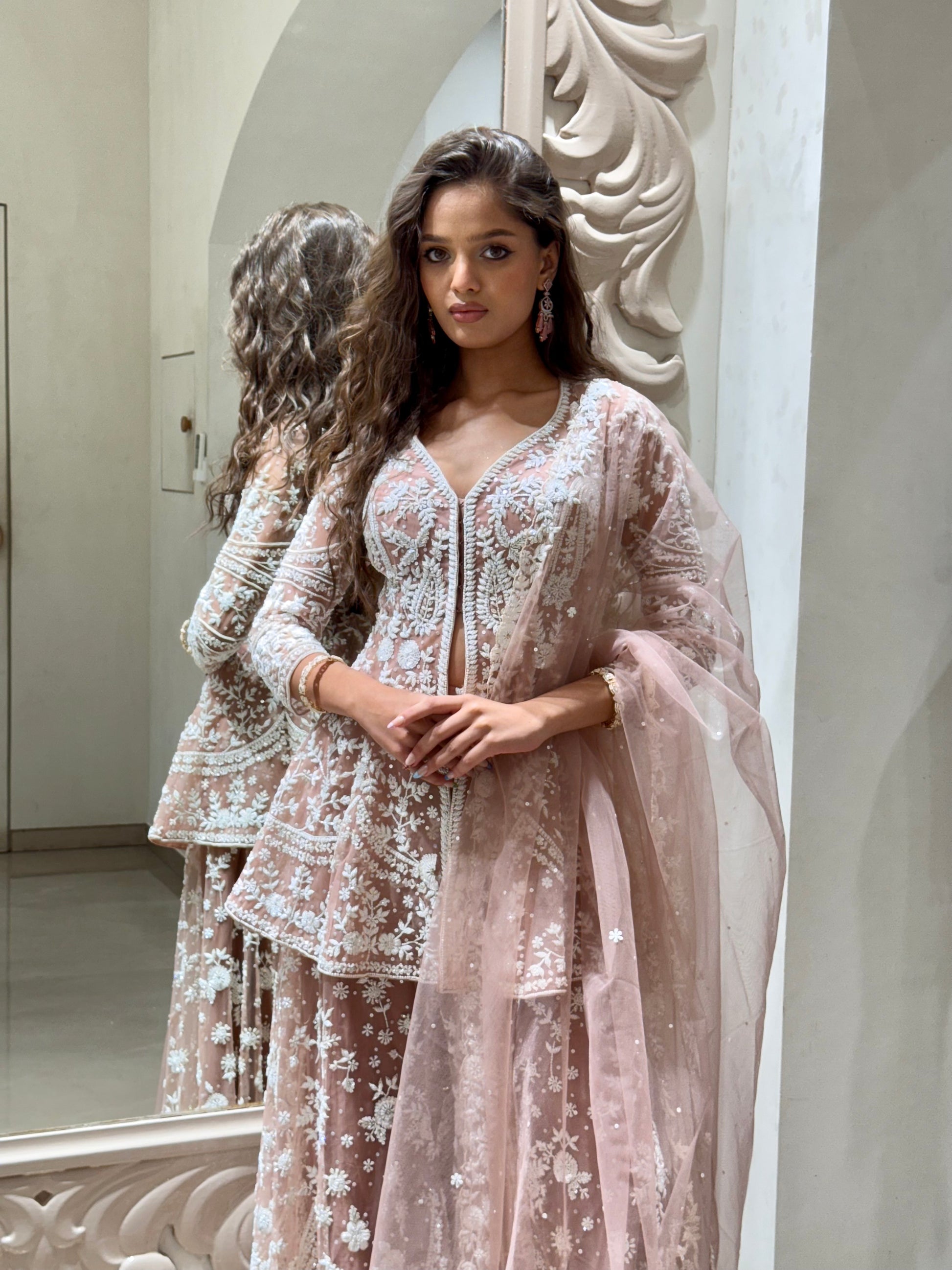 Blush Pink Net Sharara Set with White Thread & Sequin Work