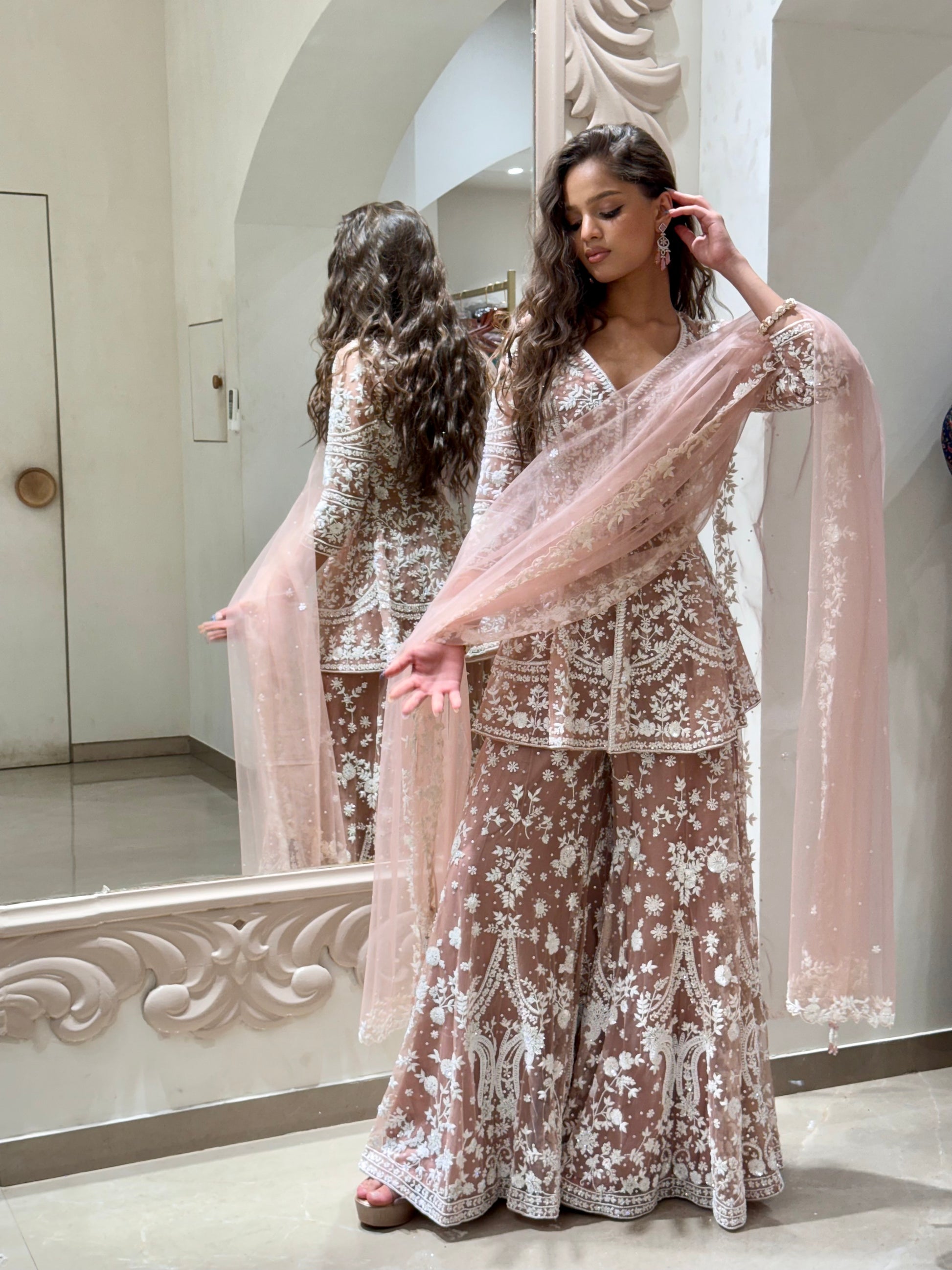 Make a stunning statement with this blush pink sharara set, delicately adorned with all-over white thread embroidery and shimmering sequin detailing. The short peplum-style kurta features a deep V neckline and full sheer sleeves, paired elegantly with flared sharara pants that are richly embellished with floral and jaal motifs. A matching soft net dupatta with embroidered borders adds graceful charm, making this ensemble perfect for engagement ceremonies, festive gatherings, or special occasions.