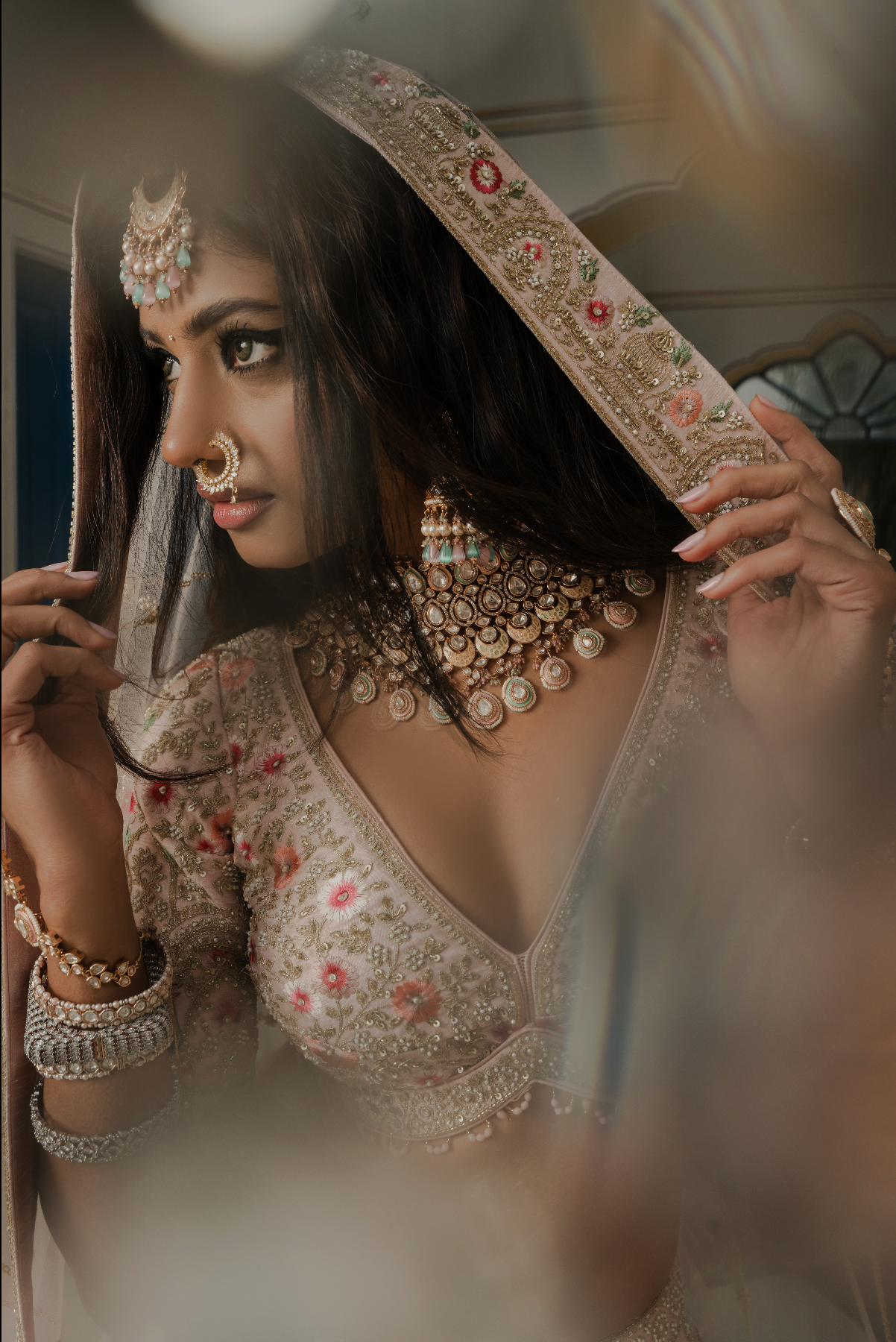 The lehenga features a timeless umbrella silhouette that flows effortlessly with every step, while the pale pink net dupatta adds a soft contrast, intricately detailed with zari, resham, sequins, and dori embroidery along its borders.