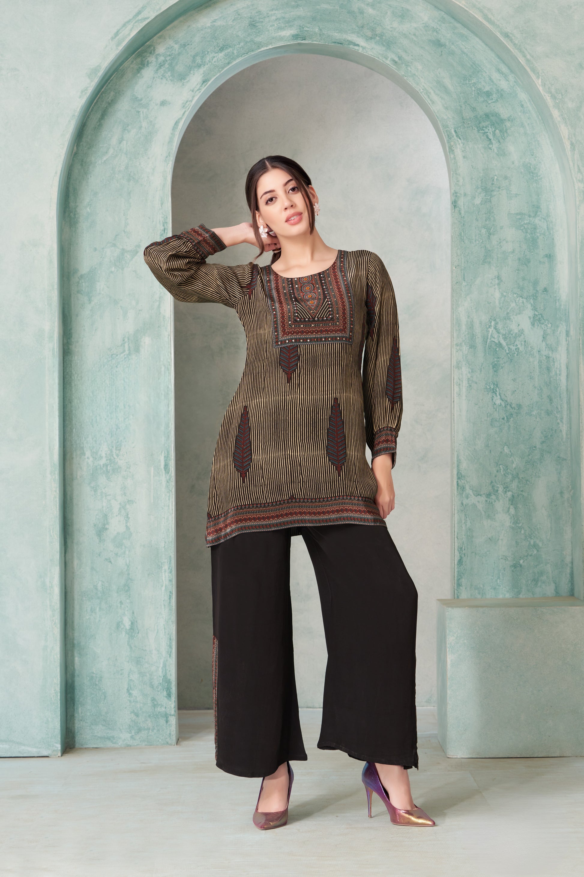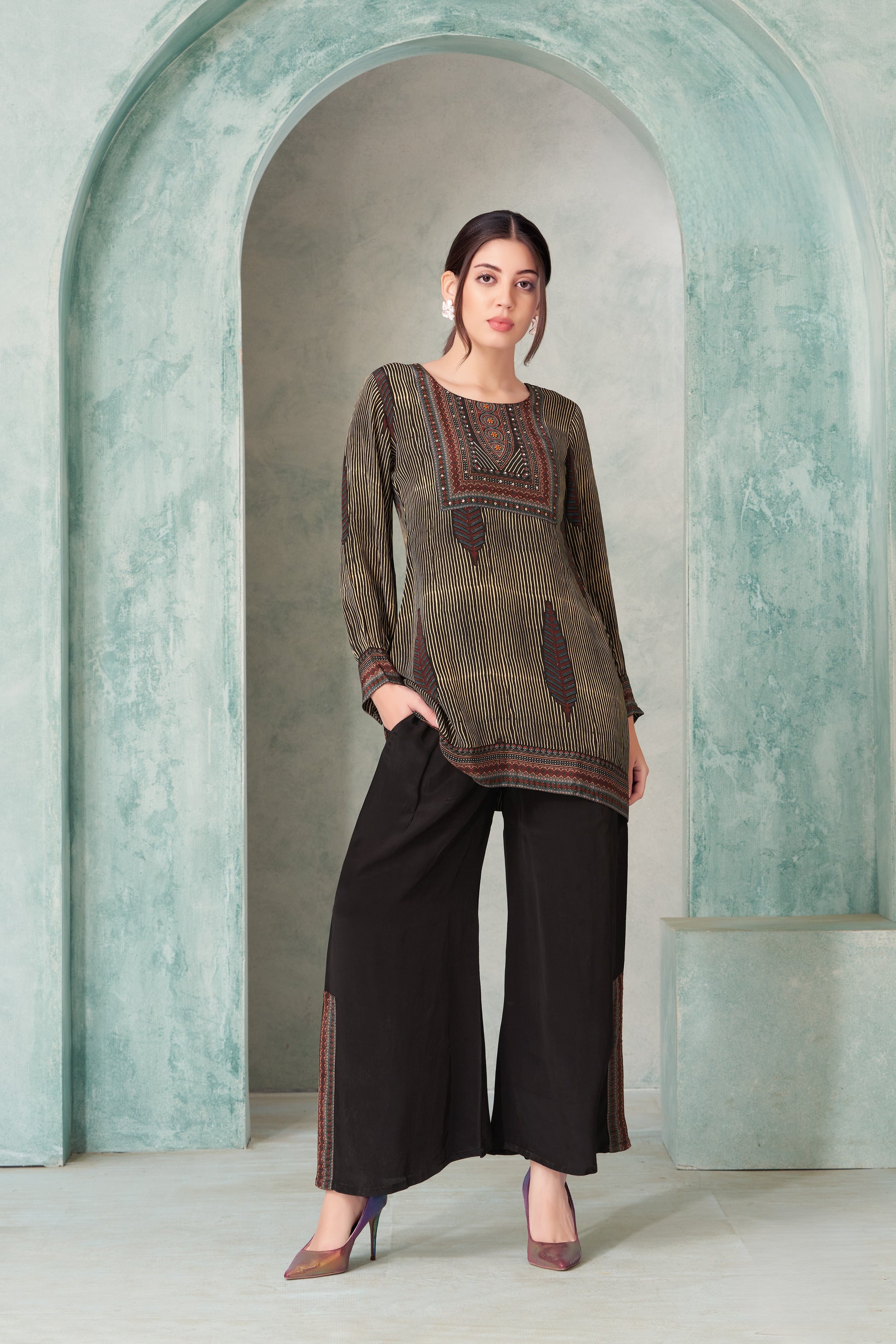 Brown Printed Kurti with Black Palazzo Set