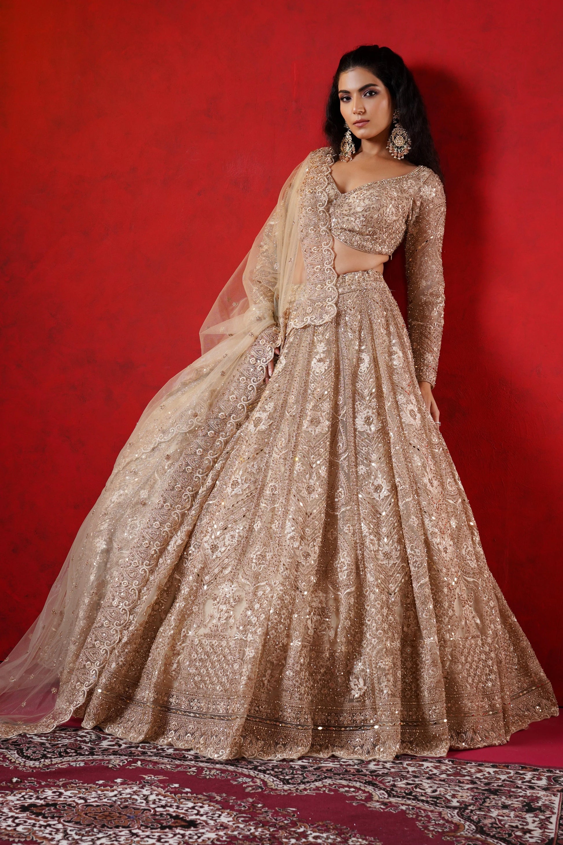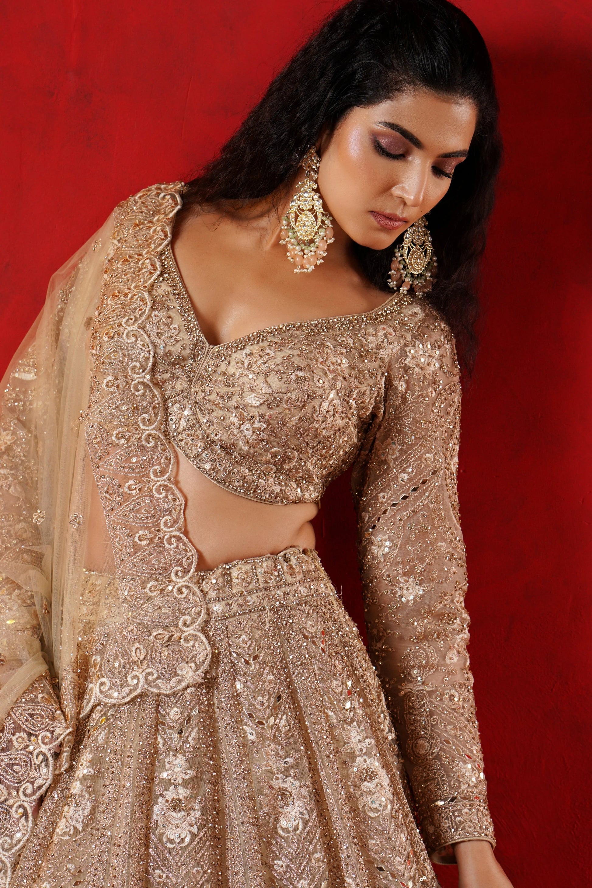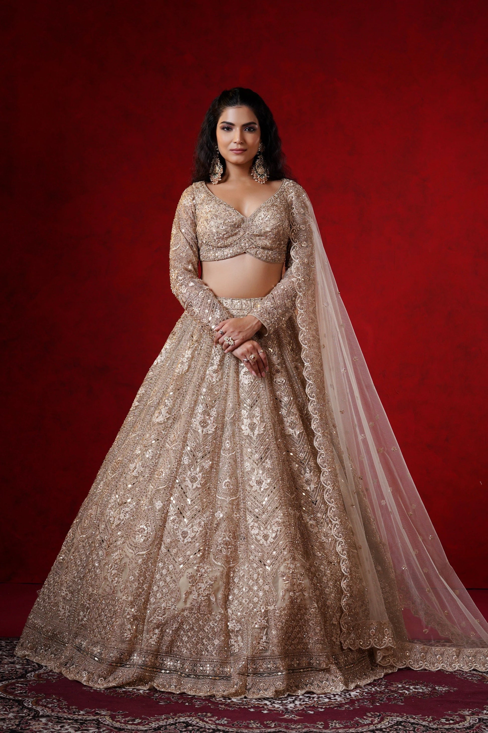 Step into a world of ethereal elegance with this stunning champagne lehenga crafted from premium net fabric. The skirt is adorned with intricate embroidery and sequins in floral and geometric motifs, creating a regal texture that glimmers with every movement. A subtle champagne tone adds sophistication, making it perfect for grand celebrations or bridal occasions.