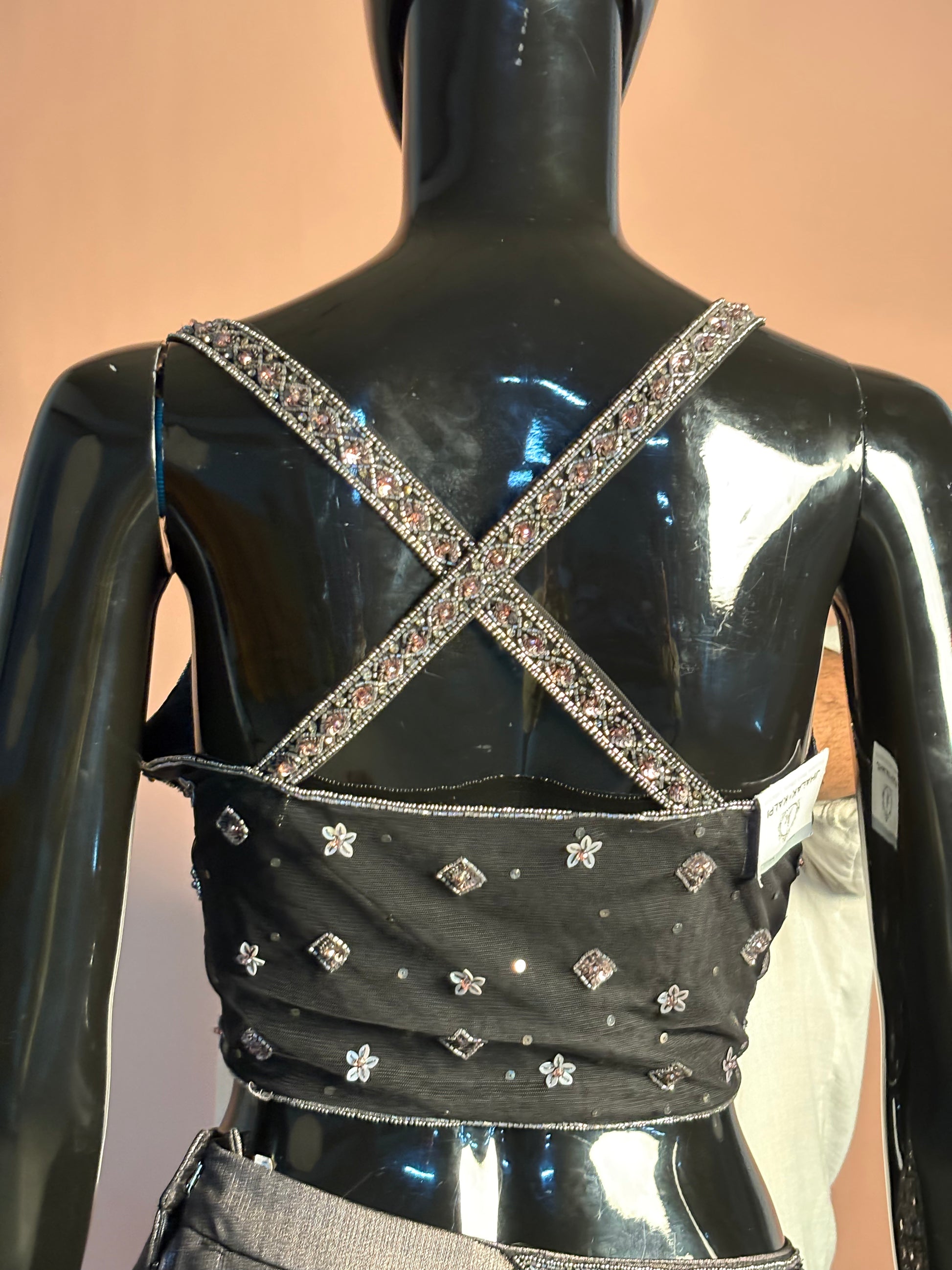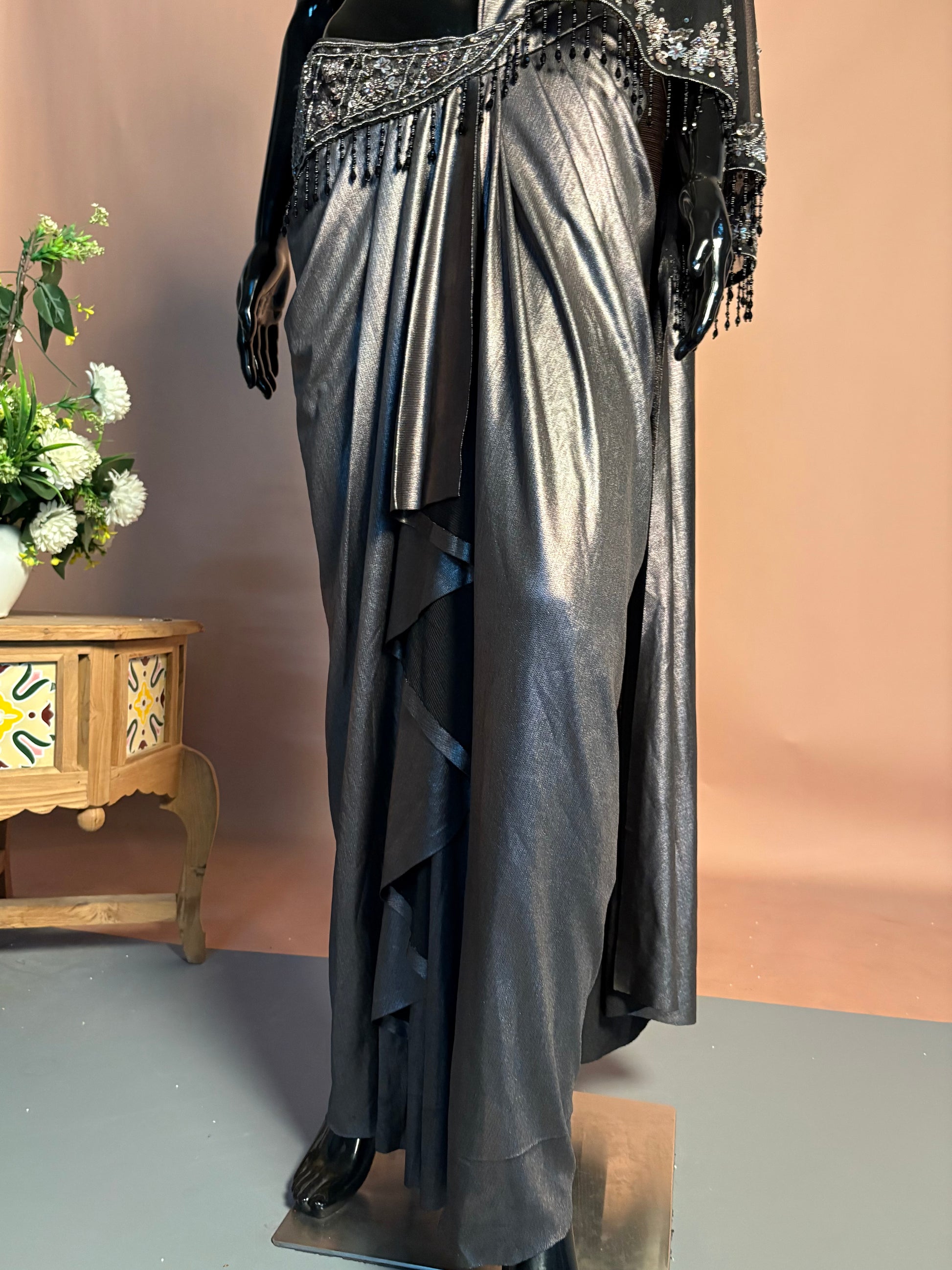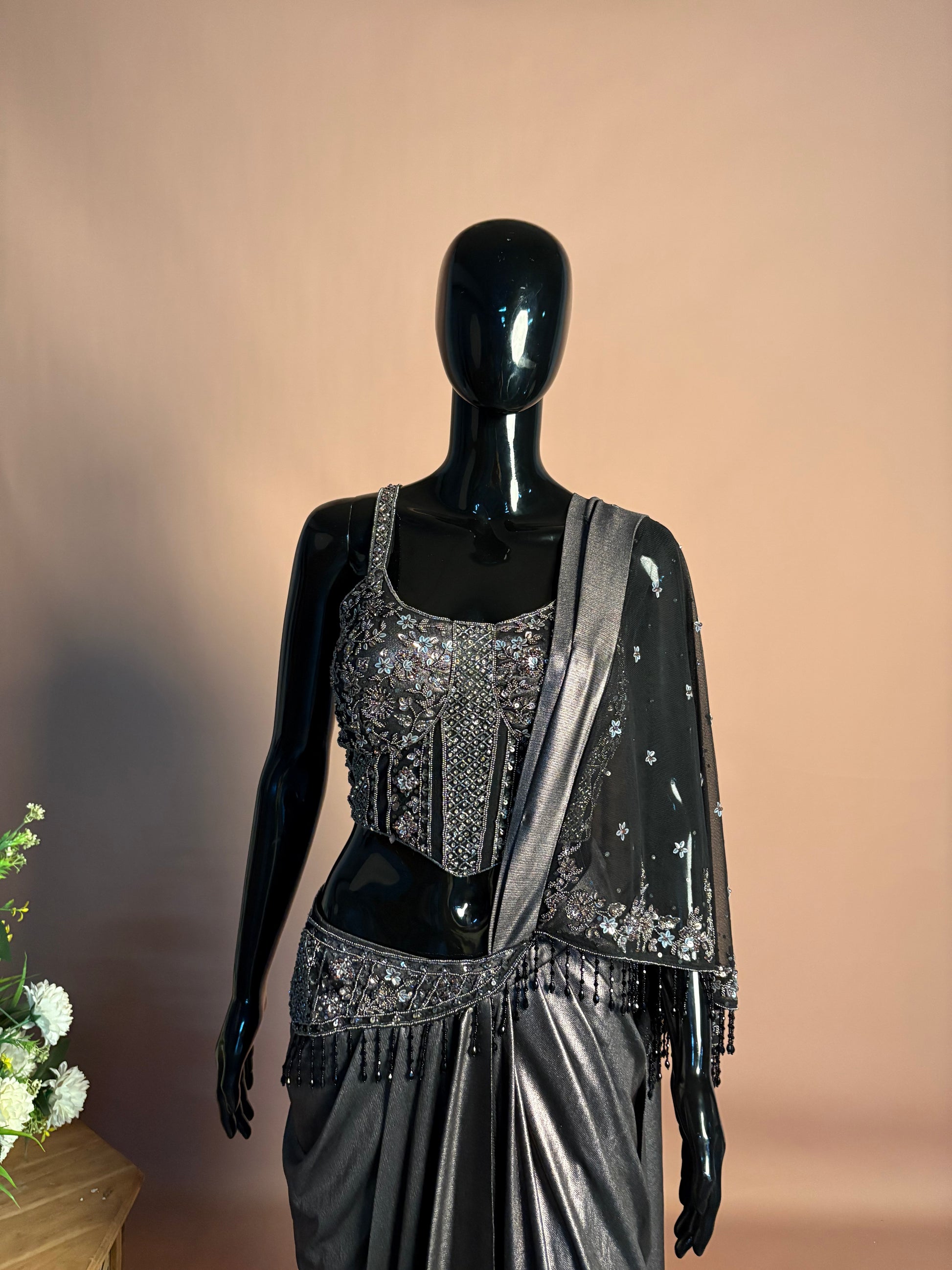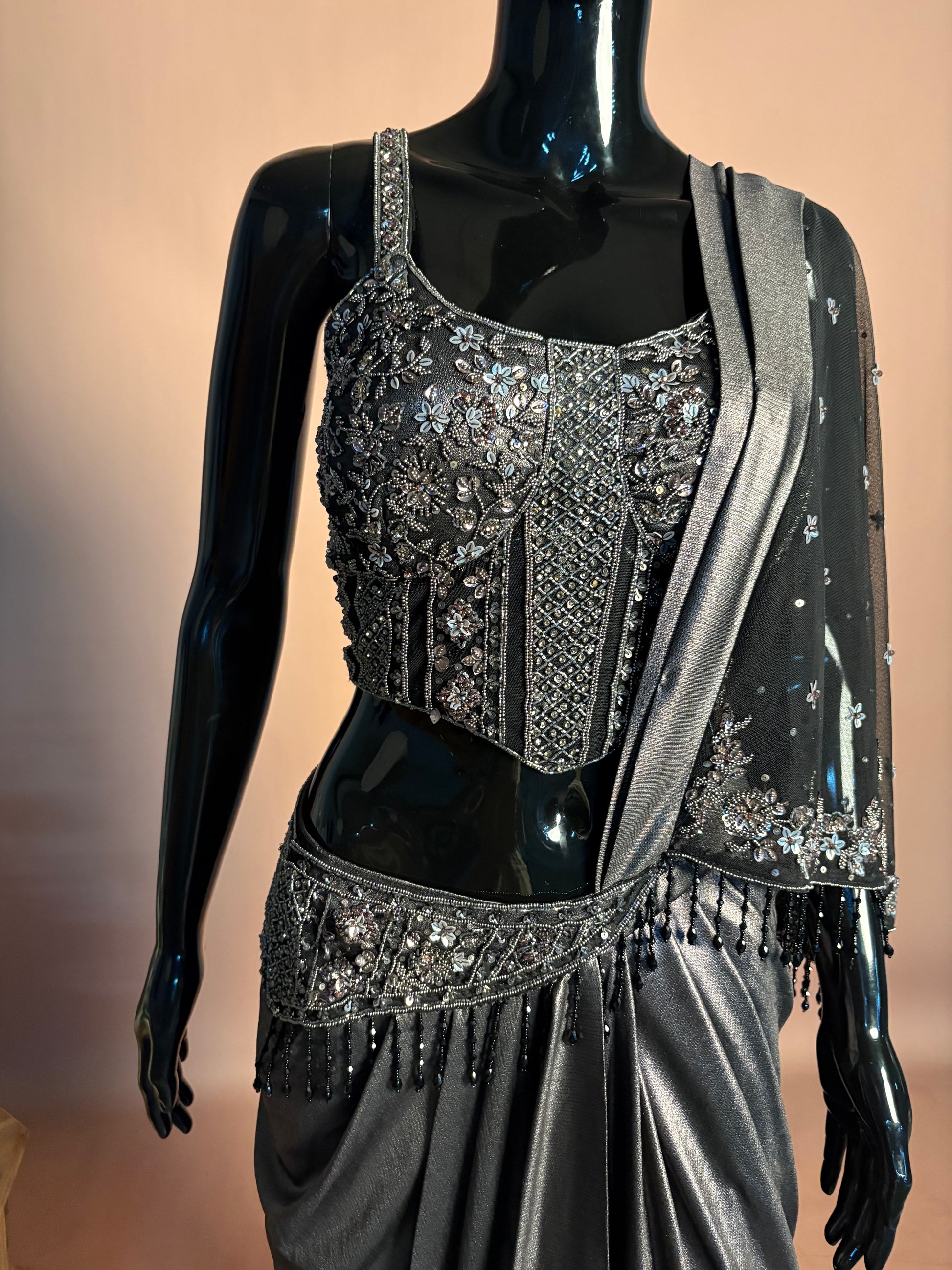 Charcoal Black Draped Indo-Western Saree Gown with Hand Embroidered Corset