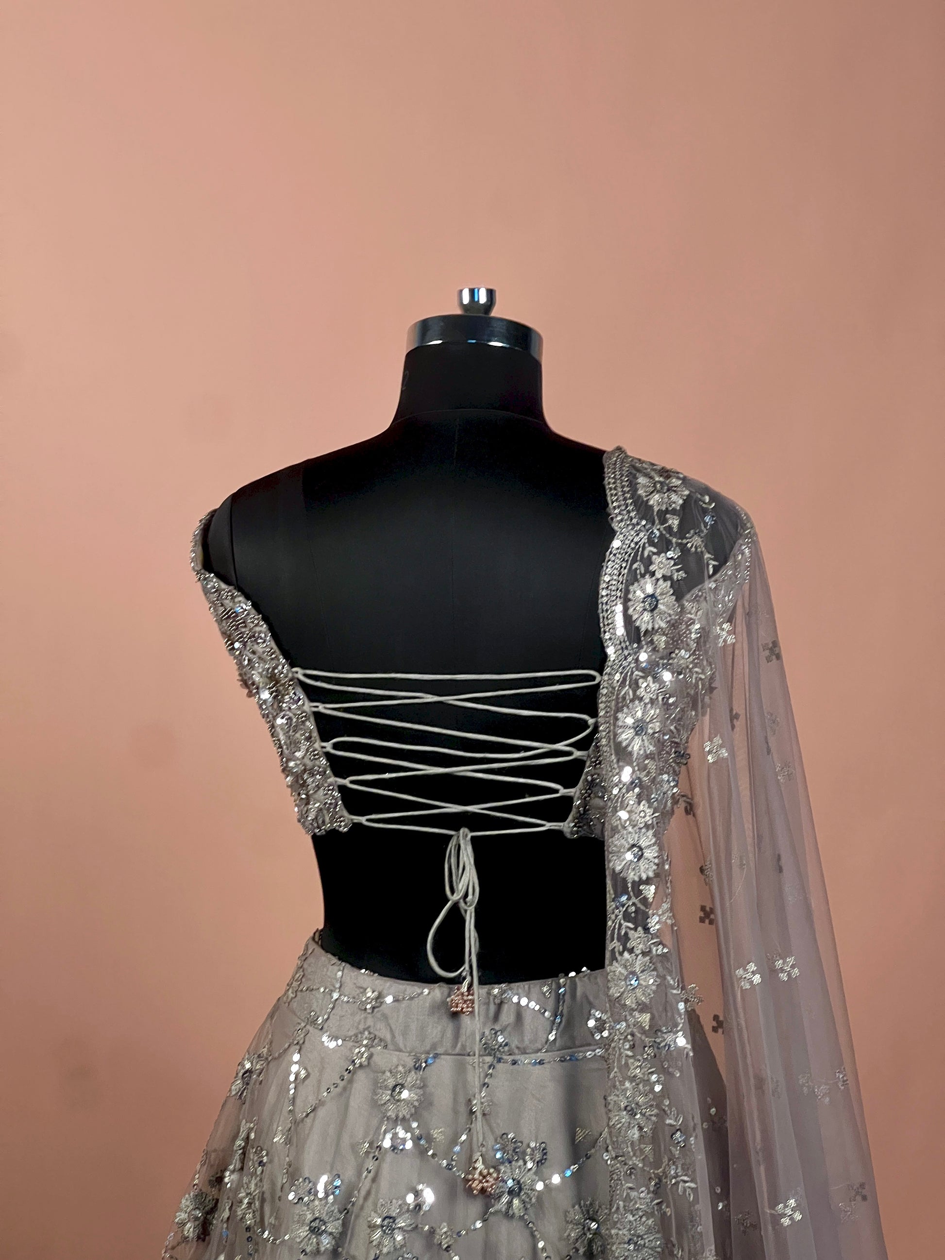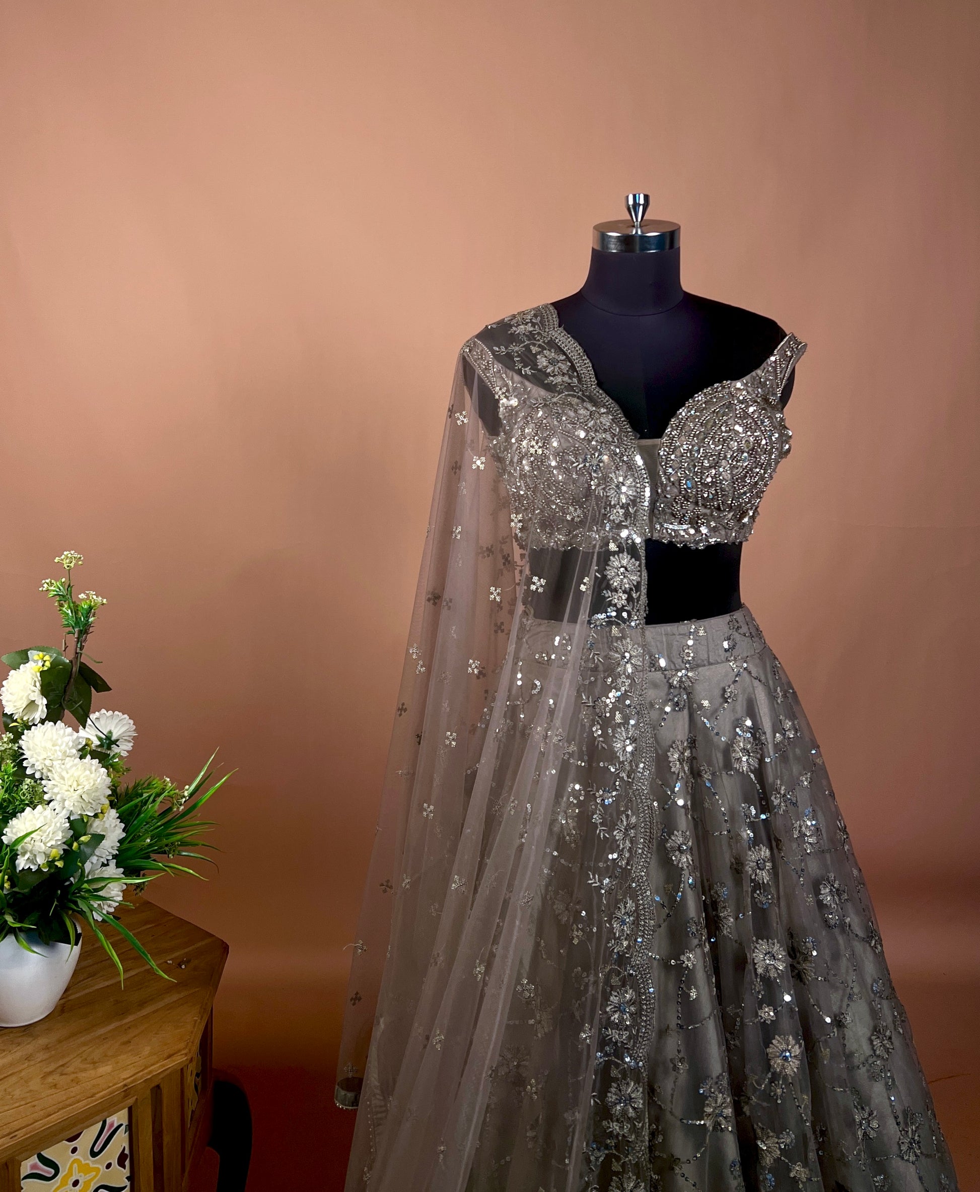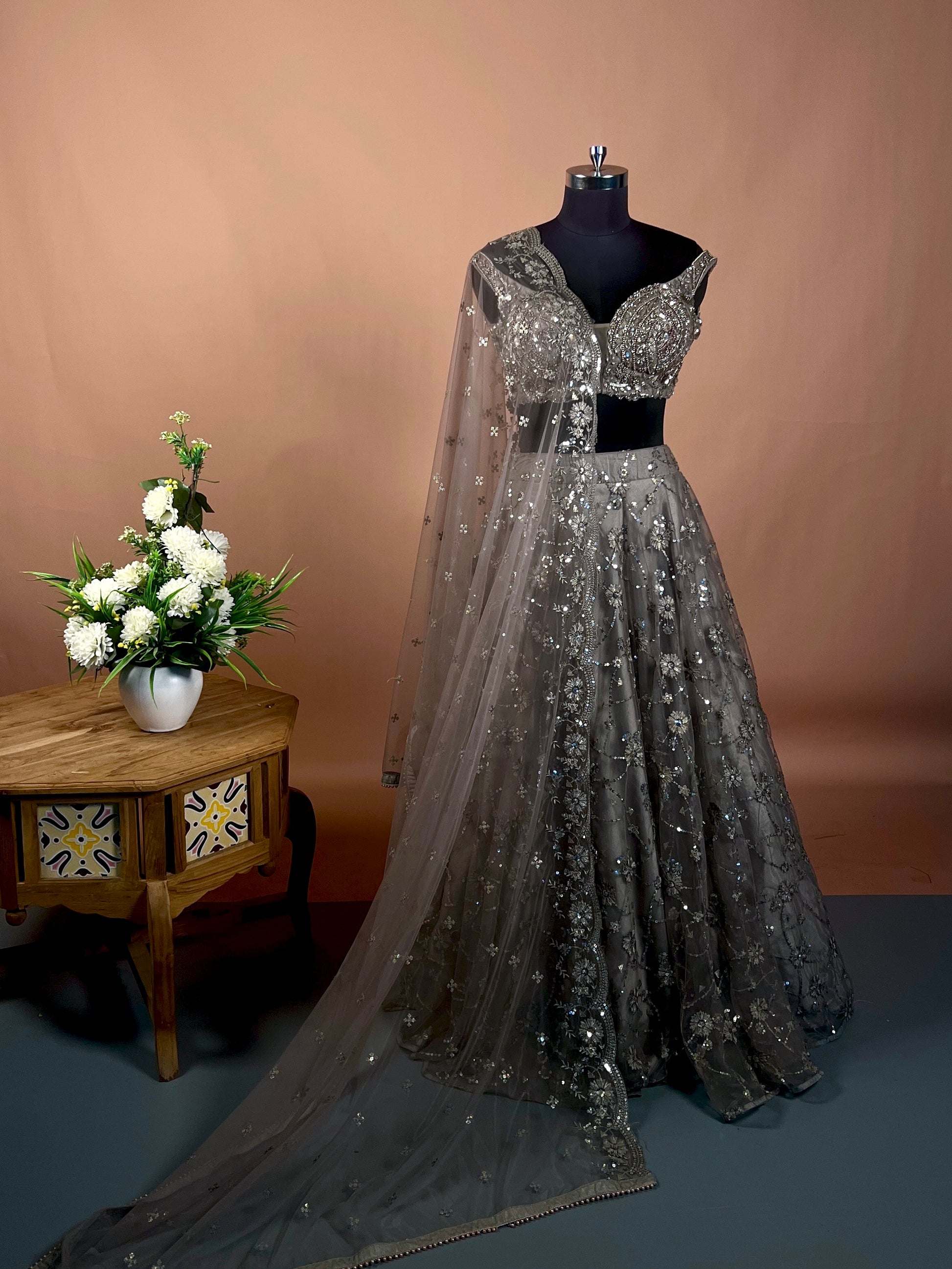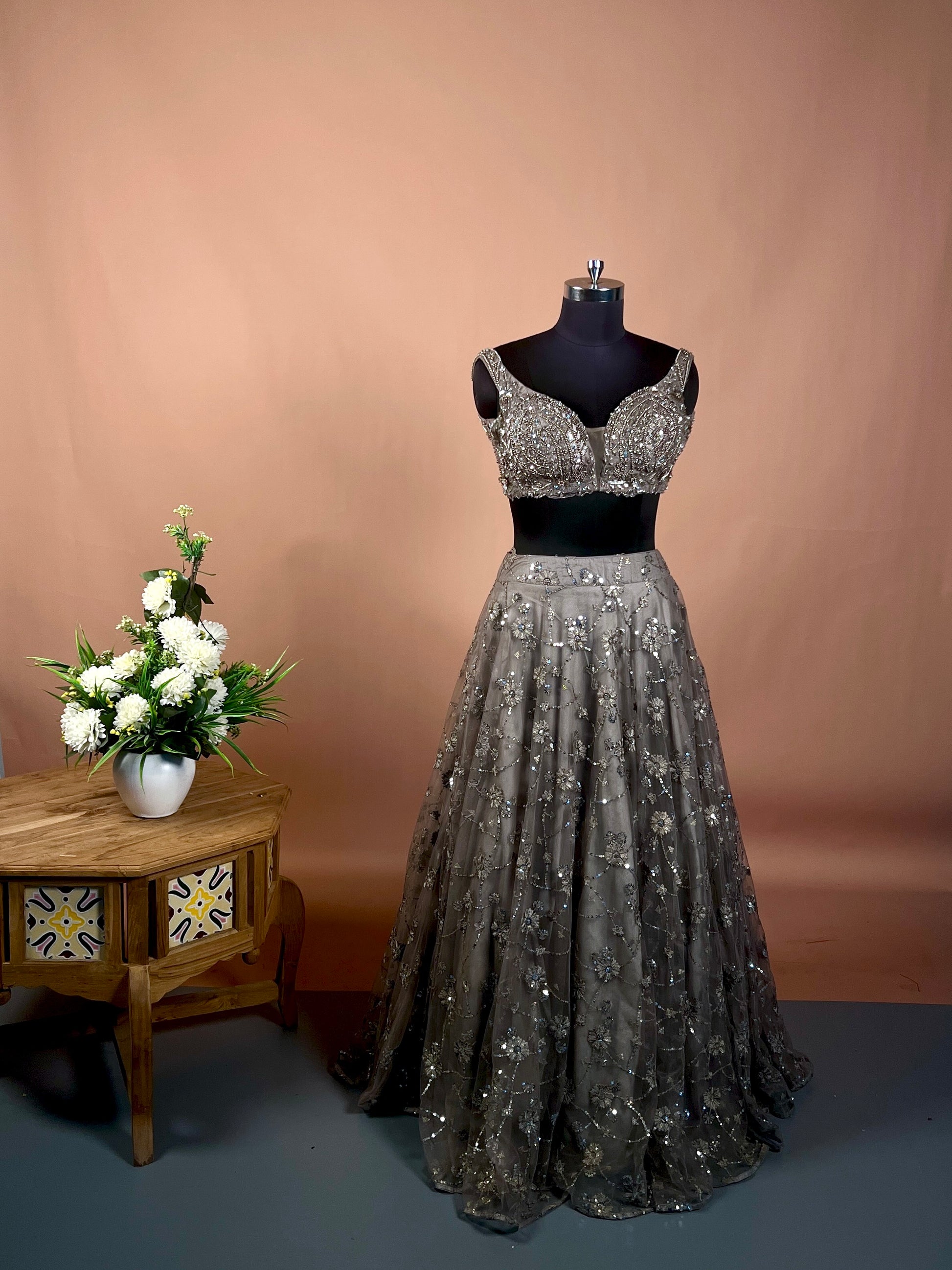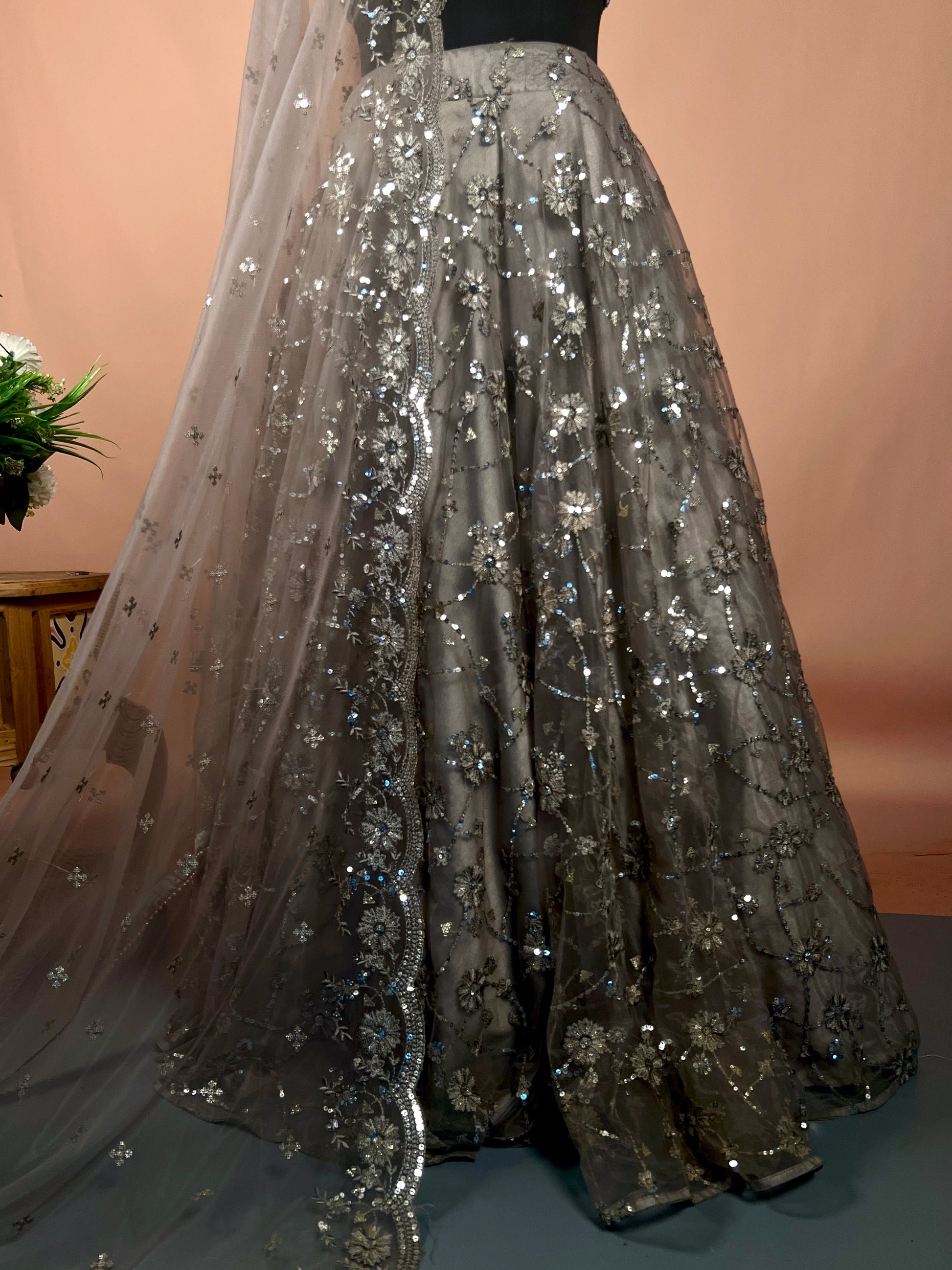 Charcoal Grey Sequin Embellished Net Lehenga Set