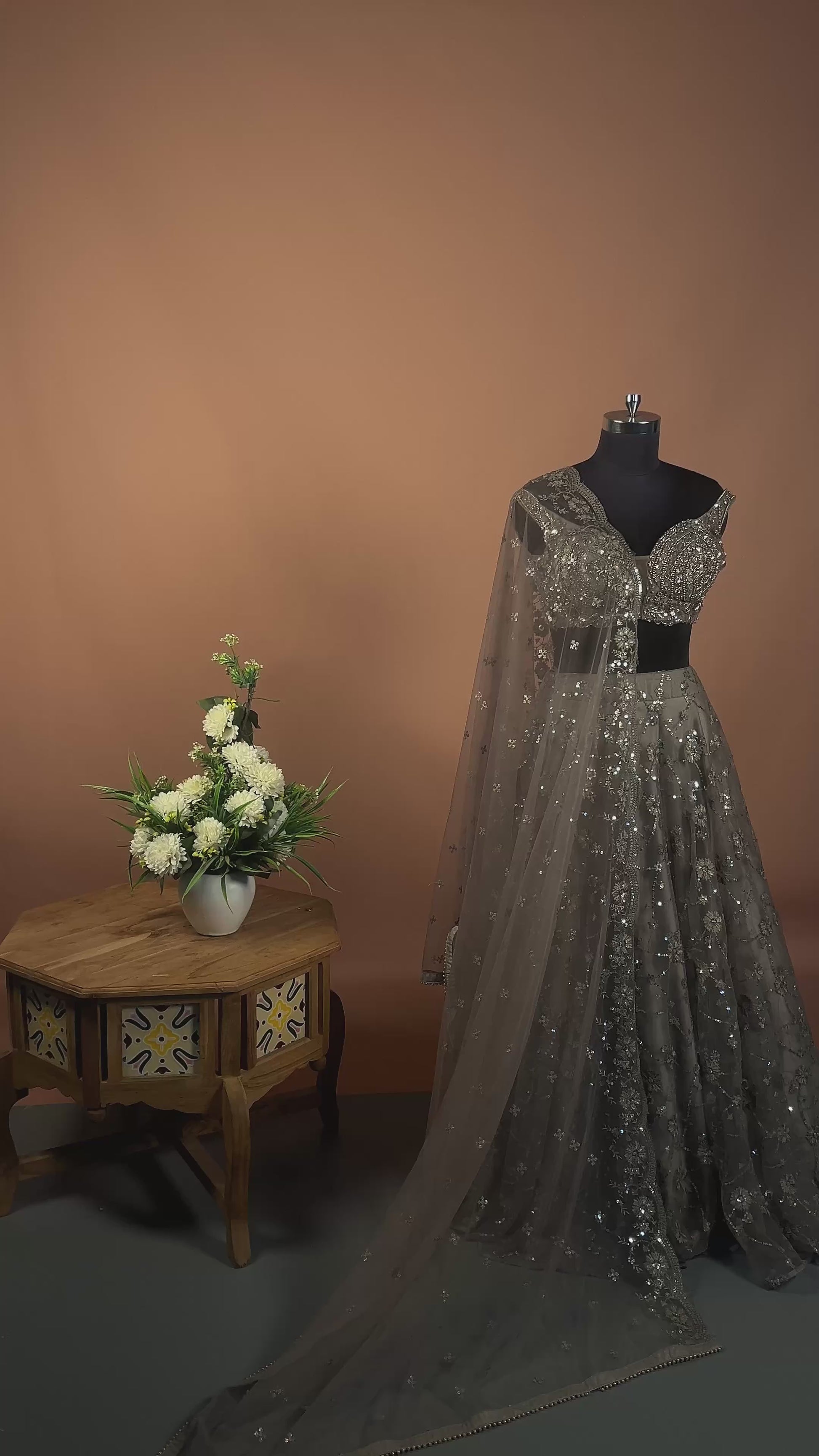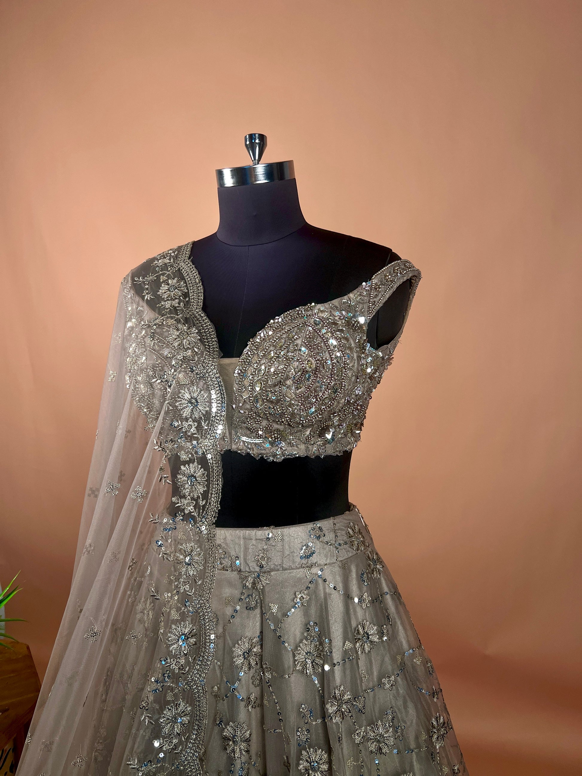 Make a bold and graceful statement with this charcoal grey lehenga set, intricately crafted with glimmering sequin and thread embroidery. The blouse features a structured sweetheart neckline with detailed embellishments, enhancing its modern appeal. The flowing lehenga skirt boasts floral and vine-inspired embroidery with scattered sequins that sparkle with every step. Completing the look is a soft net dupatta with all-over buti work and a finely embroidered border, offering sheer elegance and movement. Perfect for receptions, cocktail parties, or evening weddings, this outfit embodies regal charm with contemporary sophistication.