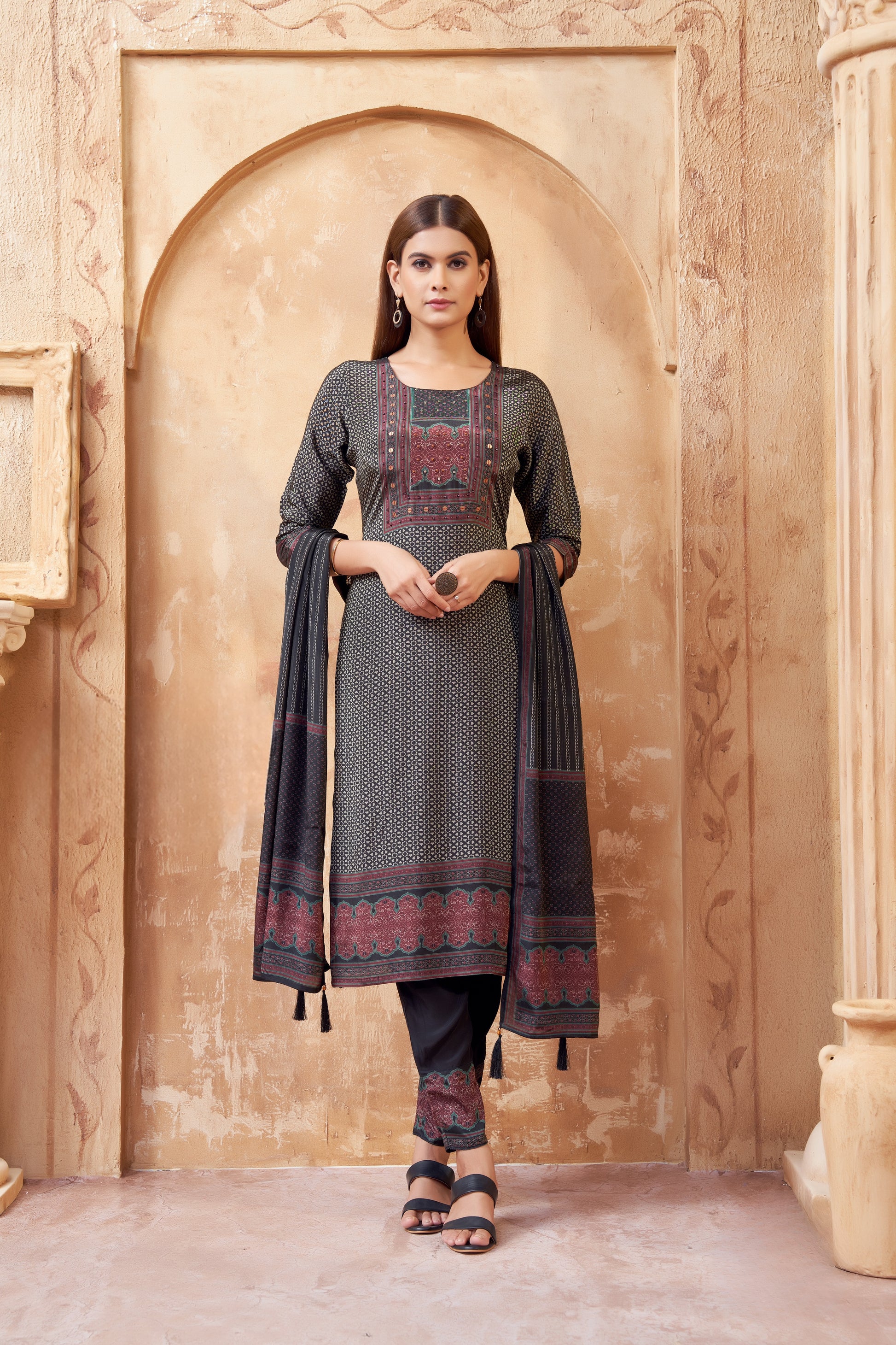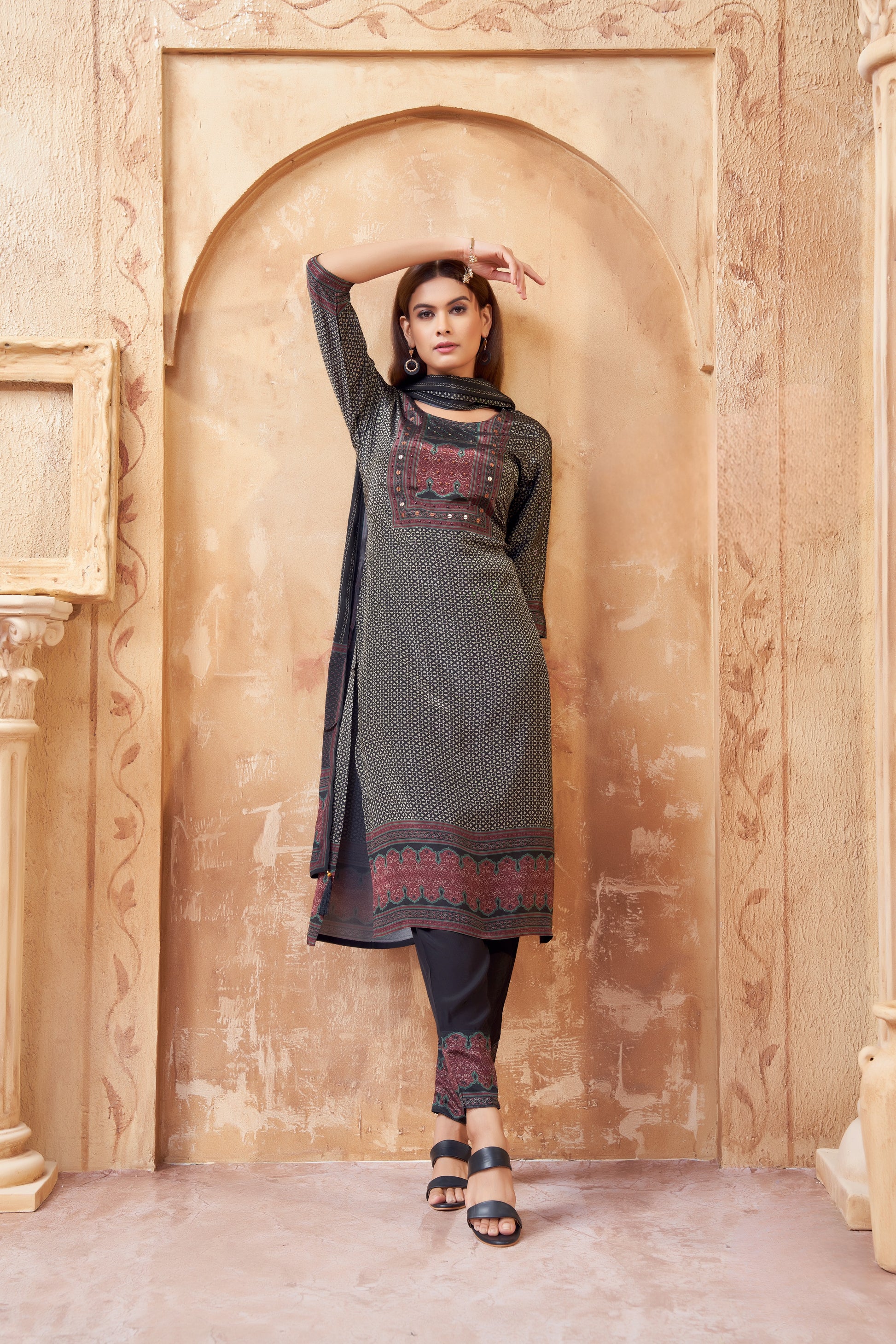 Classic Black Printed Cotton Suit with Maroon & Teal Accents
