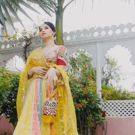 Experience the vibrant colors and bold stripes of our Color Burst Lehengas. Available in yellow, green, and red, these traditional Indian skirts come with a matching yellow dupatta. Elevate your style and stand out with our colorful and eye-catching lehengas.