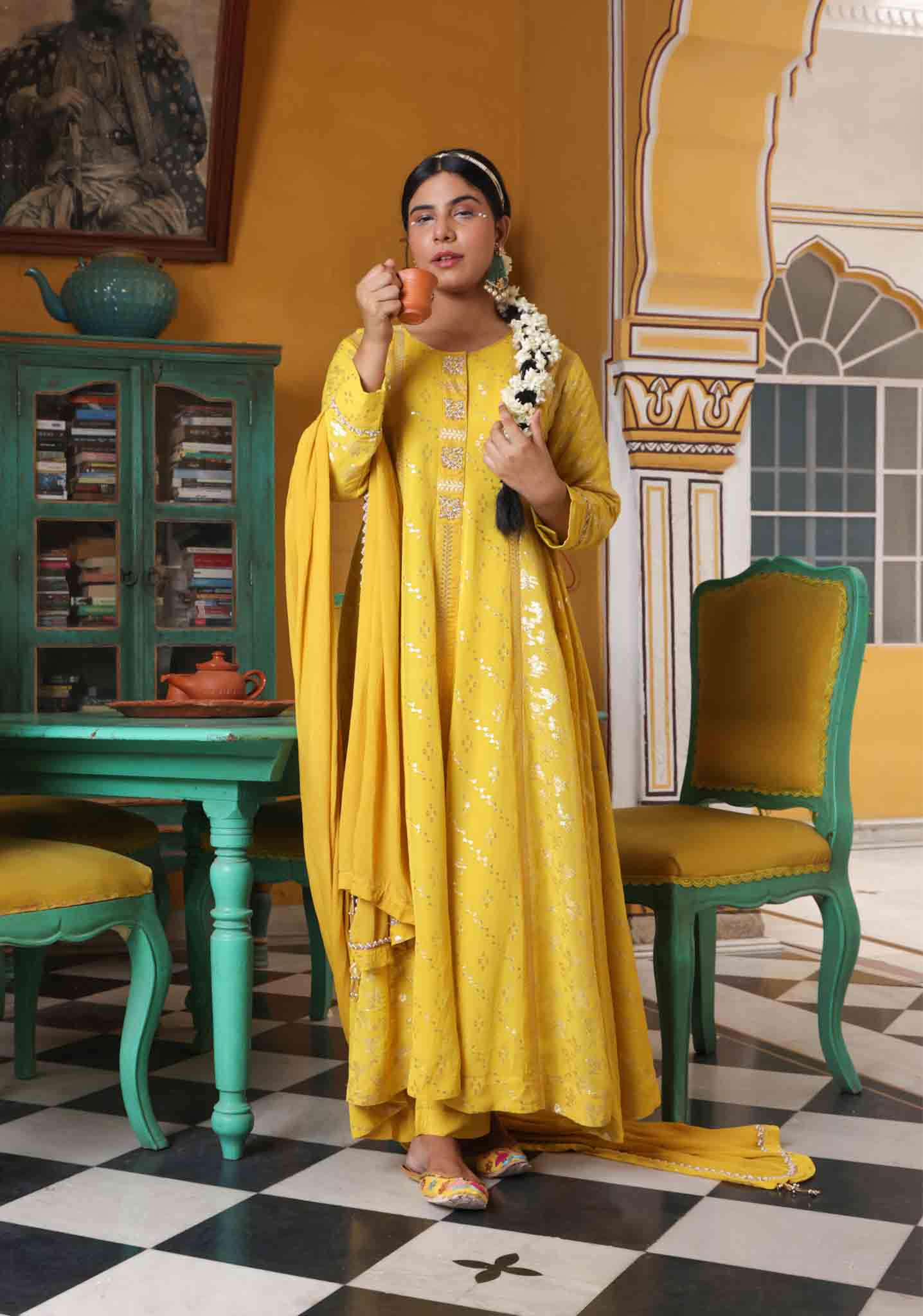 Lemon Yellow Jacquard Anarkali Kurta Set