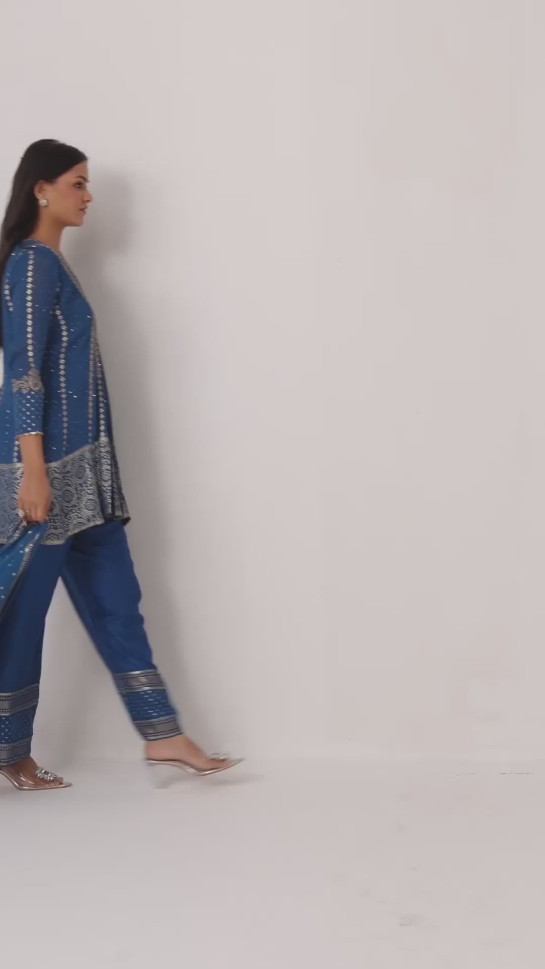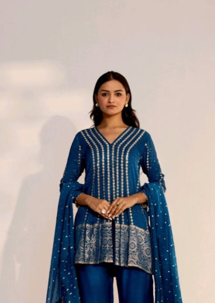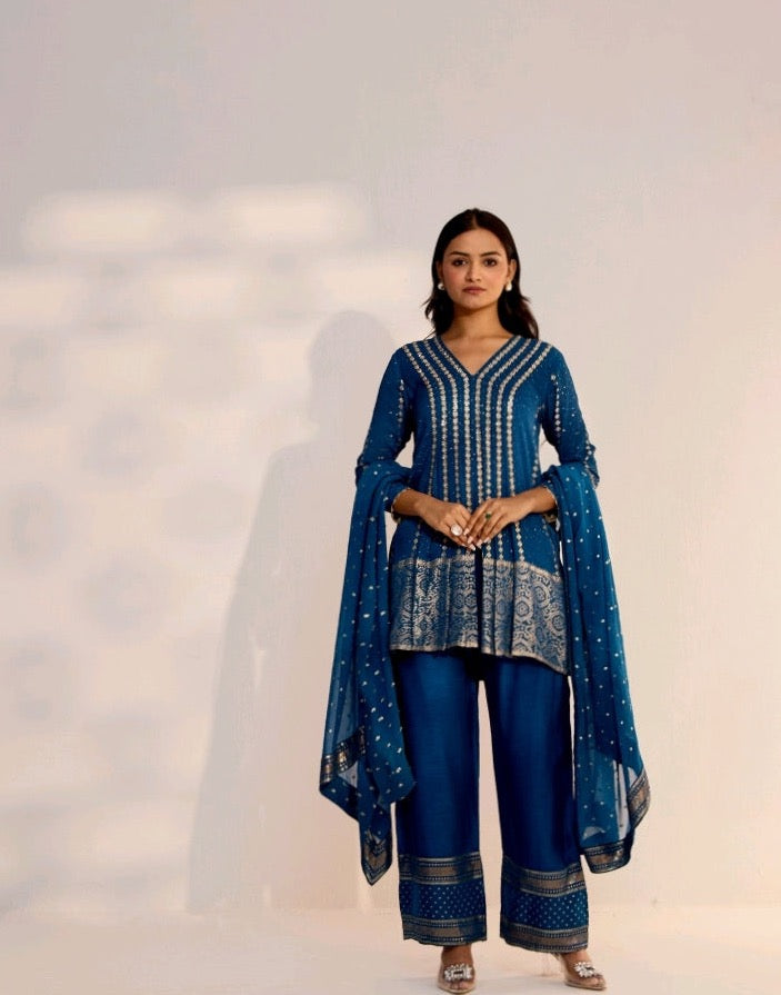 A dark blue & golden work kurti pant set for women is a blend of luxury and elegance. Adorned with attractive golden lines, it exudes sophistication. Paired with a floral dupatta, this ensemble offers a striking contrast, perfect for adding a touch of glamour to any occasion with its captivating design and rich color palette.