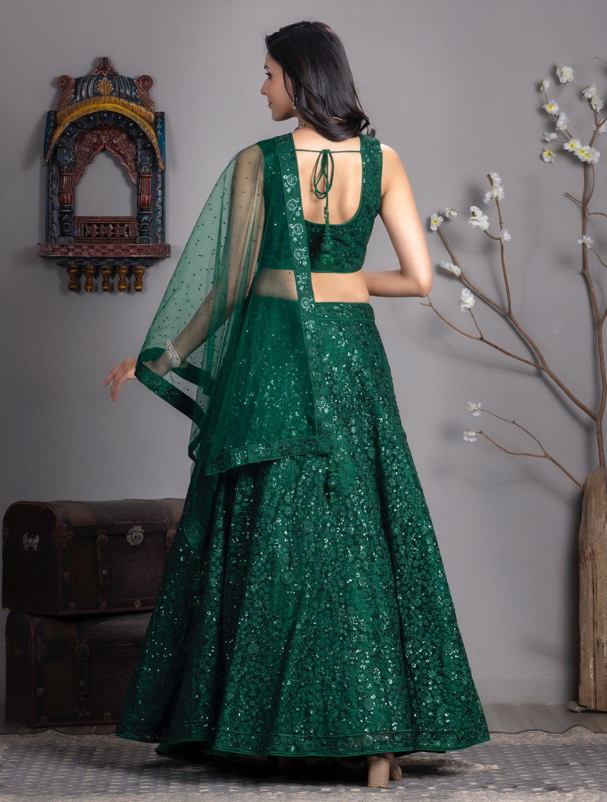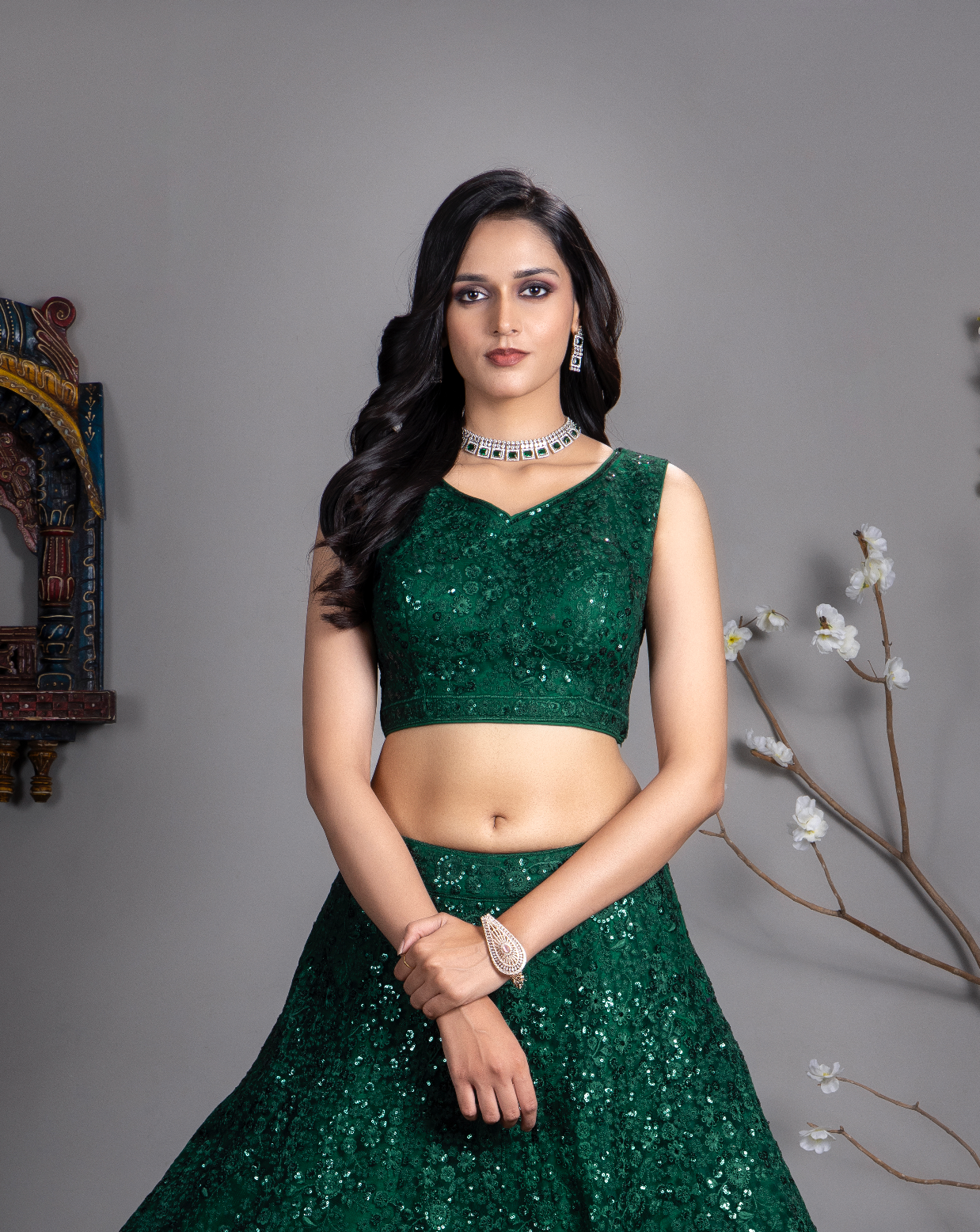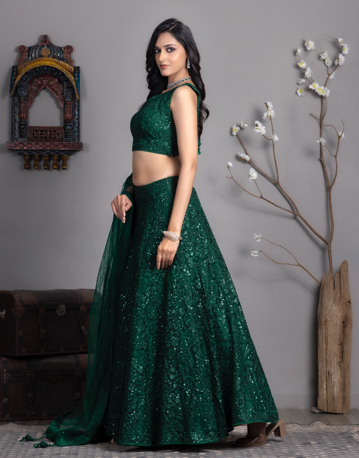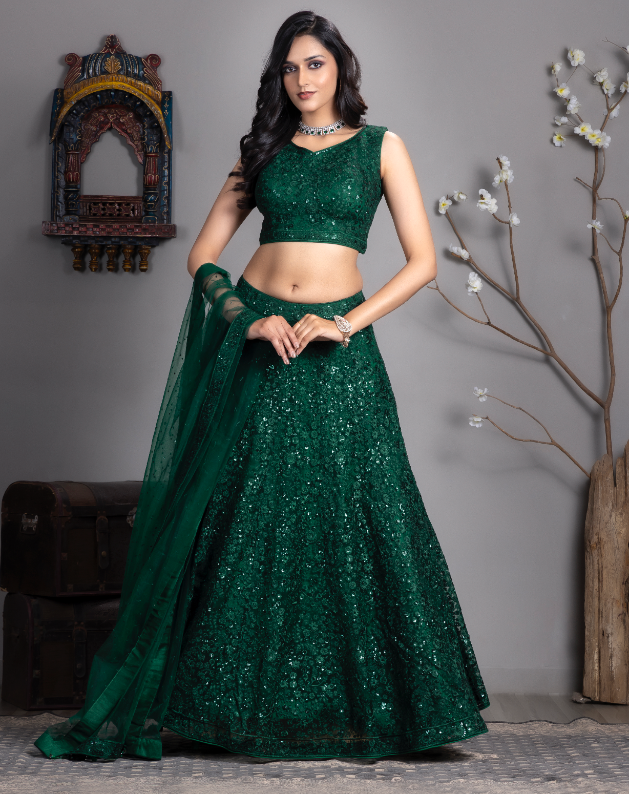 Get ready to shine with our Dark Green Embroidered Sequinned Lehnga Choli. This stunning piece features intricate embroidery and sparkling sequins, creating a unique and eye-catching design. Perfect for special occasions, this choli will make you stand out with its elegant and playful style. Be the life of the party in this must-have garment!
