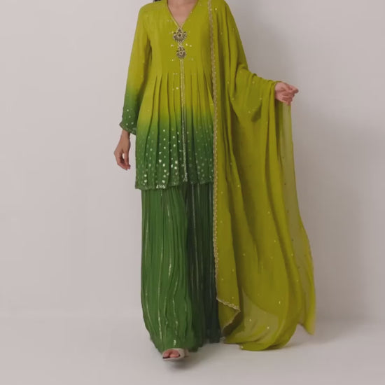 A dark and light green combined palazzo set for women offers a vibrant and dynamic look. With multi-colored elements enhancing its appeal, this ensemble exudes energy and style. Perfect for adding a playful touch to your wardrobe, it's ideal for various occasions where you want to stand out with a bold and cheerful statement.