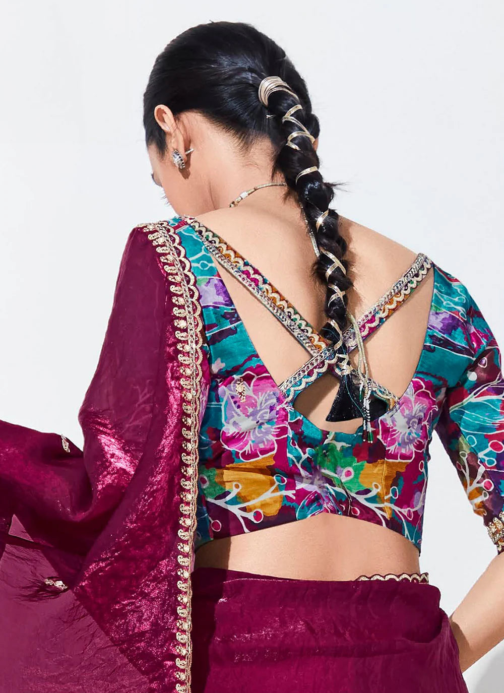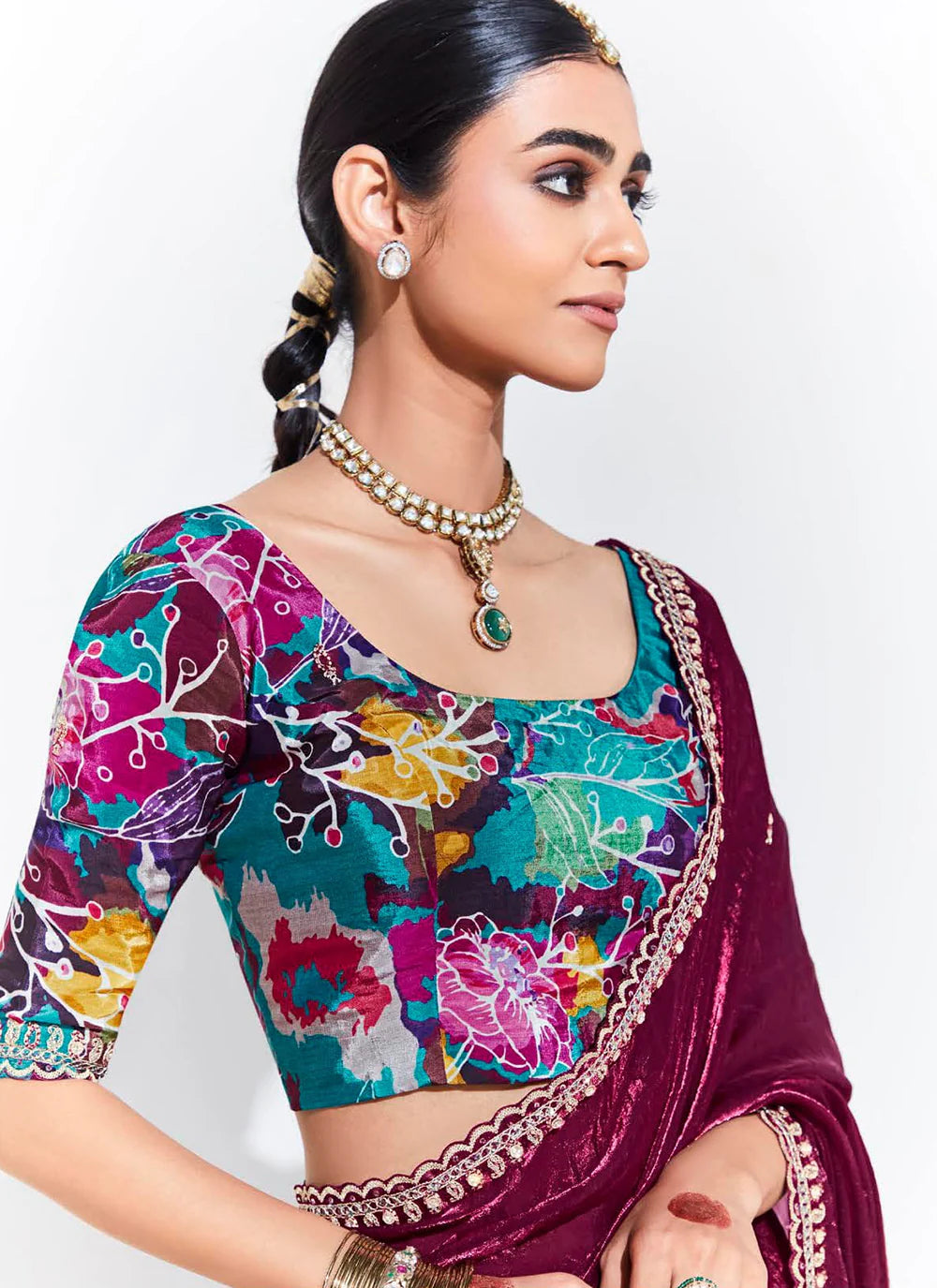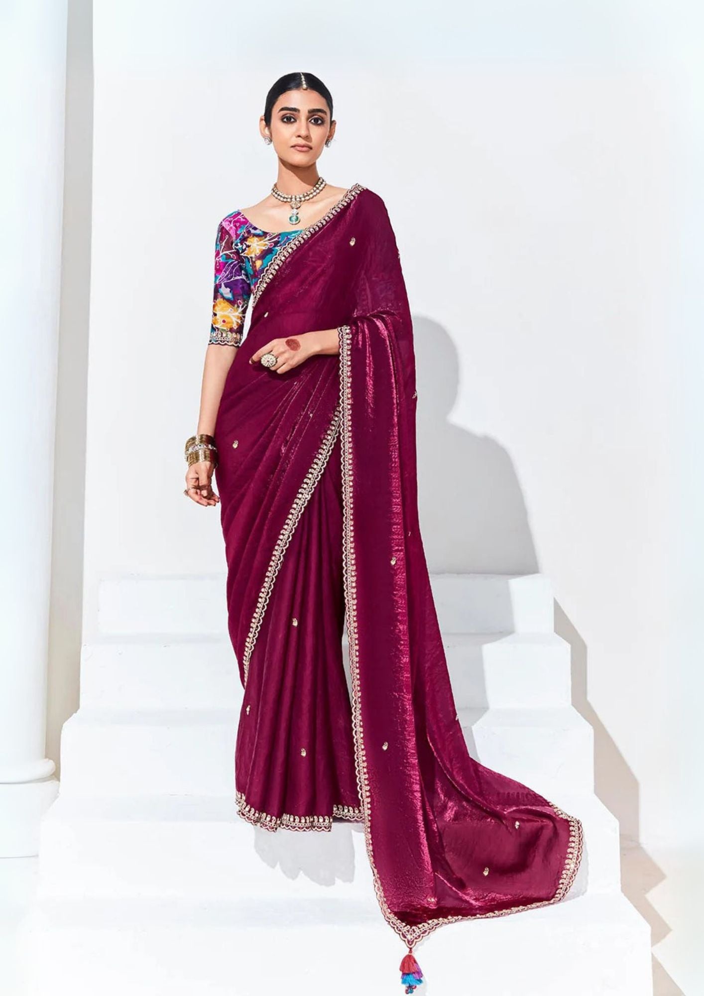 This stunning designer saree features intricate sequins and embroidery along the border, adding a touch of luxury and elegance to any reception. Made of high-quality organza fabric in a rich burgundy hue, it is the perfect choice for a sophisticated and exclusive event. Elevate your style with this exquisite designer saree.