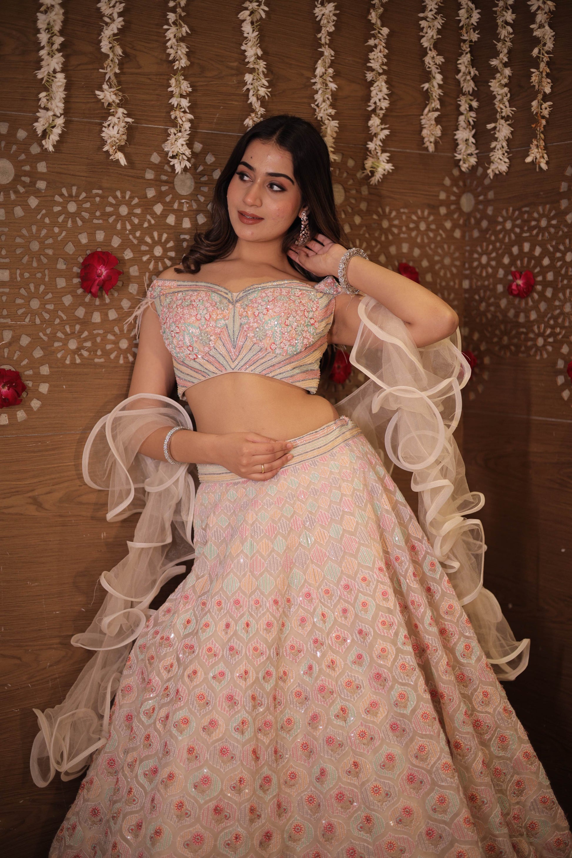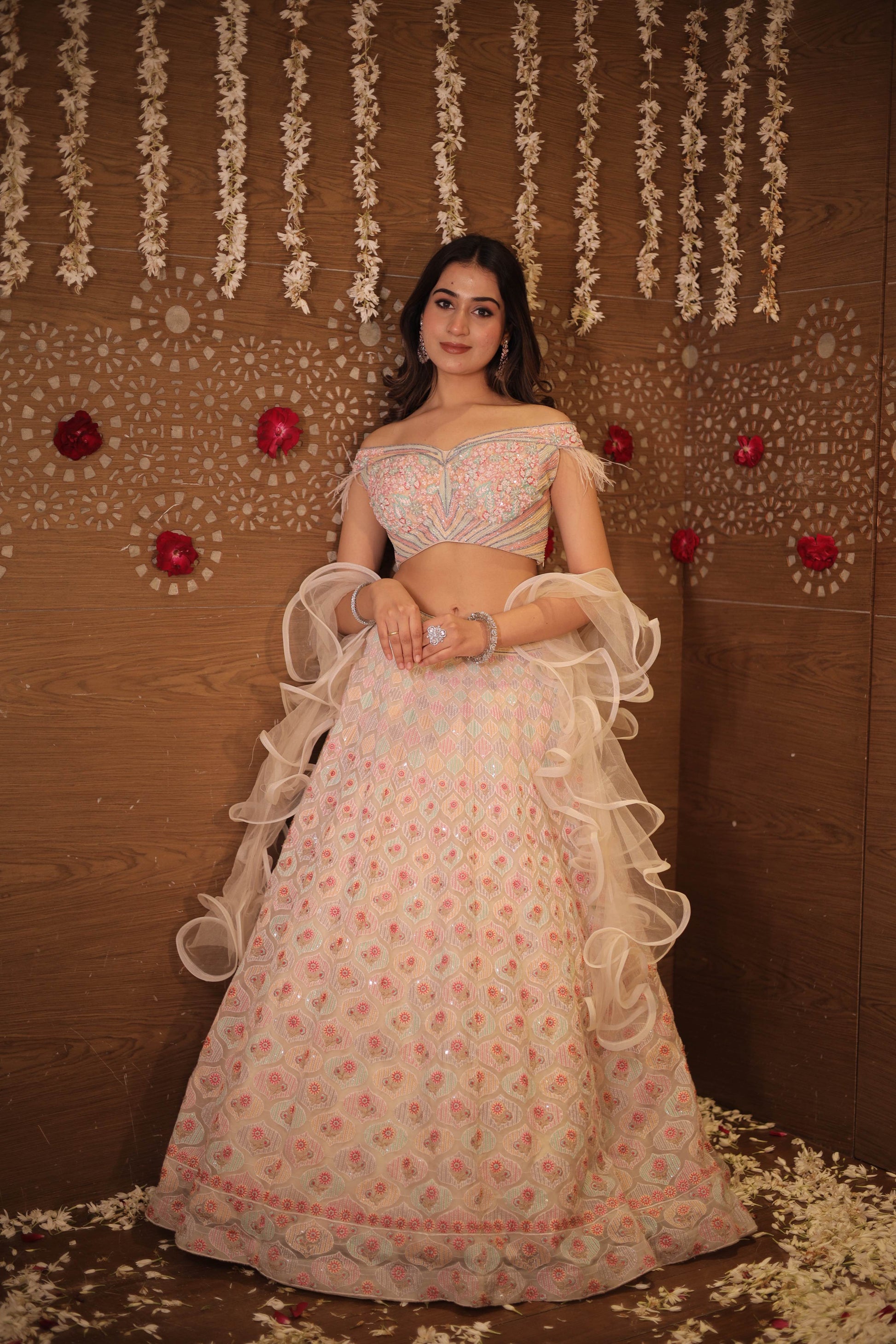 This is a beautiful off-the-shoulder top with delicate embroidery and sequins. The top is made of a sheer fabric that is perfect for a special occasion. The top is available in a variety of colors and is sure to make you feel confident and beautiful.