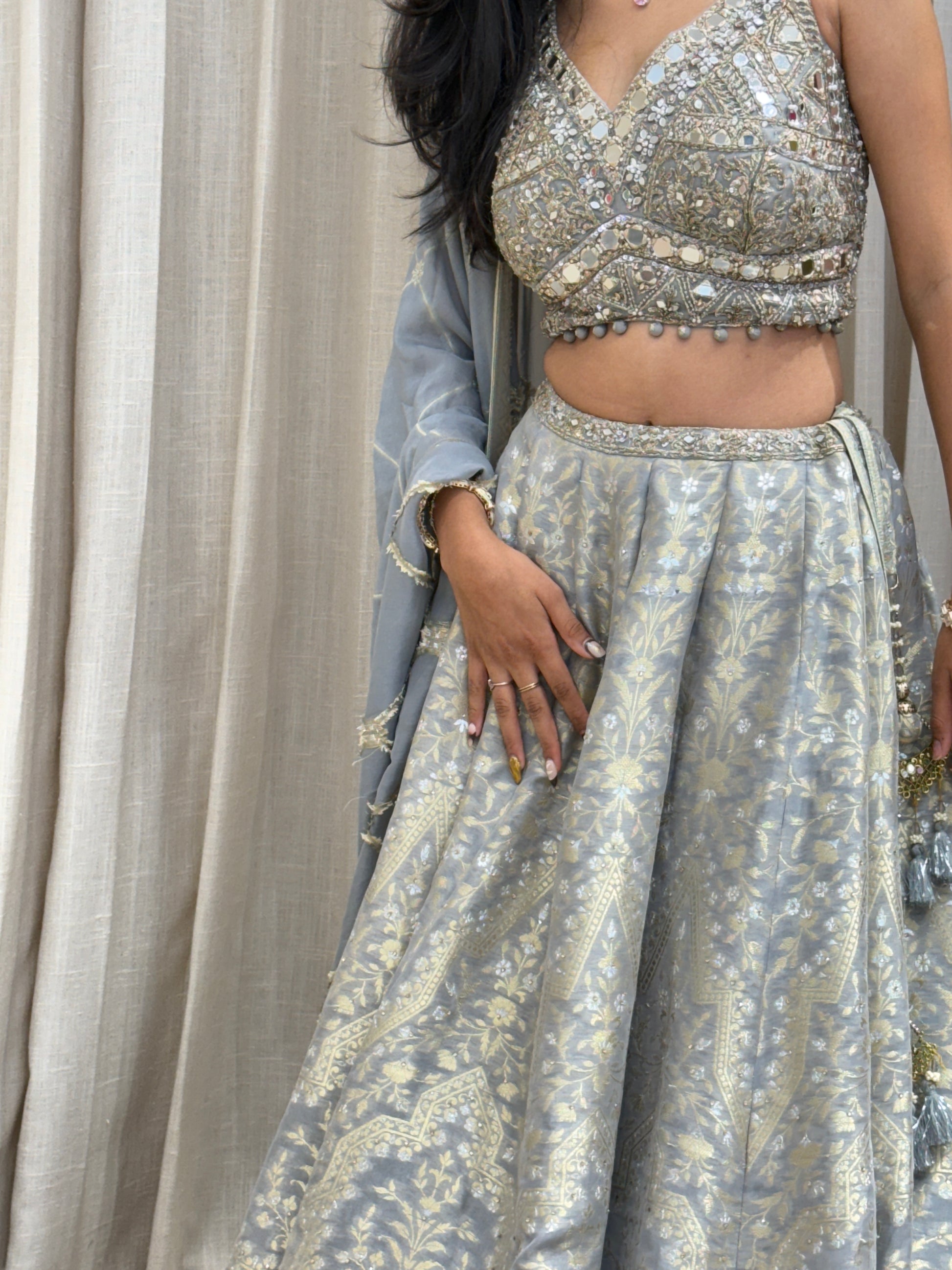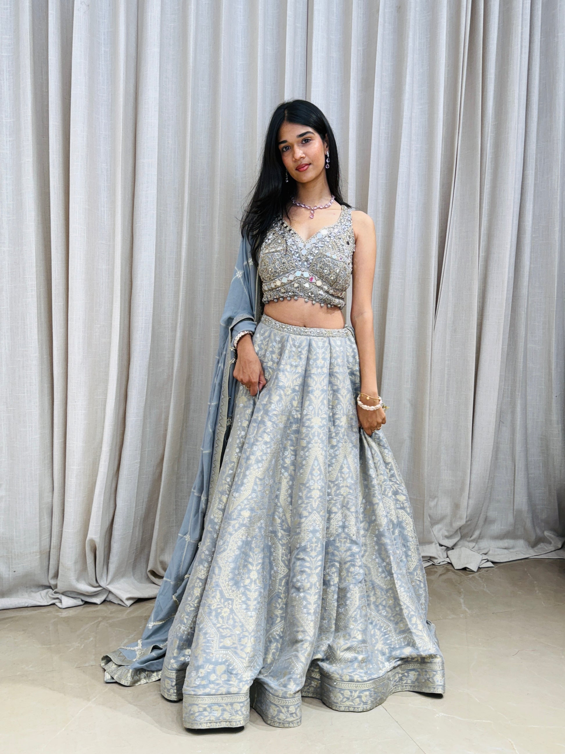Dusty Blue Embroidered Silk Lehenga Set with Mirror Work Blouse