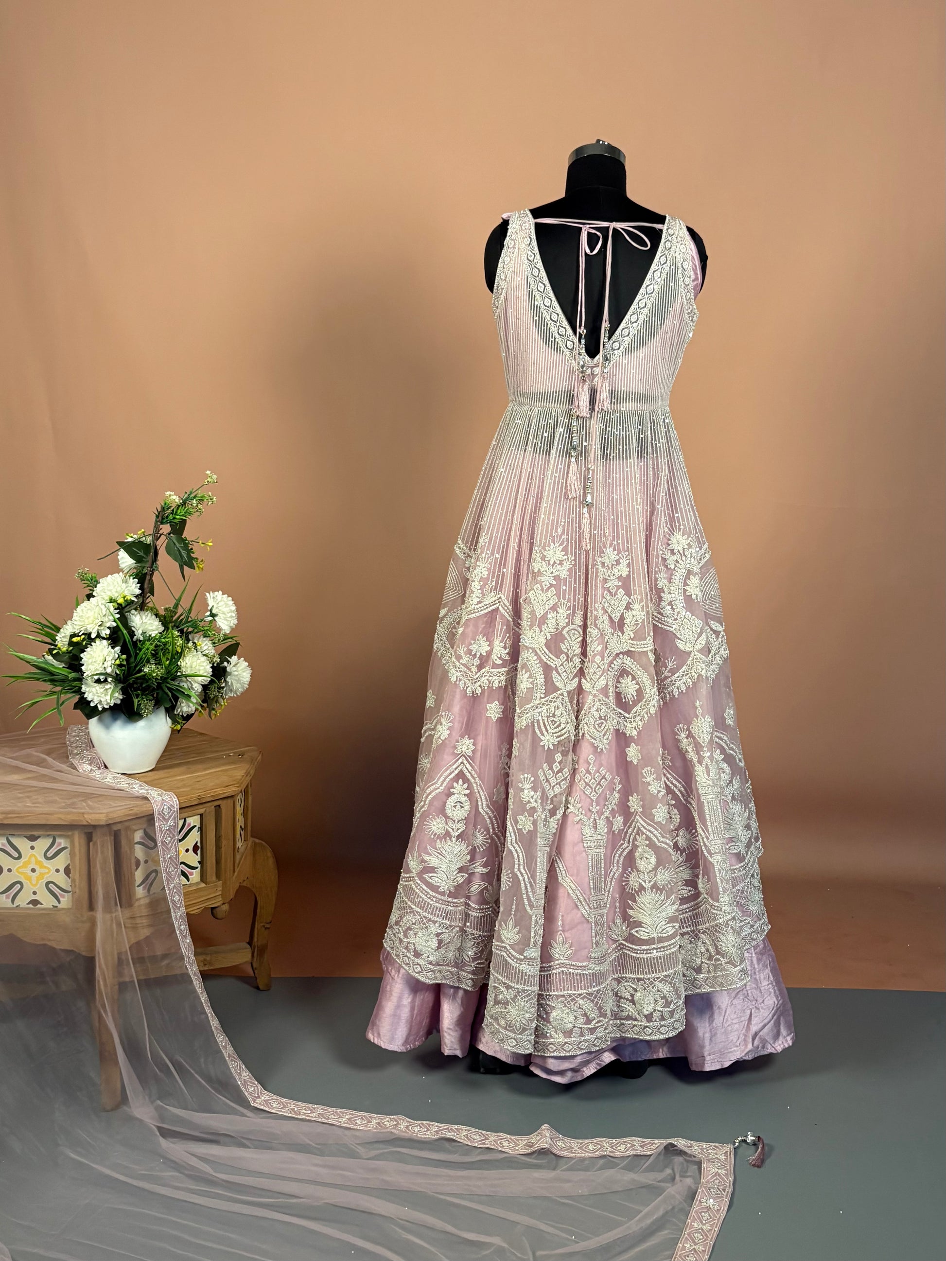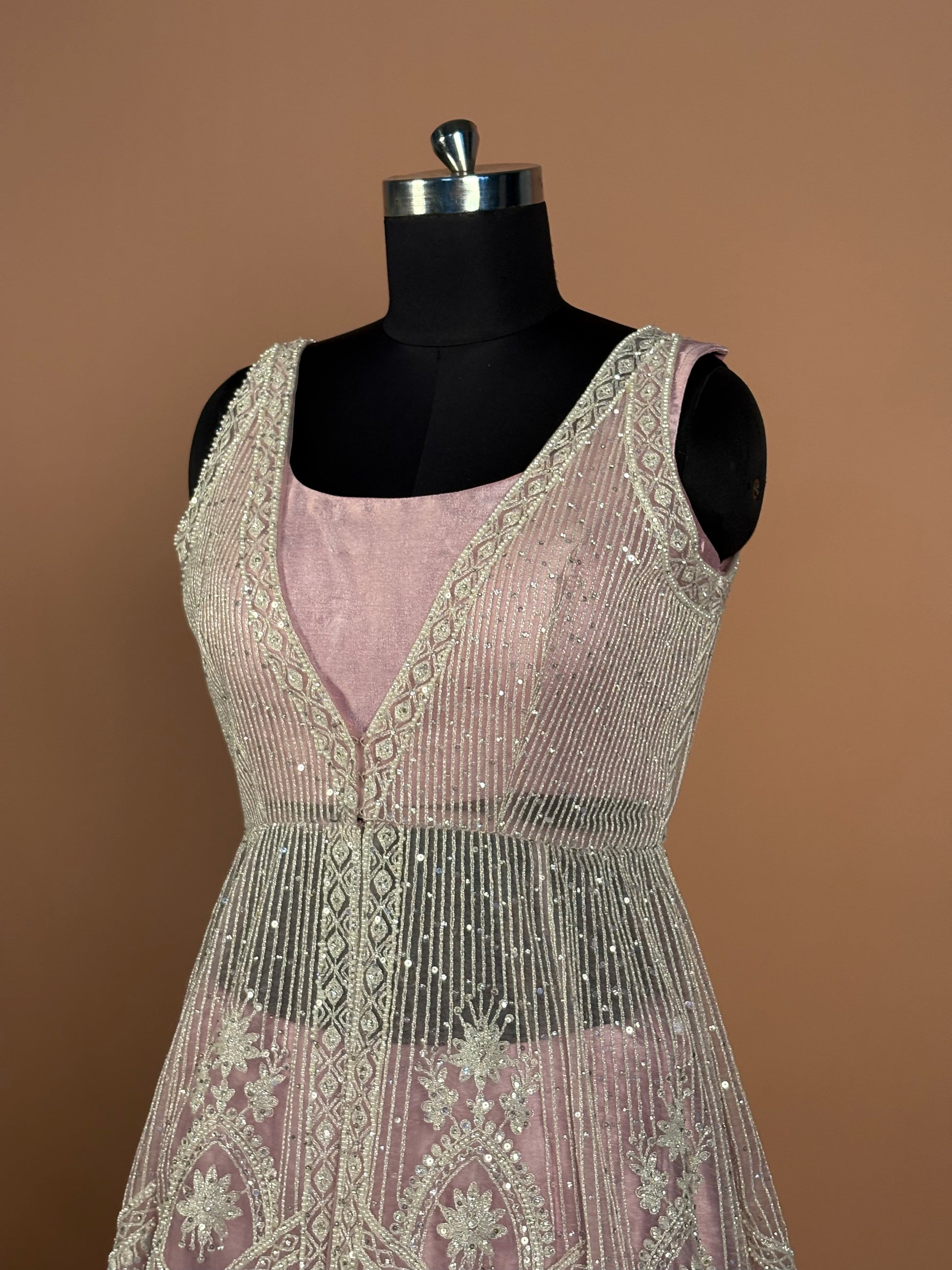 Dusty Mauve Layered Anarkali Set with Heavy Thread & Zari Embroidery