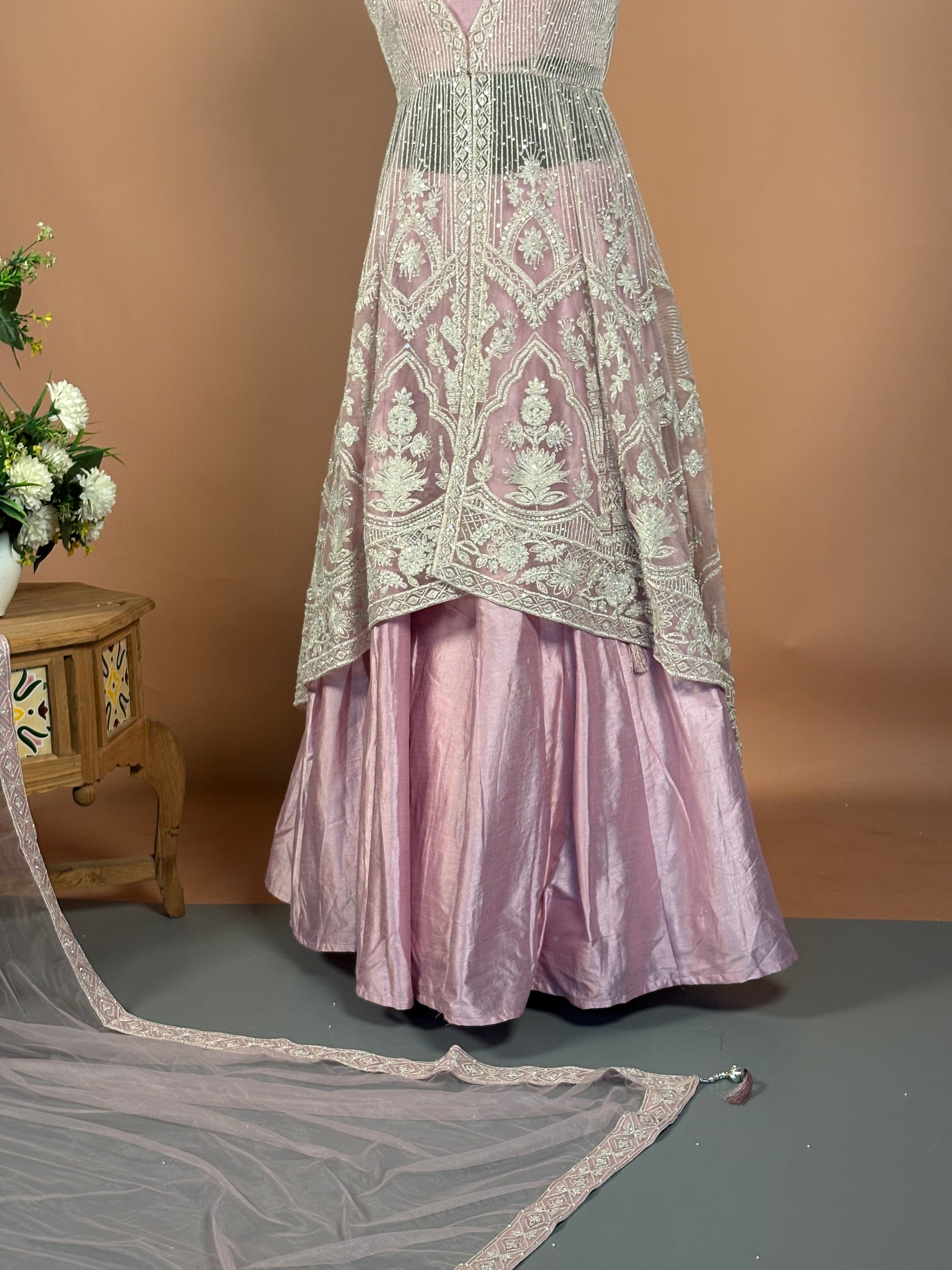 Step into graceful opulence with this dusty mauve layered Anarkali set, crafted in luxurious silk and net. The asymmetrical overlay kurta is adorned with intricate thread, zari, and sequin embroidery in antique gold tones, adding regal charm to its modern cut. The flared inner layer and the matching net dupatta with a delicate embroidered border complete this royal look. Perfect for engagements, receptions, or bridesmaids who want to shimmer with subtle elegance.
