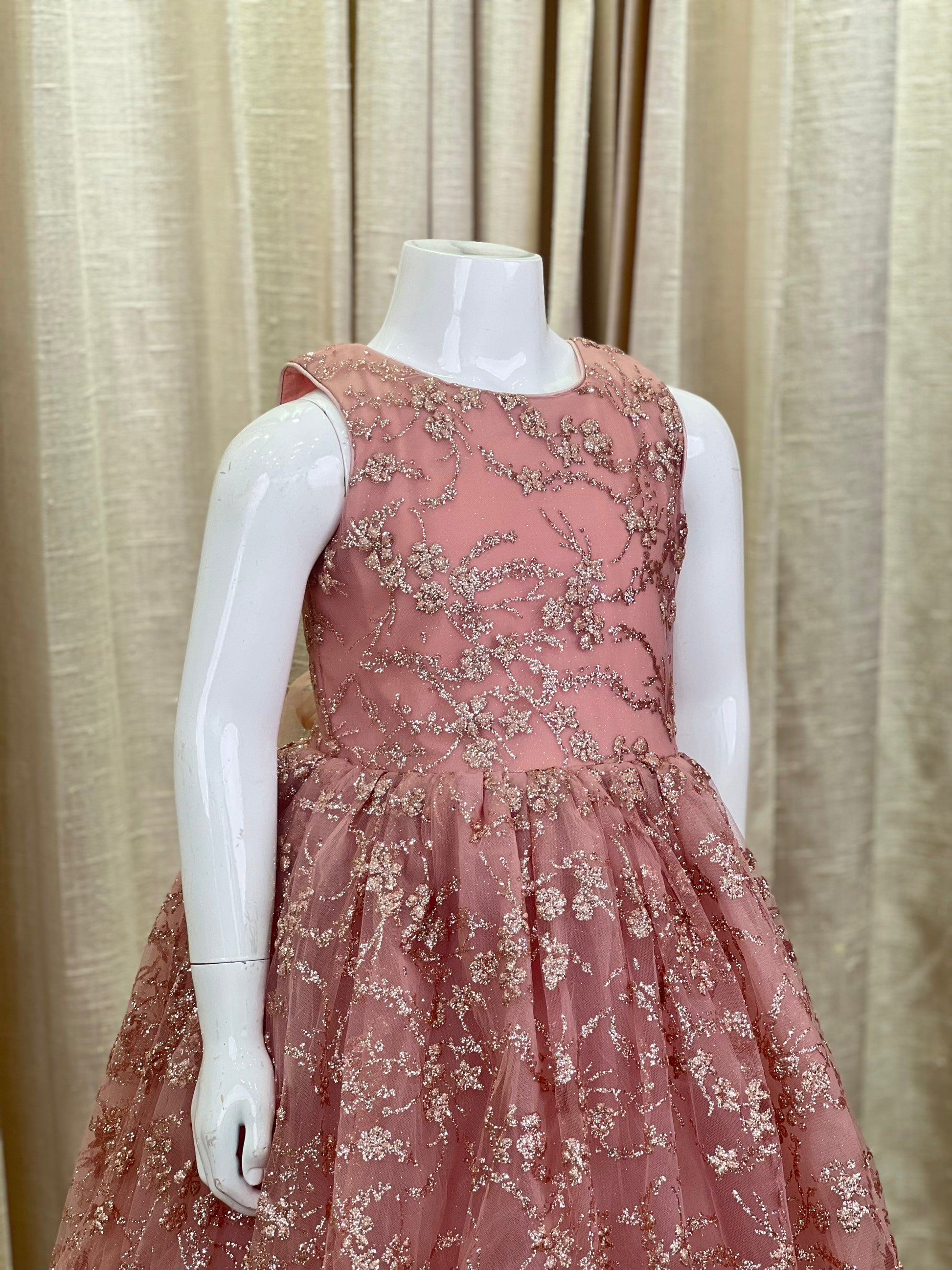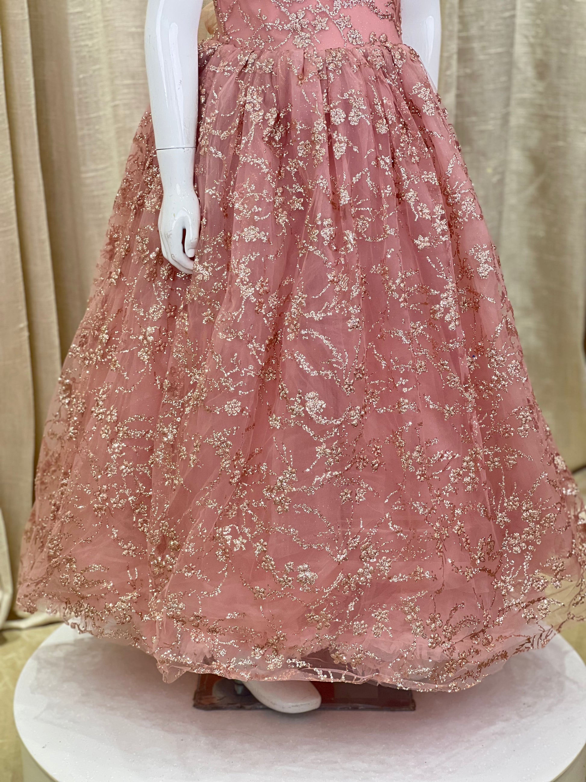 Elegant and enchanting, this dusty pink gown is a perfect blend of tradition and modern style. Crafted from soft net fabric, it features intricate embroidery work beautifully accented with sparkling sequins. The sleeveless bodice and full-length flared skirt create a timeless silhouette that's perfect for weddings, birthdays, and festive occasions. Light, breathable, and designed for comfort, this gown ensures a graceful look with every twirl.