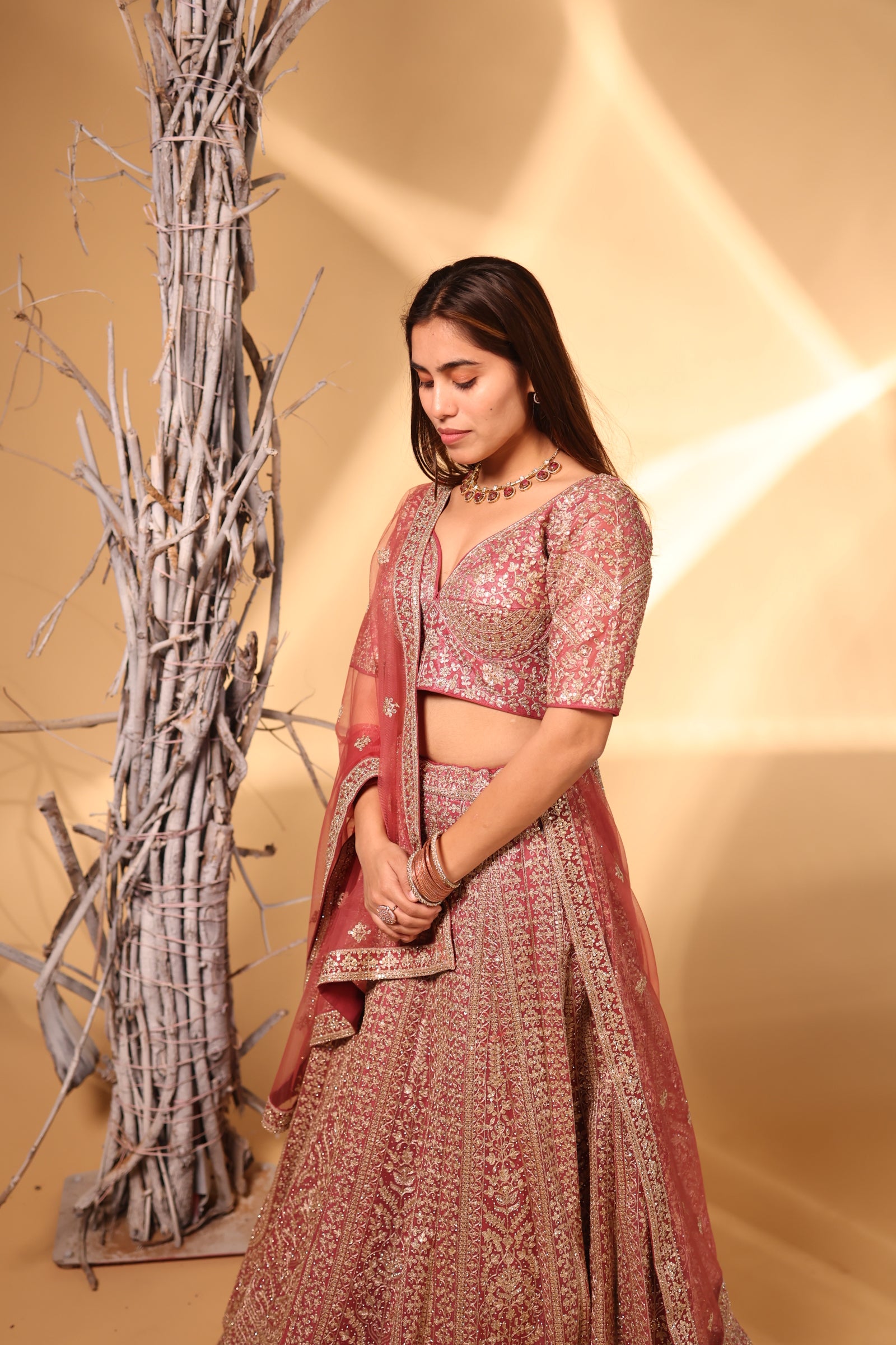 Step into timeless elegance with this exquisite Dusty Rose Bridal Lehenga, intricately adorned with all-over gold zari embroidery, fine resham work, and delicate sequin highlights. The lehenga showcases traditional jaal and paisley motifs, giving it a regal, heritage-inspired charm perfect for weddings and grand celebrations.
