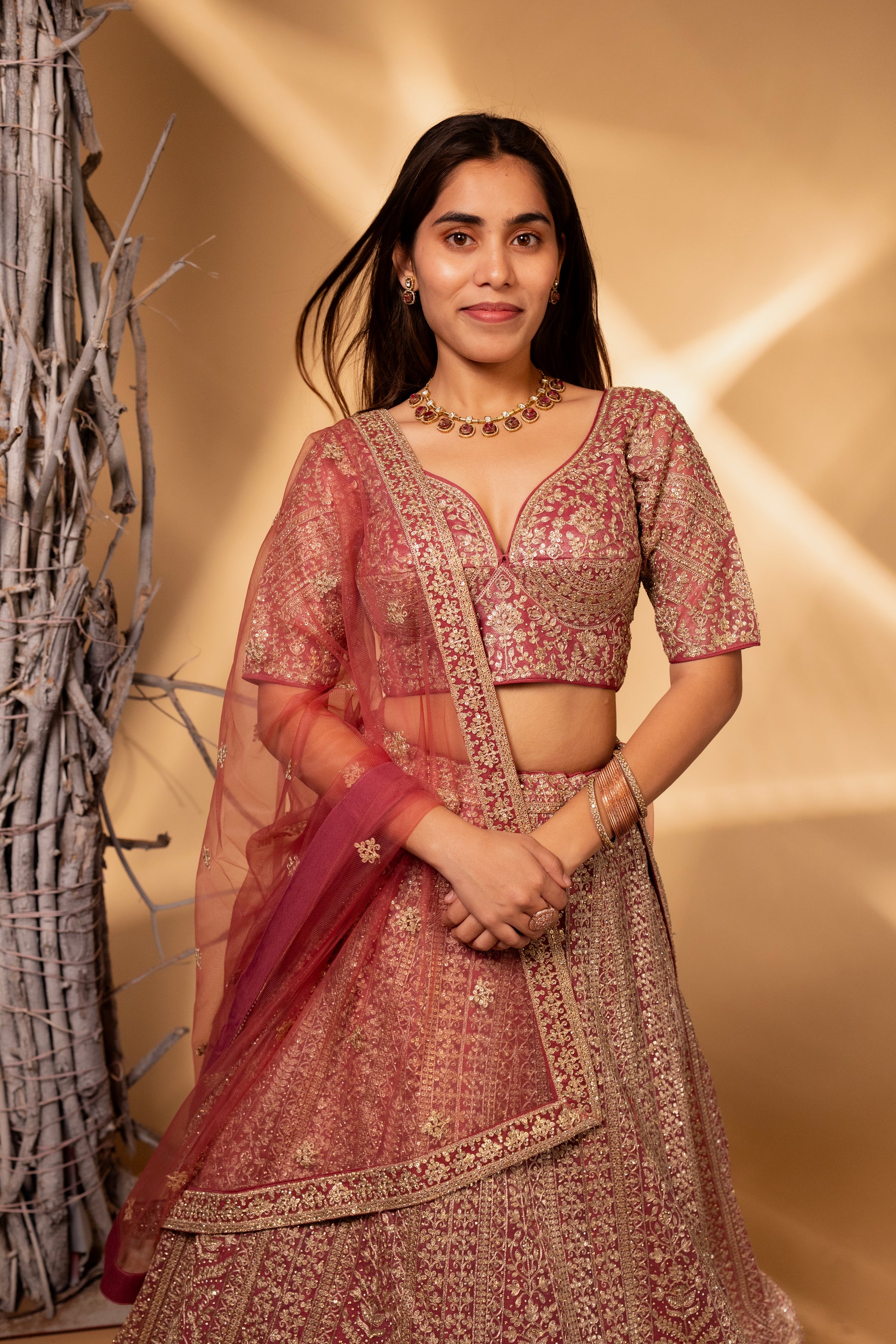 Dusty Rose & Gold Heavy Zari Embroidered Bridal Lehenga Choli