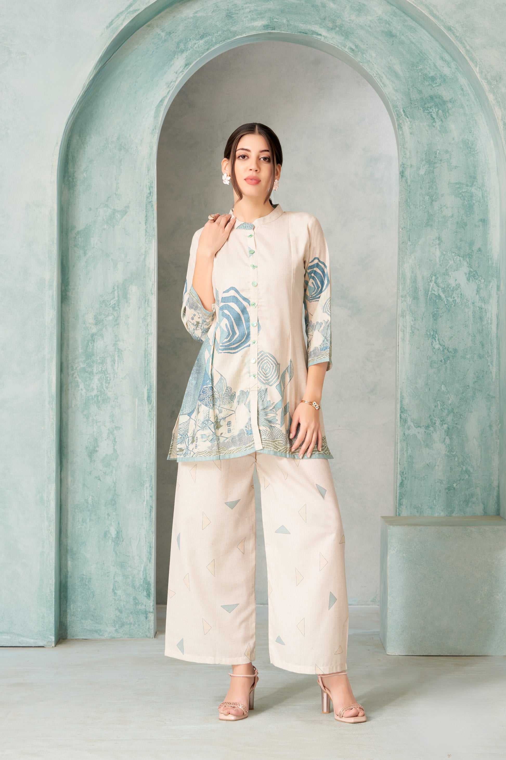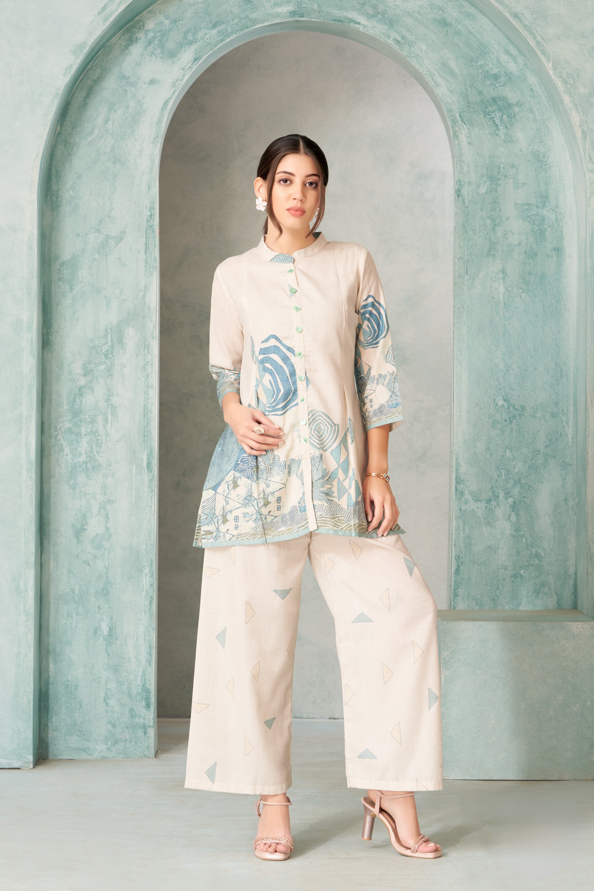 Elegant Cream & Teal Printed Co-ord Set with Artistic Floral Detailing