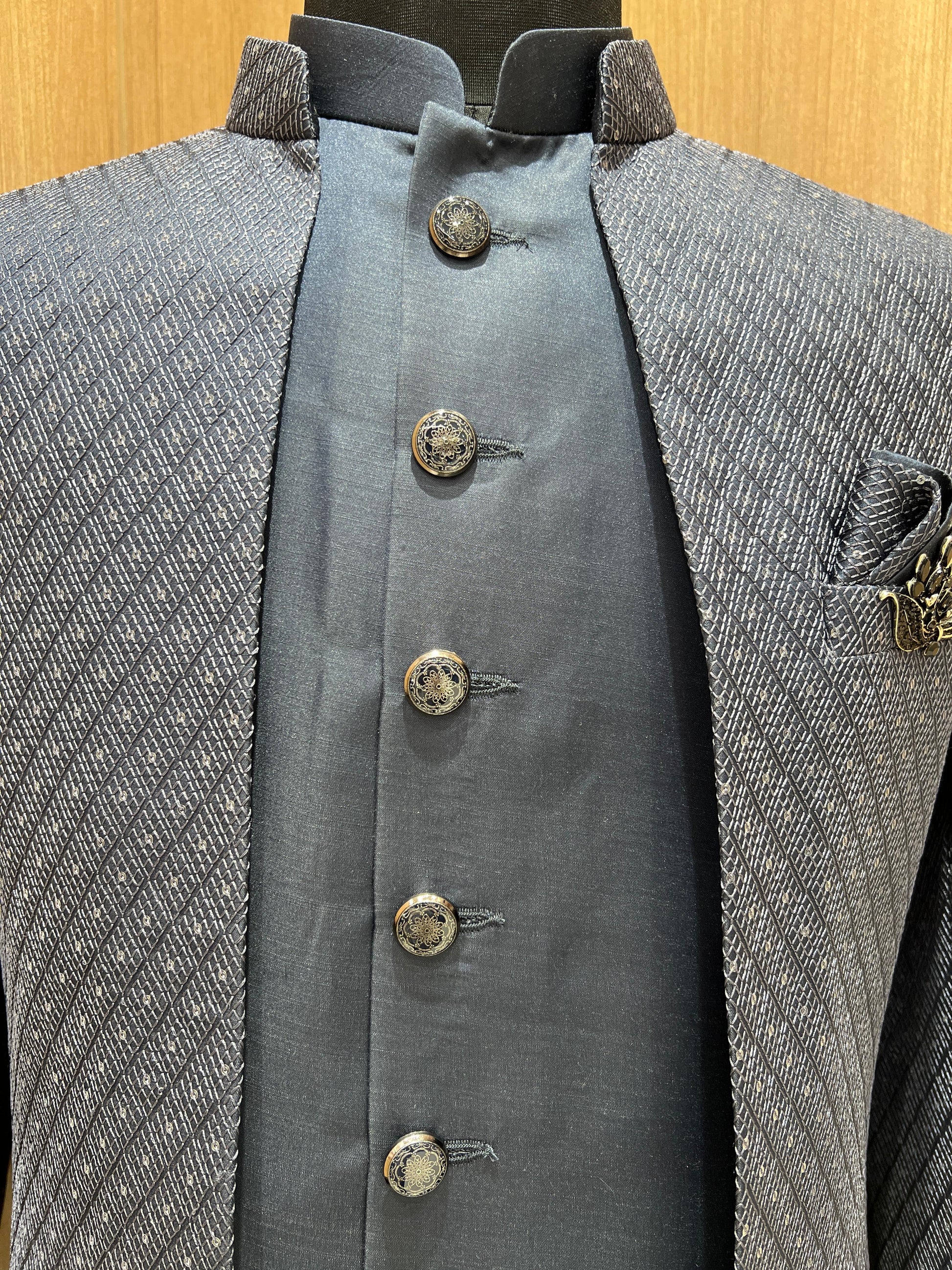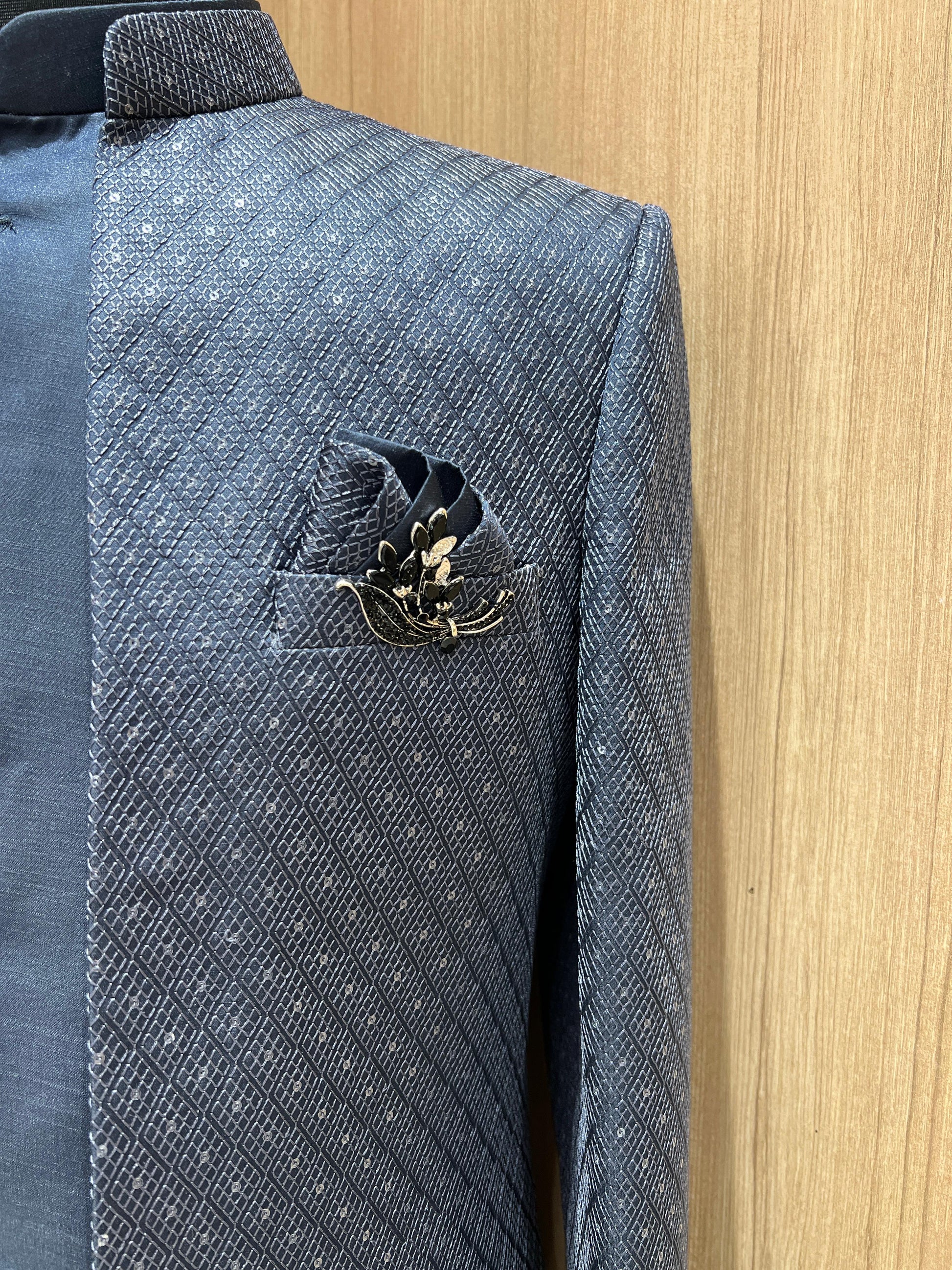 Redefine your festive and wedding style with this navy blue textured Indo Western suit. Designed with a subtle diamond-patterned fabric, this outfit features a sleek mandarin collar, designer buttons, and an asymmetrical front cut that adds a modern edge. The elegant pocket square with brooch detail enhances its royal charm. Ideal for receptions, engagements, or festive celebrations, this Indo Western outfit offers a perfect balance of tradition and contemporary sophistication.
