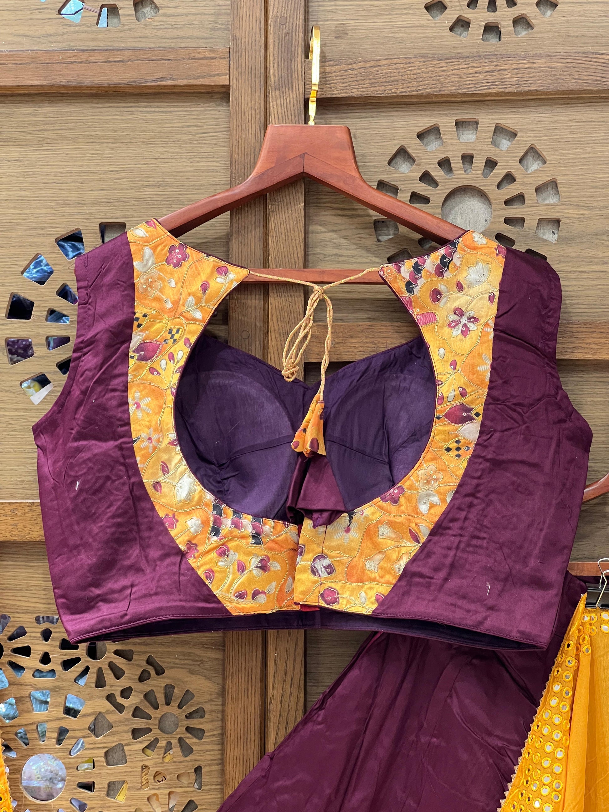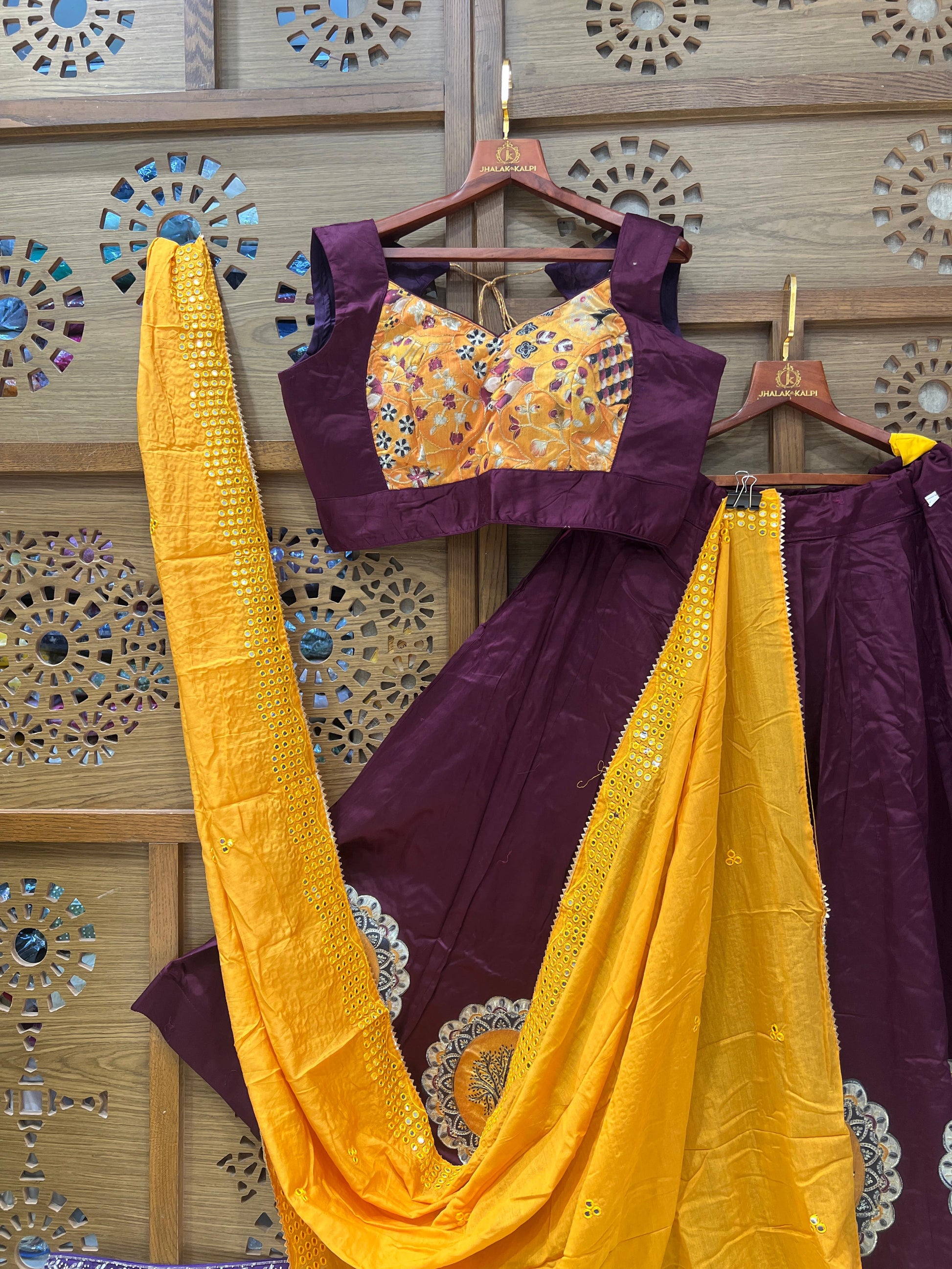 Celebrate in style with this vibrant maroon chaniya choli, perfectly paired with a mustard dupatta that adds a fun pop of contrast. The flared skirt dazzles with elegant tree motif embroidery, while the printed blouse sparkles with playful mirror highlights. Ideal for Navratri, weddings, or any festive celebration where you want to shine and twirl with joy!