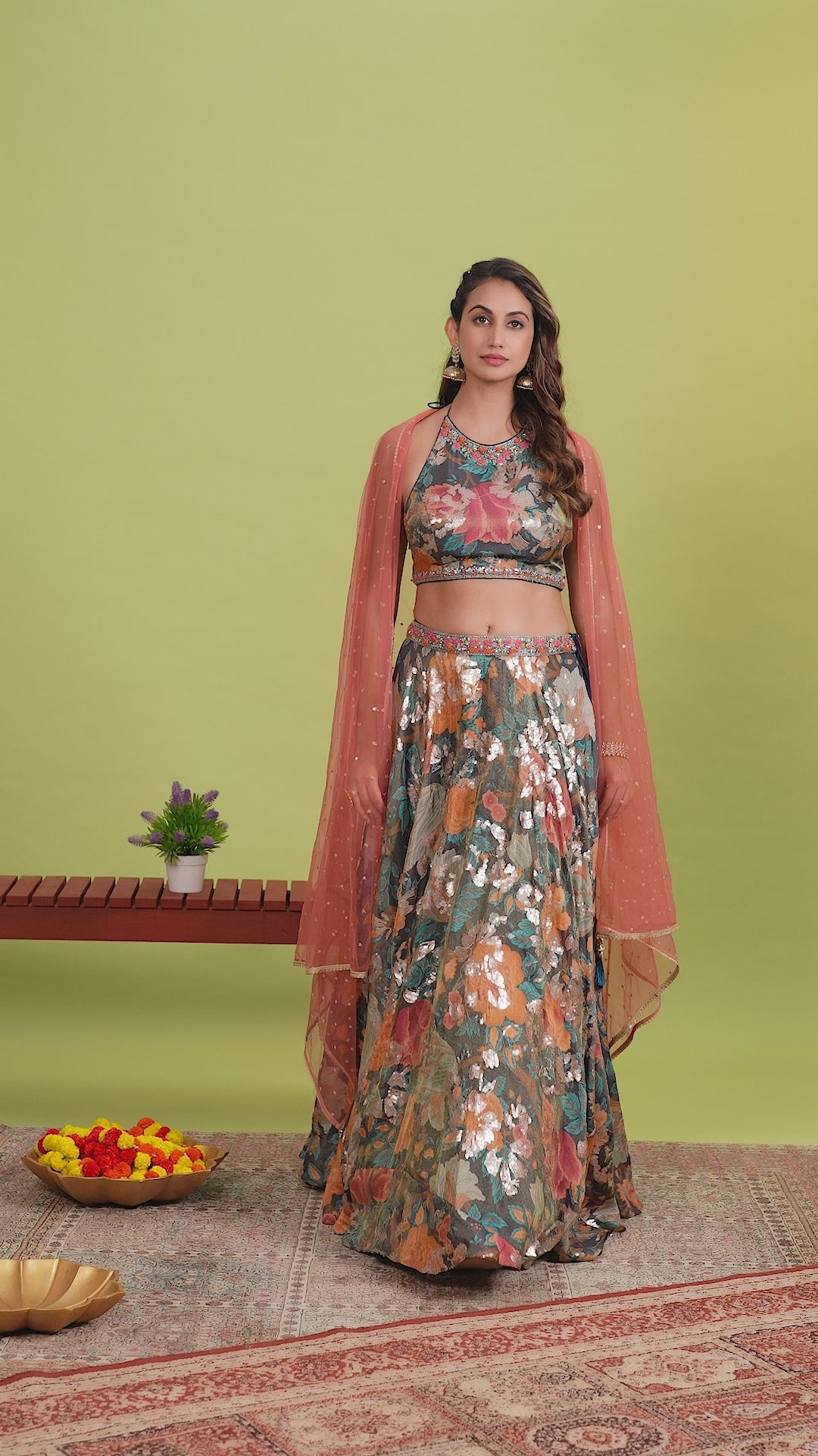 Flora Printed Embroidered Lehnga Choli With Net Dupatta