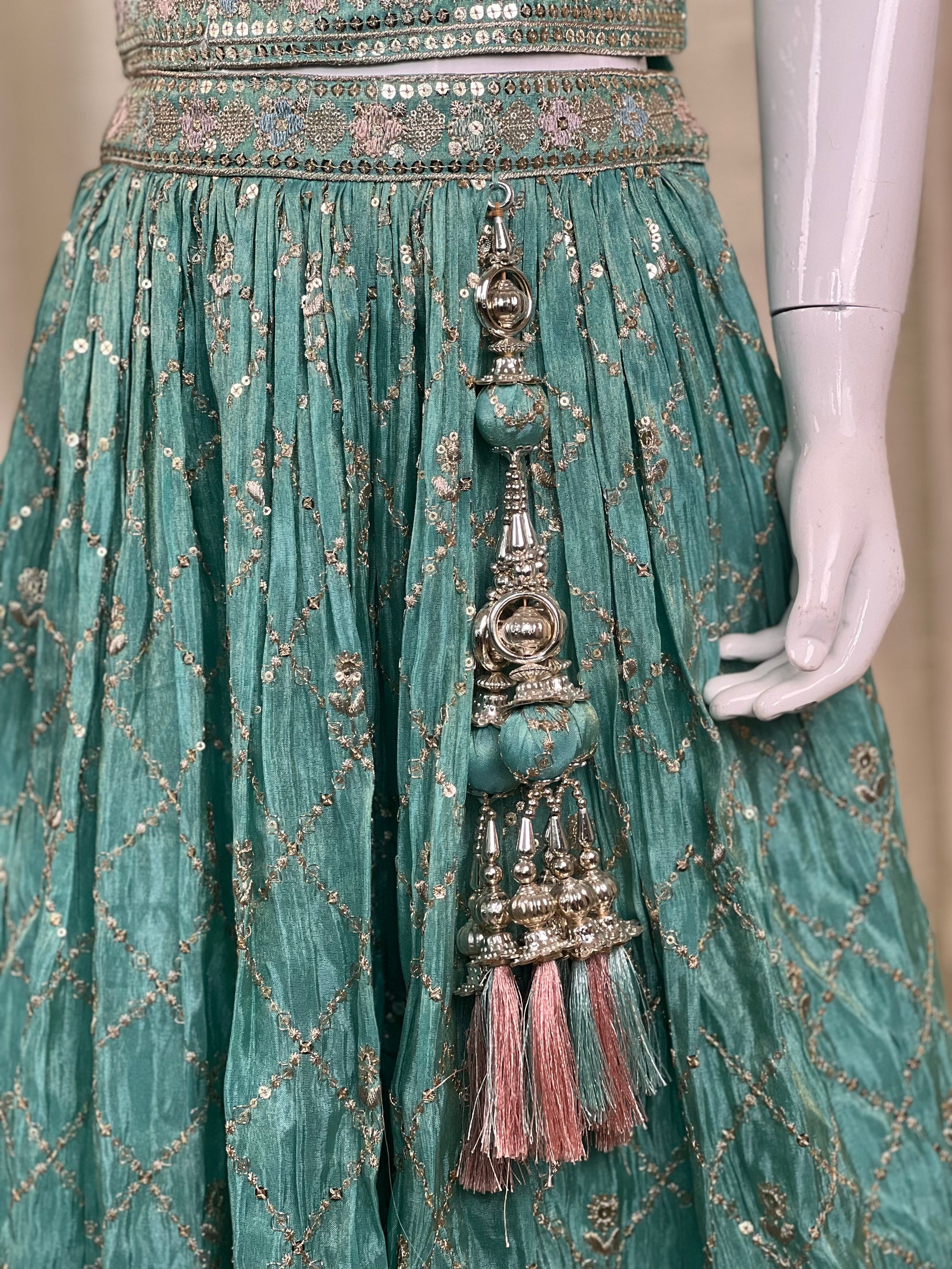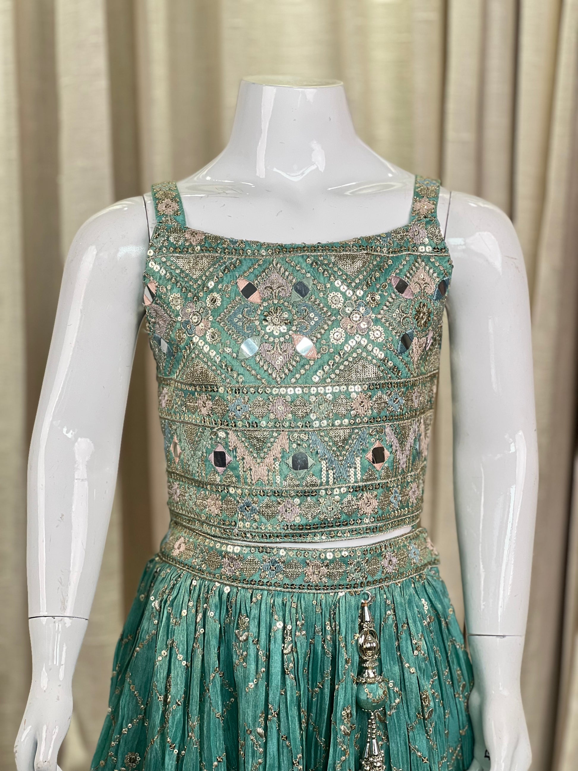 Let your little princess shine in this stunning pastel green designer gown, adorned with intricate mirror and thread embroidery. This sleeveless ensemble features a fitted bodice and a beautifully flared skirt, finished with heavy border work and elegant tassel detailing at the waist. The soft, flowy fabric ensures all-day comfort while delivering a premium festive look — perfect for weddings, sangeet functions, and special celebrations.