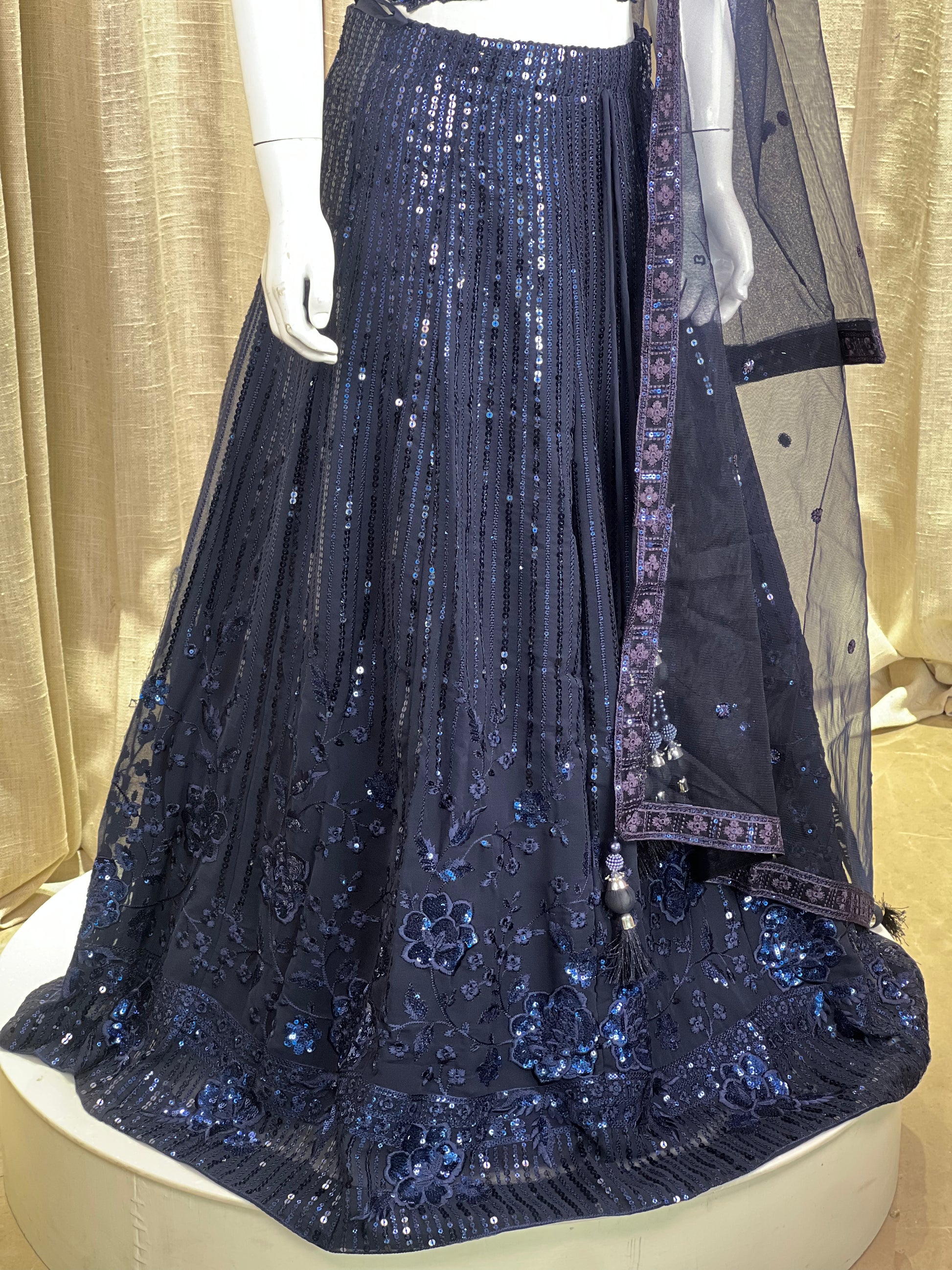 Girls Navy Blue Sequin Embroidered Lehenga Set with Net Dupatta