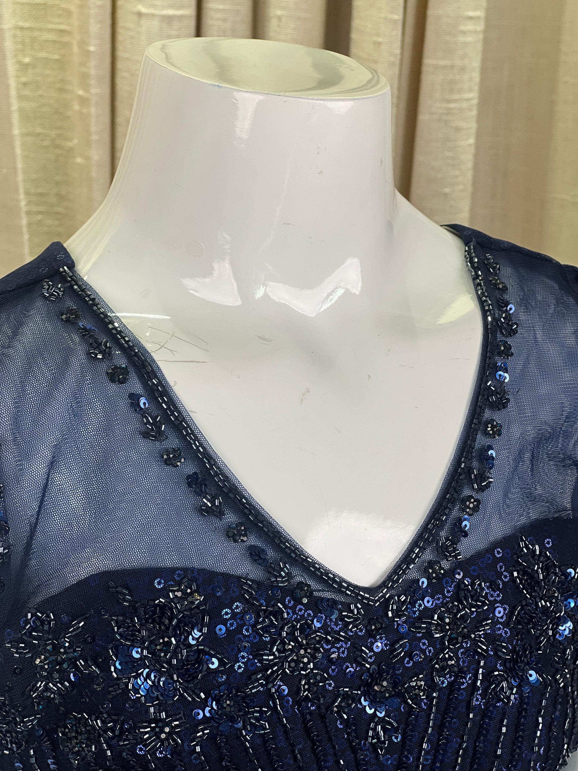 Let her sparkle and shine at every celebration in this dazzling navy blue lehenga choli set. Adorned with shimmering sequin embroidery throughout, this outfit features a sleeveless V-neck blouse, a flared skirt with rich detailing, and a soft net dupatta with tassel accents for a glam finish.