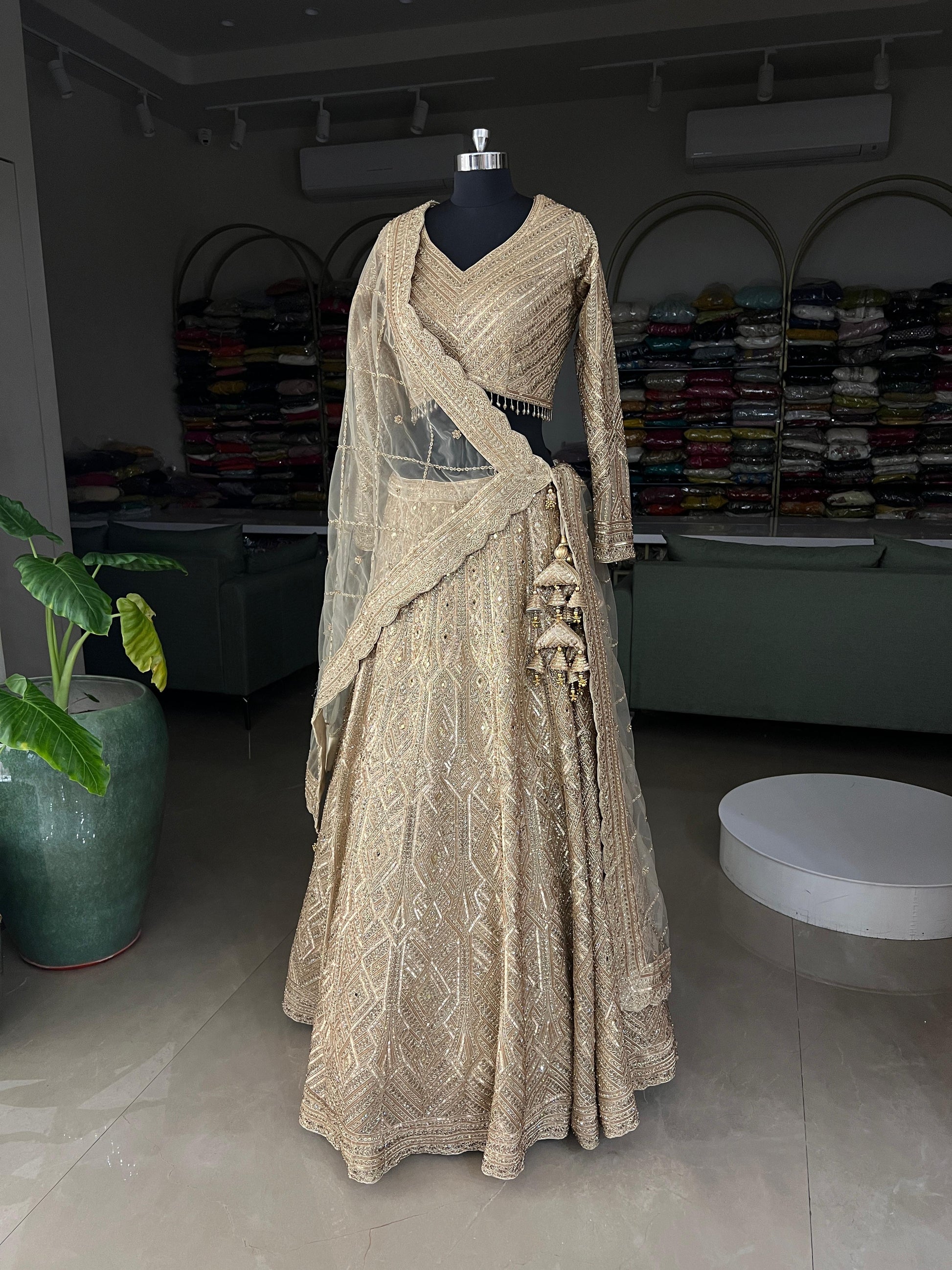 Radiate timeless elegance with this Golden Georgette Lehenga Choli, beautifully embellished with intricate sequins, zari, and mirror embroidery in geometric patterns. The V-neck blouse features delicate handwork and tassel detailing at the waist for a graceful touch. Paired with a gold net dupatta highlighted with fine embroidery and scalloped borders, this ensemble is perfect for weddings, receptions, and festive occasions — a true statement of luxury and sophistication.