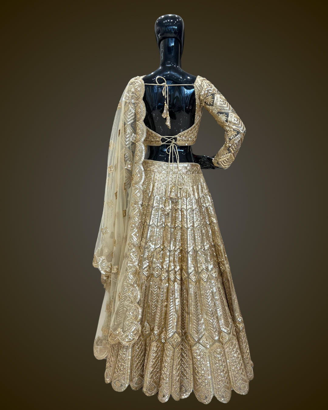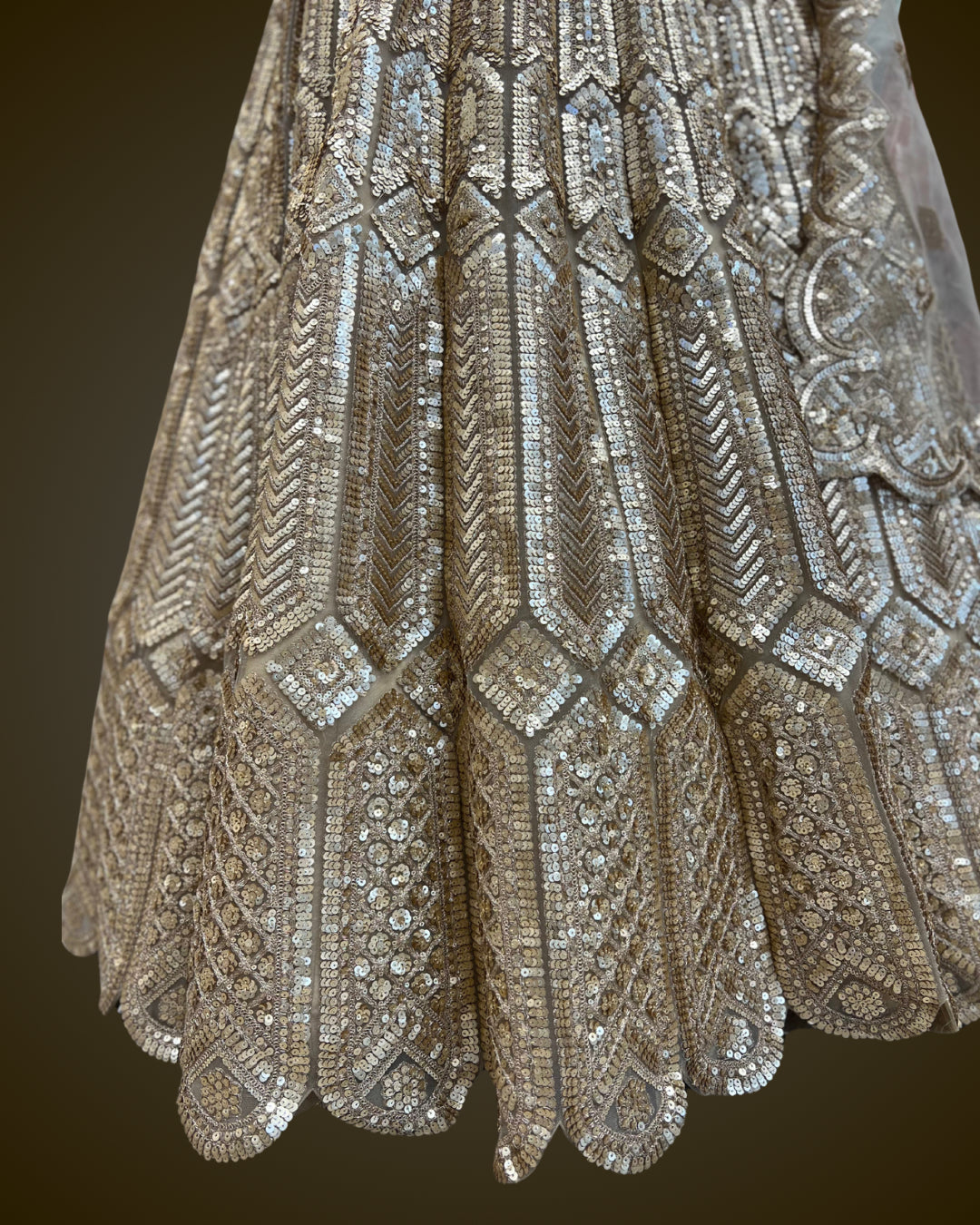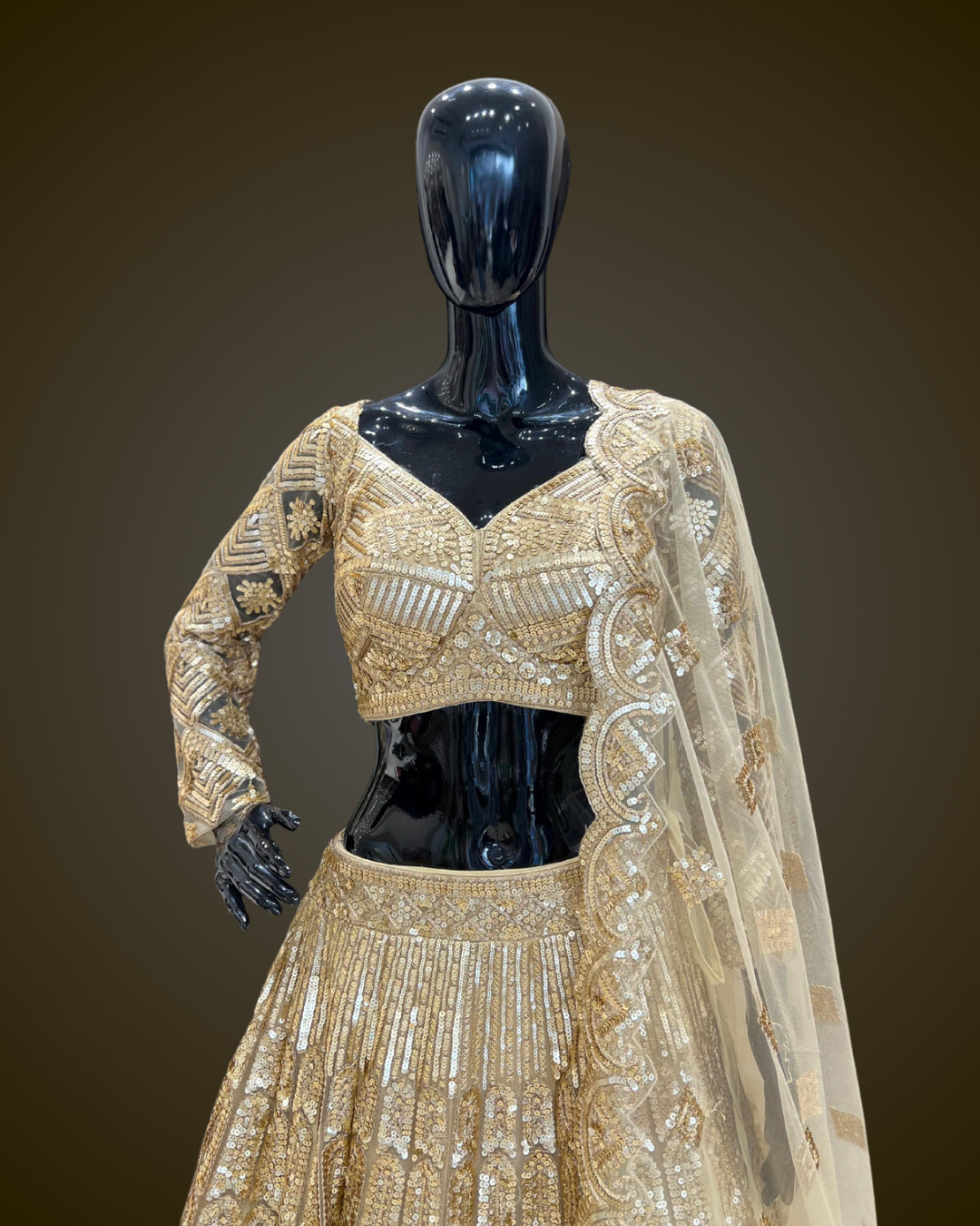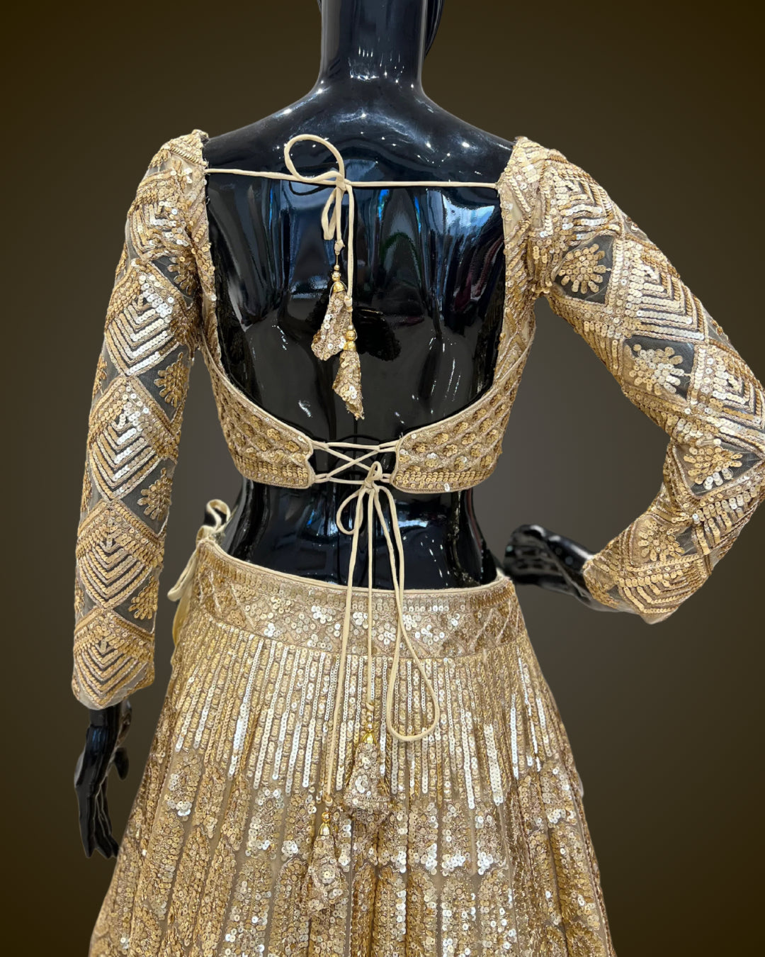 Shimmer and shine in our Golden sequins work lehnga choli! This stunning piece features intricate golden sequins work for a glamorous touch. Perfect for any special occasion, you'll be sure to turn heads and make a statement.