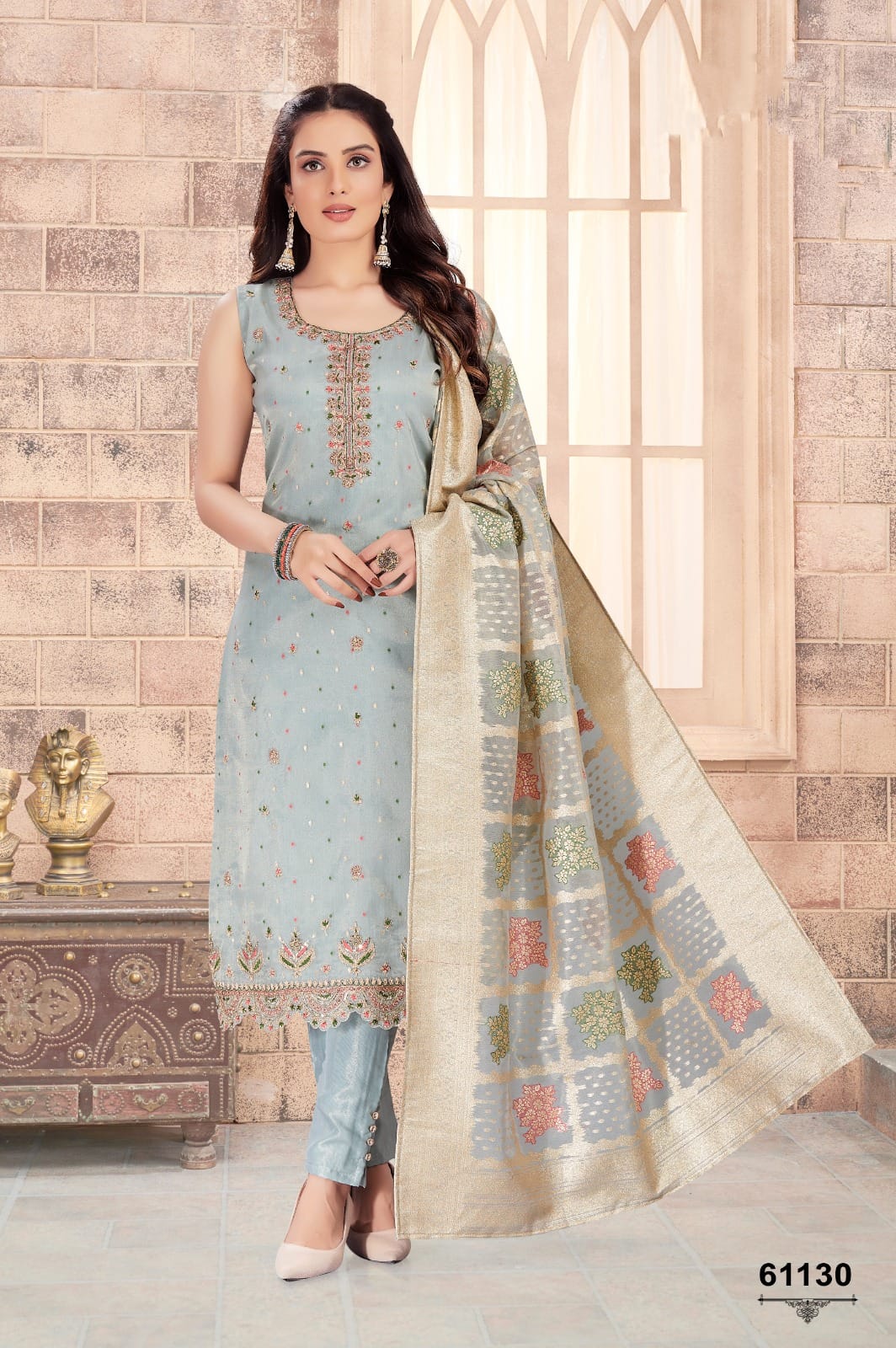 Elevate your wardrobe with this sophisticated gray silk kurti-pant set for women, adorned with a vibrant red and green print, complemented by a matching dupatta. The combination of muted tones and striking patterns creates a timeless elegance.
