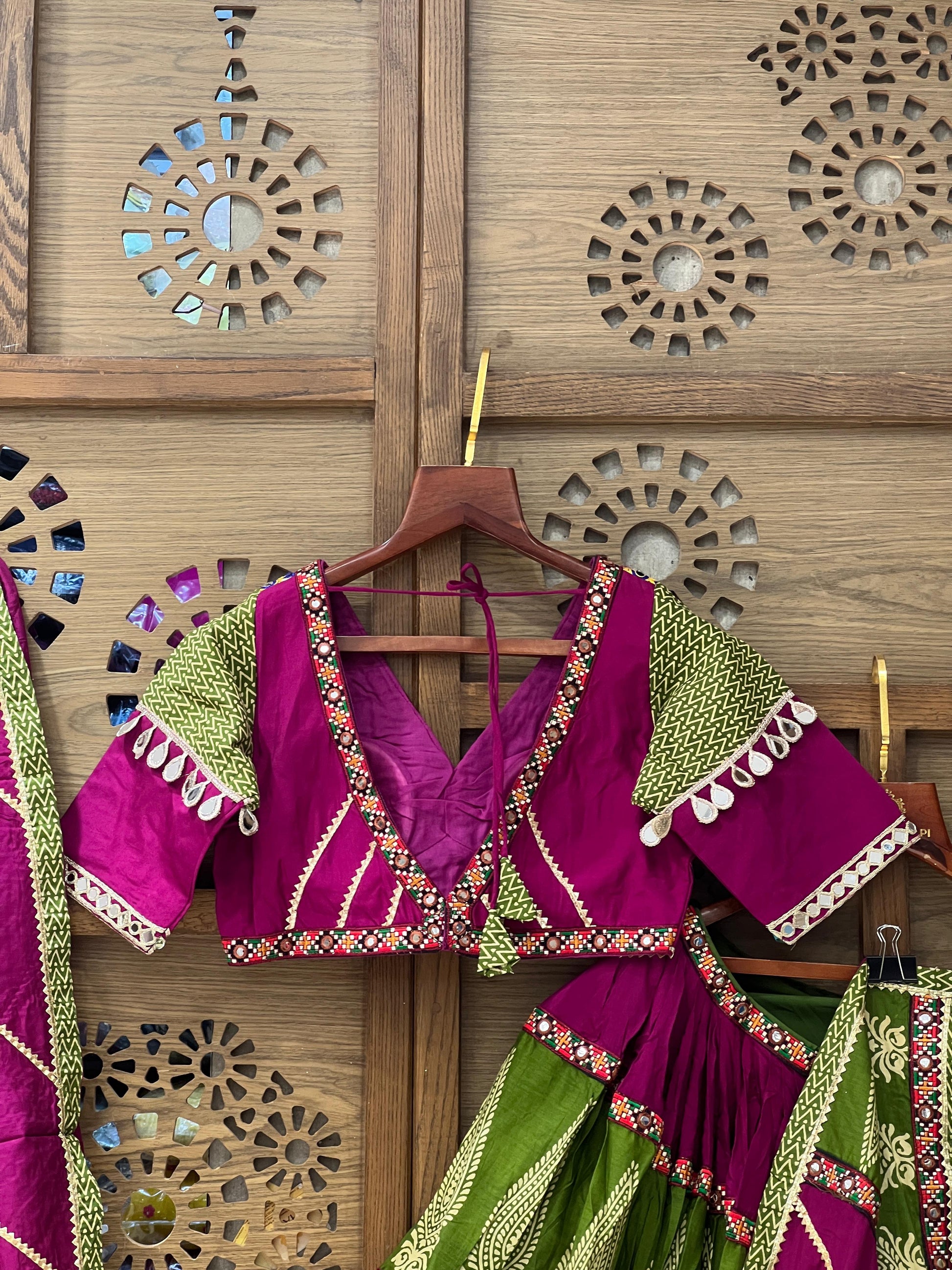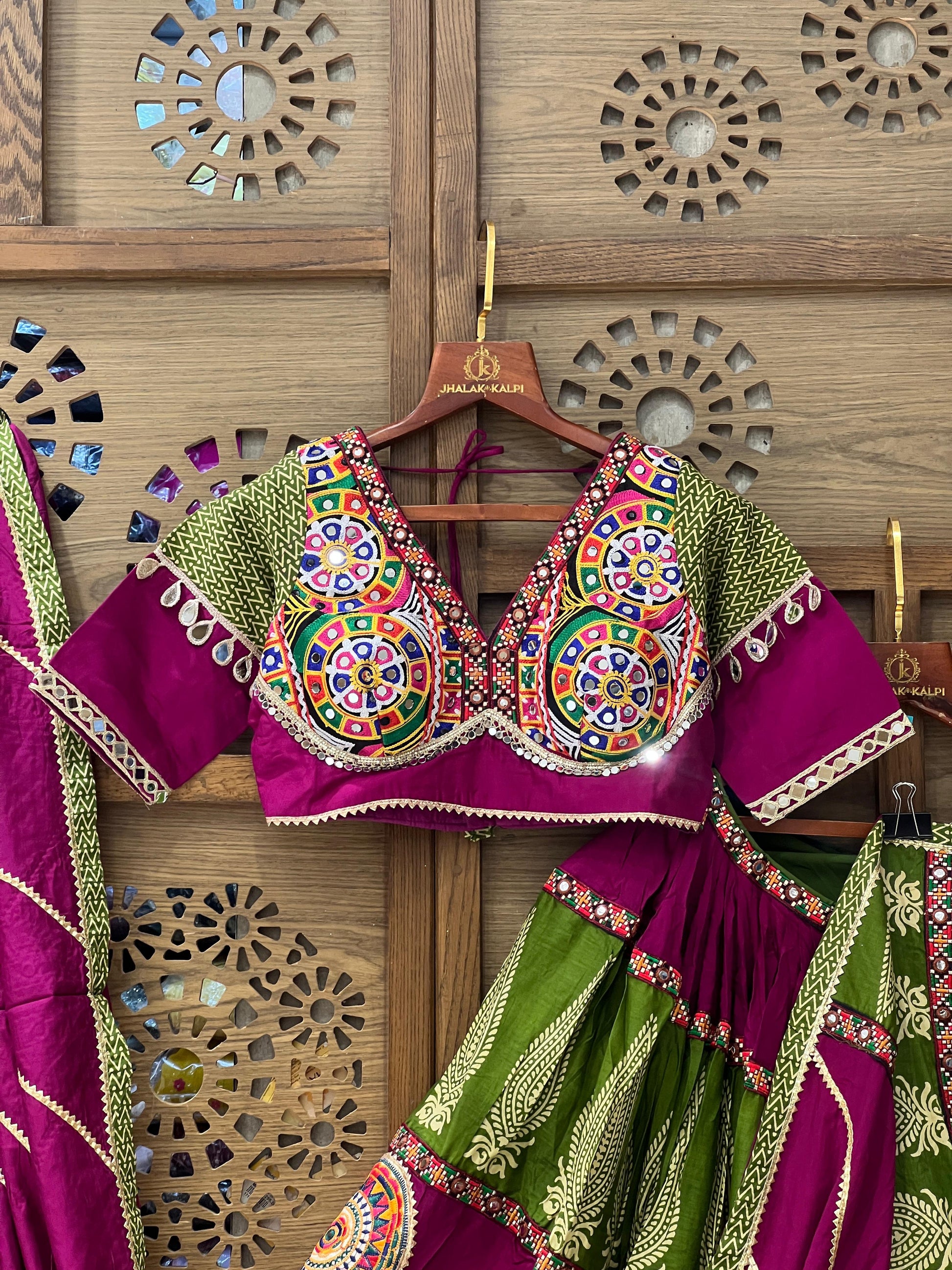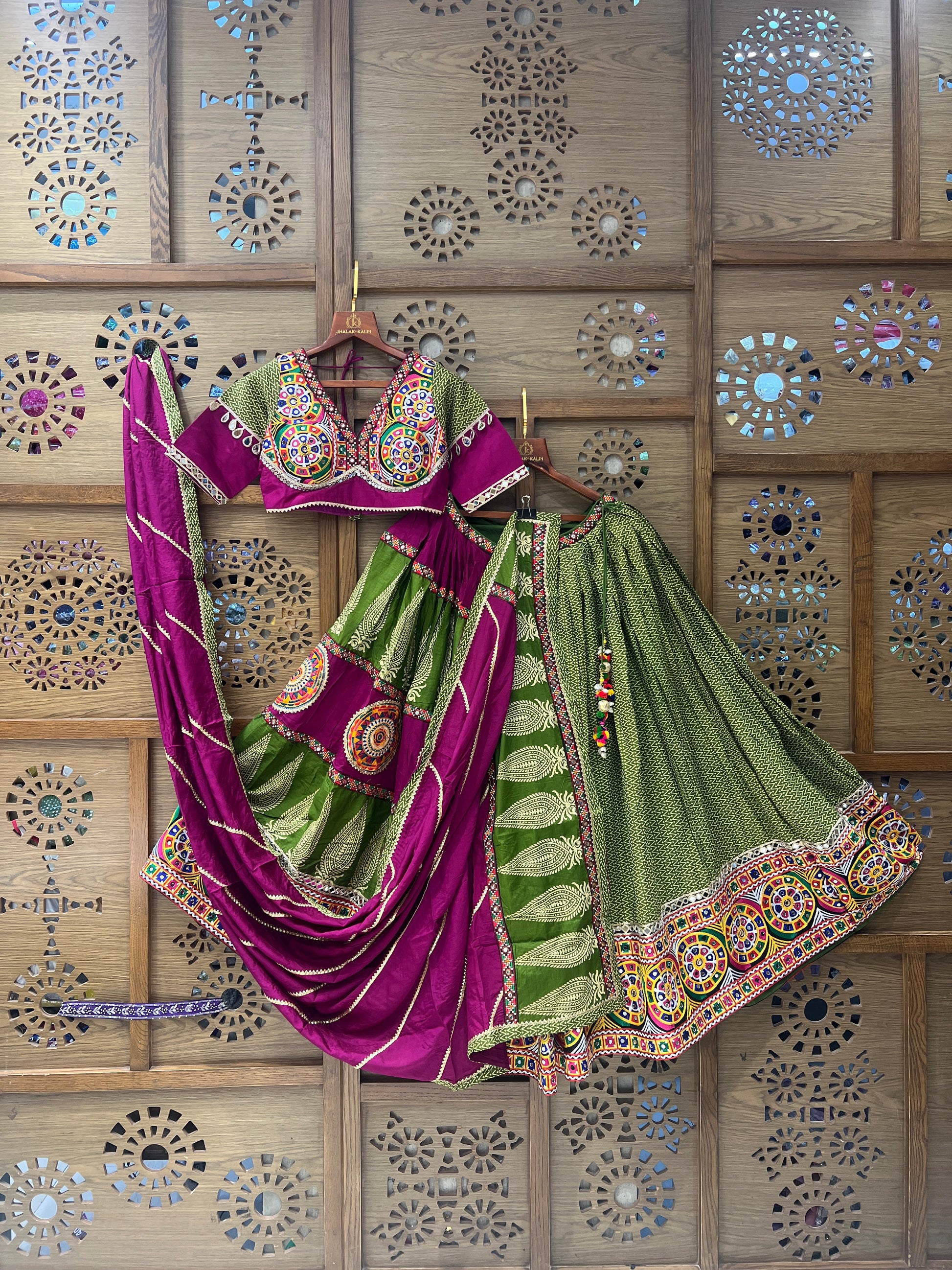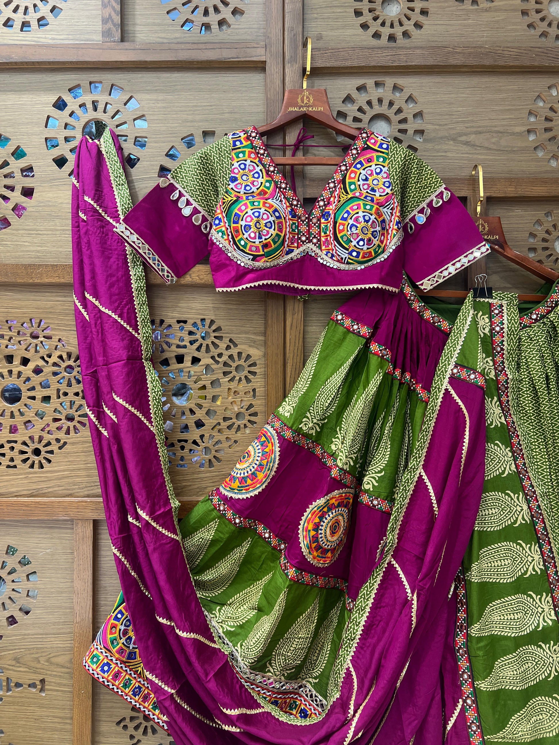 Add a splash of tradition to your festive wardrobe with this green and magenta chaniya choli set. The blouse features intricate mirror work with multicolor embroidery, beautifully paired with a green flared skirt decorated with detailed border embroidery and traditional motifs. The magenta dupatta with golden accents enhances the overall charm, making this outfit perfect for Navratri, weddings, and cultural festivities.