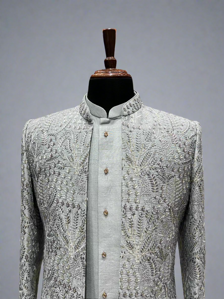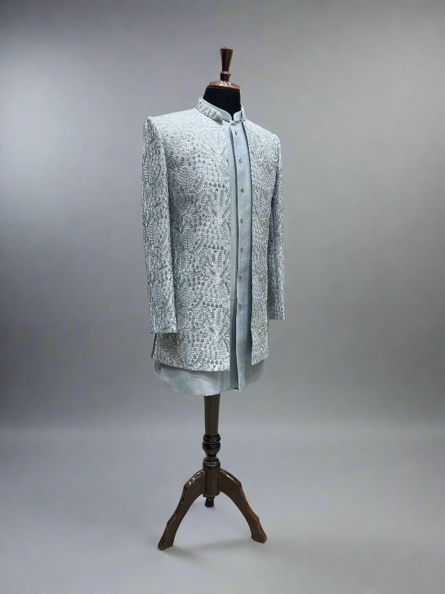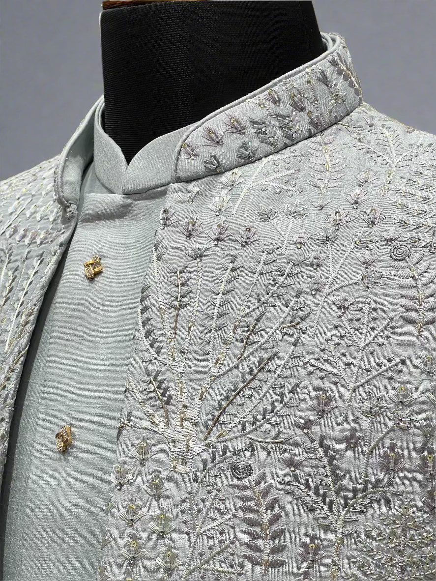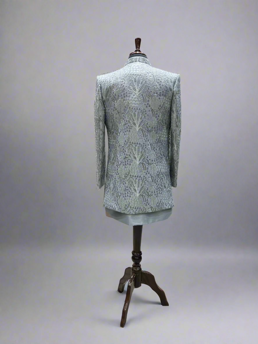 Featuring a mandarin collar, sleek metal buttons, and a contemporary straight-cut silhouette, this ensemble is ideal for day weddings, receptions, or festive celebrations. The cool-toned palette and intricate work make it a standout choice for those seeking modern minimalism fused with ethnic elegance.
