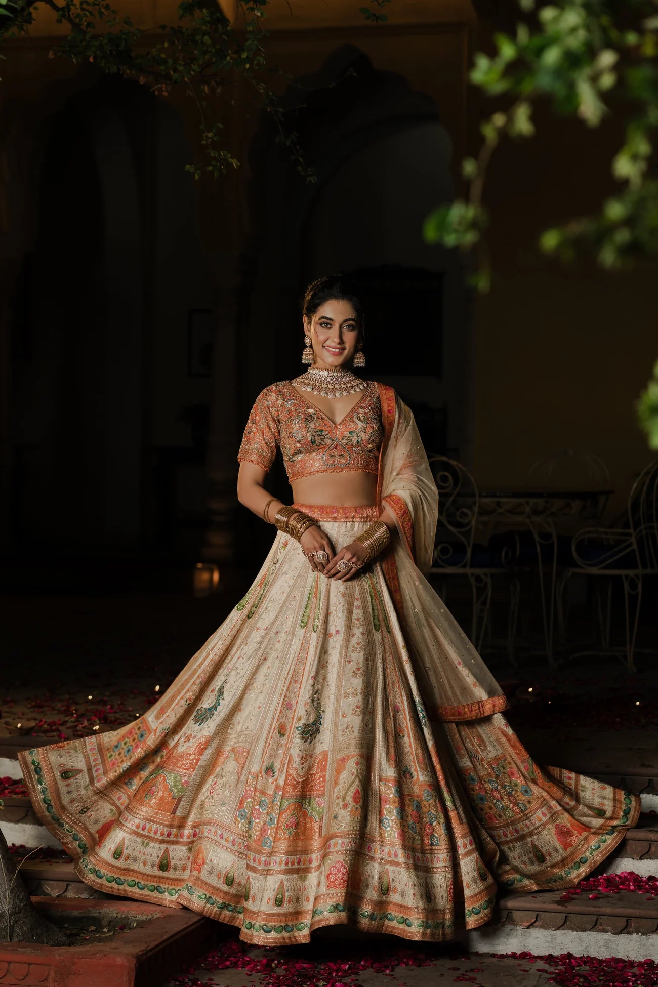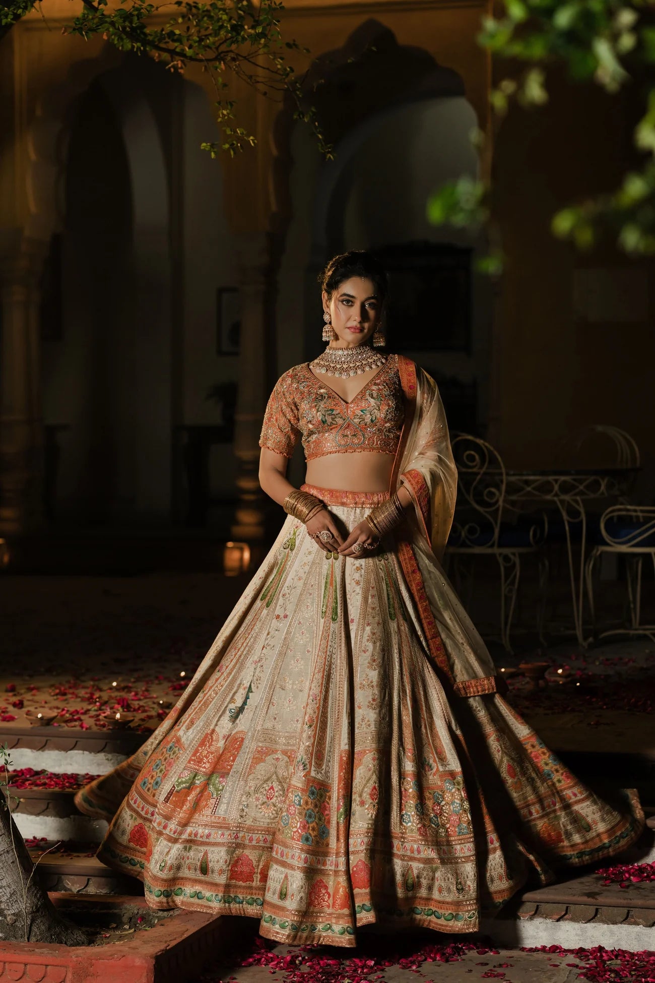 The lehenga skirt in a soft ivory tone is adorned with detailed temple-inspired patterns, floral vines, and intricate borders in coral, green, and gold accents—creating a rich visual texture with every panel. The soft net dupatta is sprinkled with sequins and bordered with a coral and gold embroidered edge, offering a subtle shimmer with every drape.
