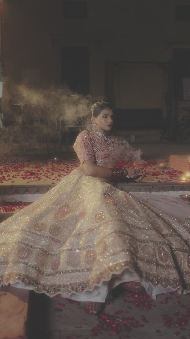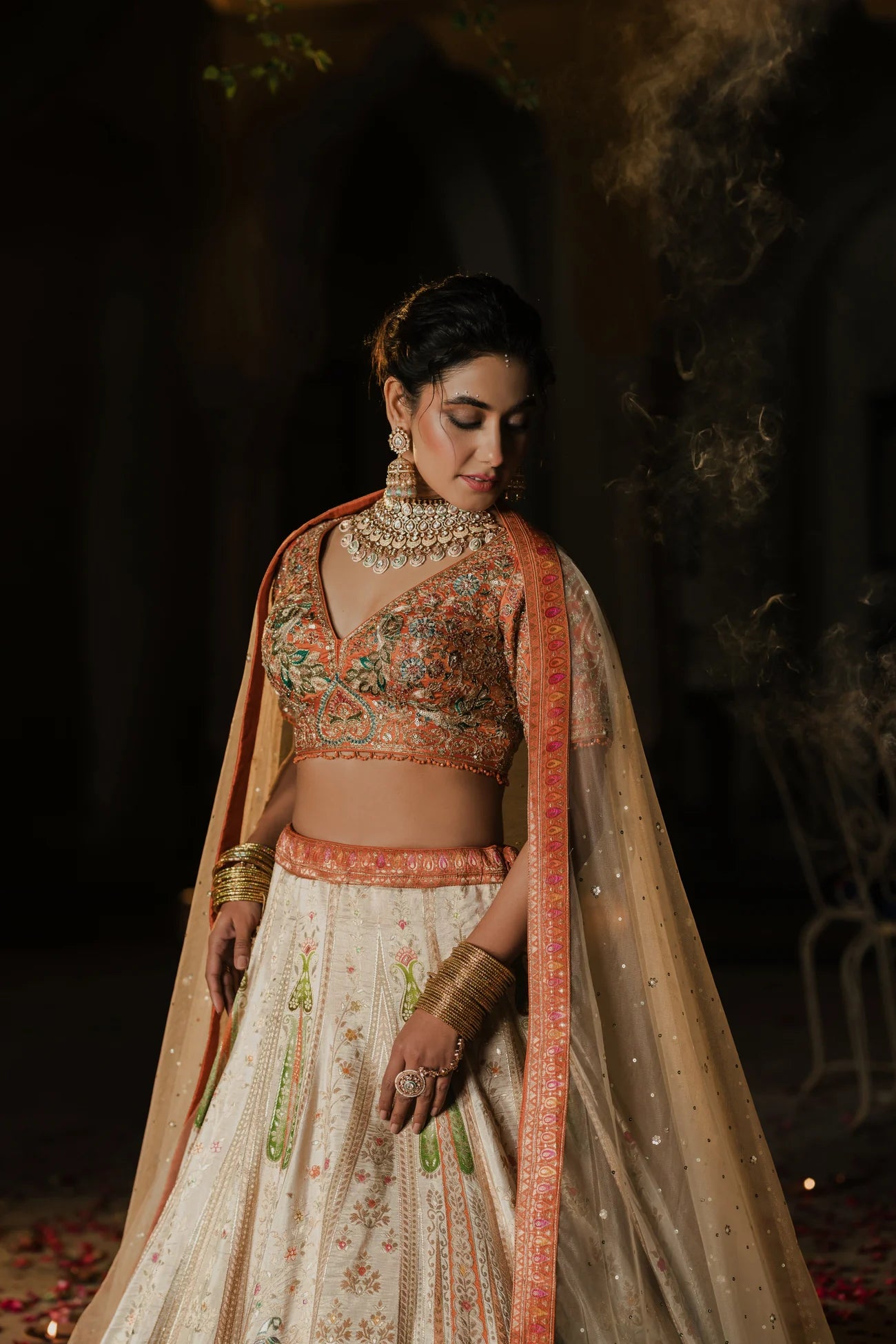 Ivory and Coral Hand-Embroidered Lehenga Set