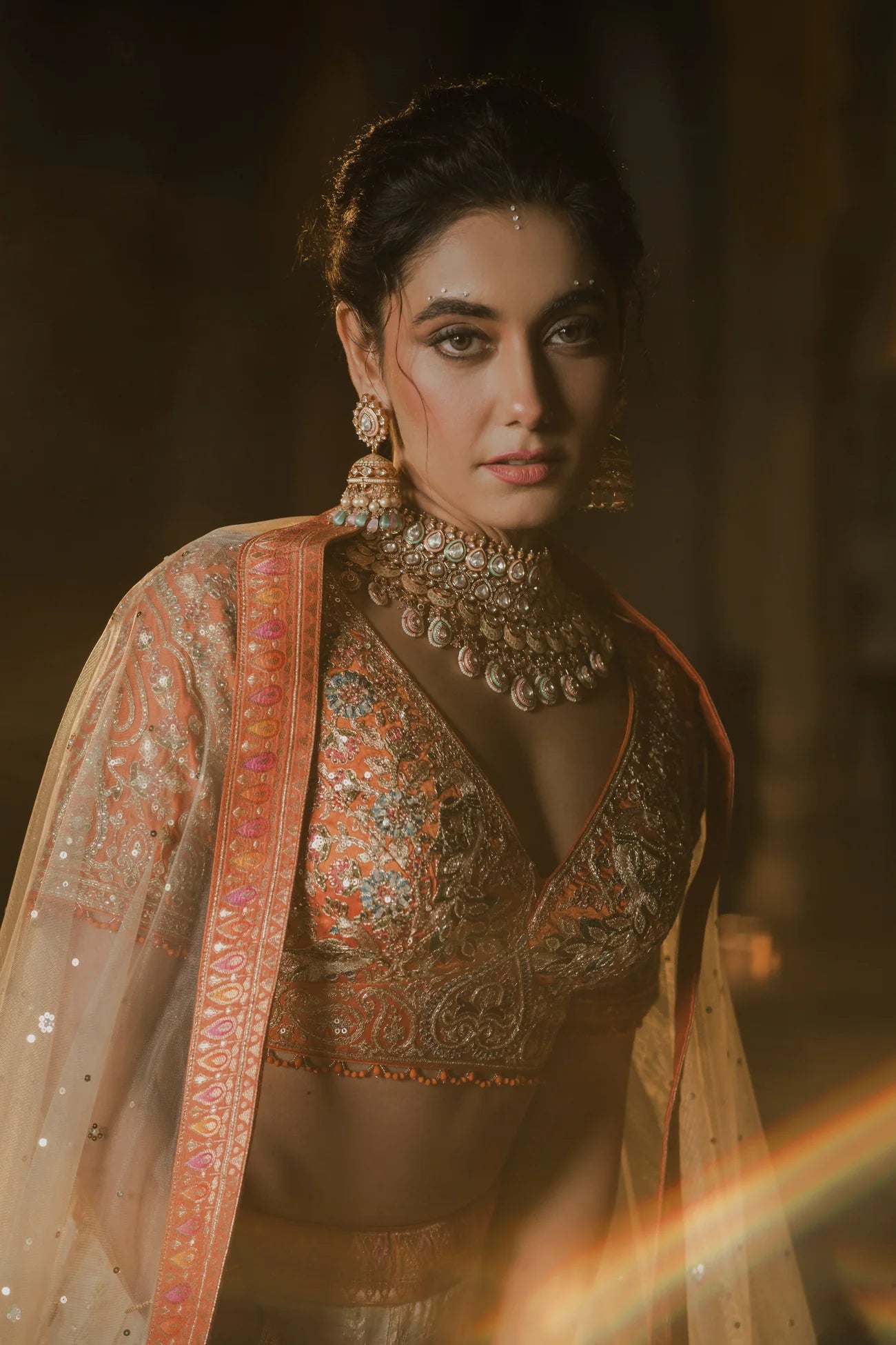 Step into a world of regal charm with this exquisite ivory and coral lehenga set, intricately crafted to celebrate heritage craftsmanship. The V-neck blouse features elaborate hand-embroidered floral motifs in resham, sequins, and zardosi work, highlighted with hints of green and metallic hues on a rich coral base. The blouse is styled with half sleeves and finished with delicate bead edging, adding a traditional yet refined touch.