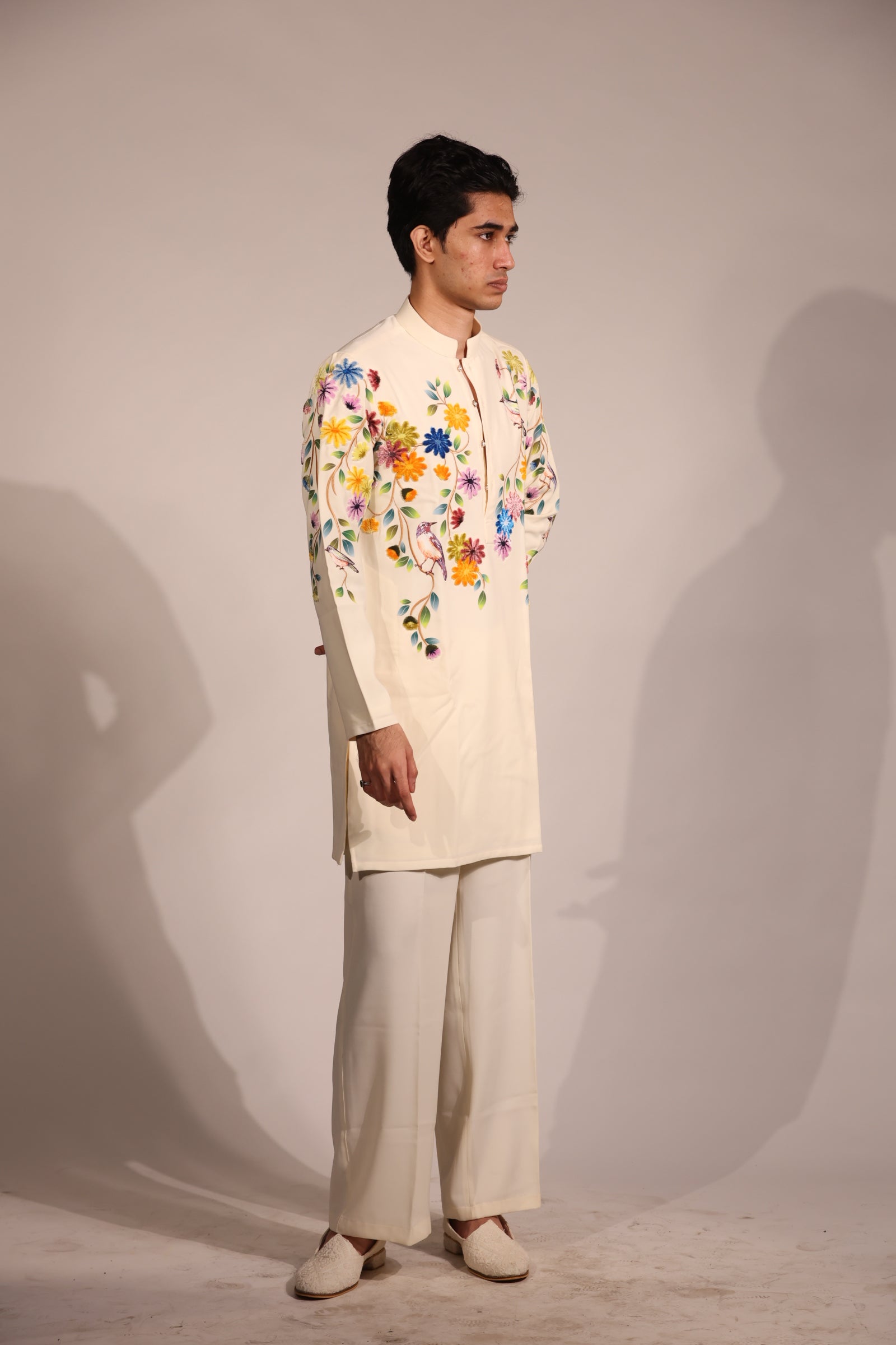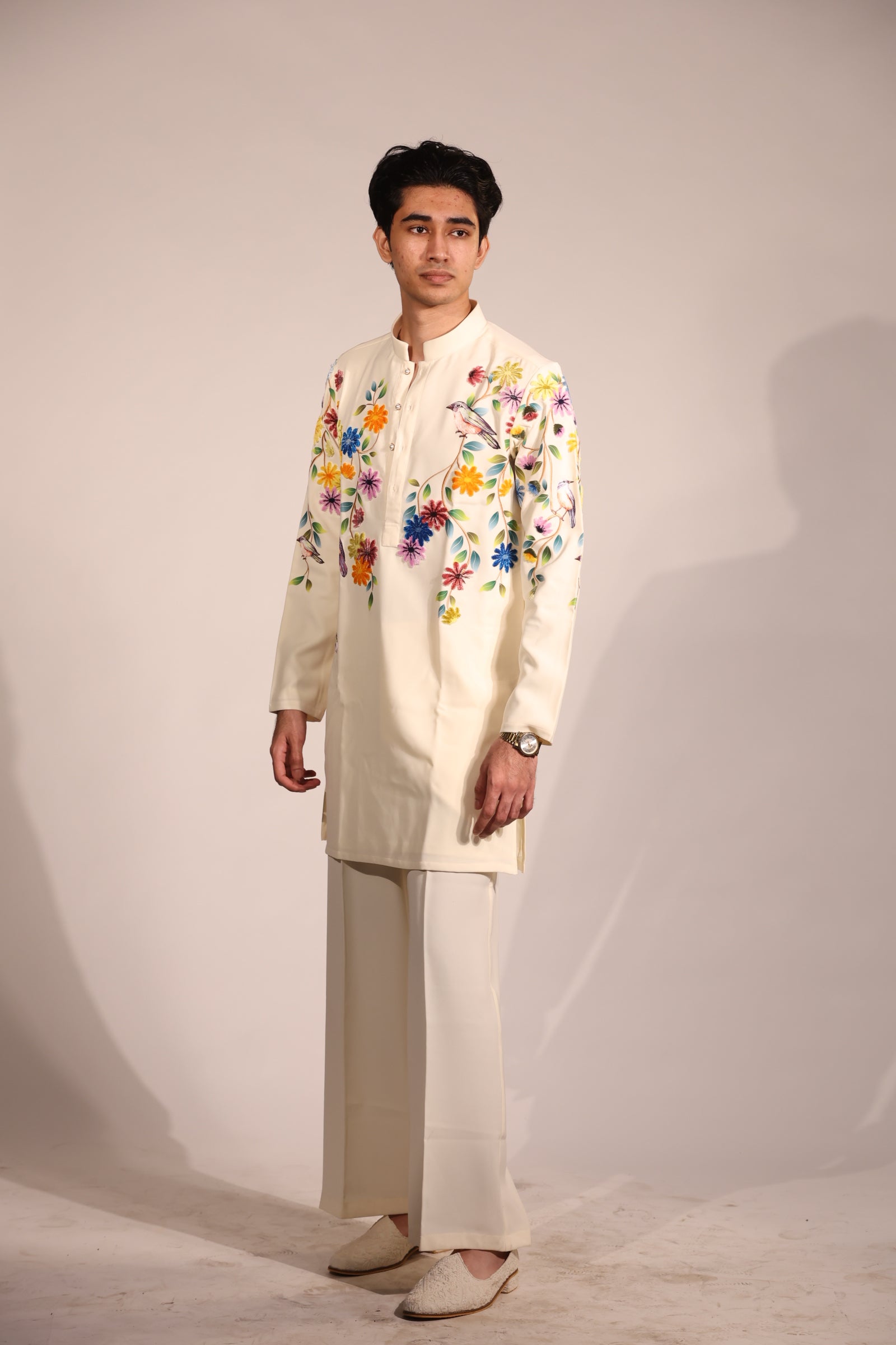 This refined contemporary Indian ensemble features a soft ivory base that serves as a canvas for vibrant multicolour floral embroidery. The kurta is adorned with delicately placed floral and bird-inspired motifs across the chest and sleeves, crafted using fine threadwork that adds freshness and artistic charm to the silhouette.