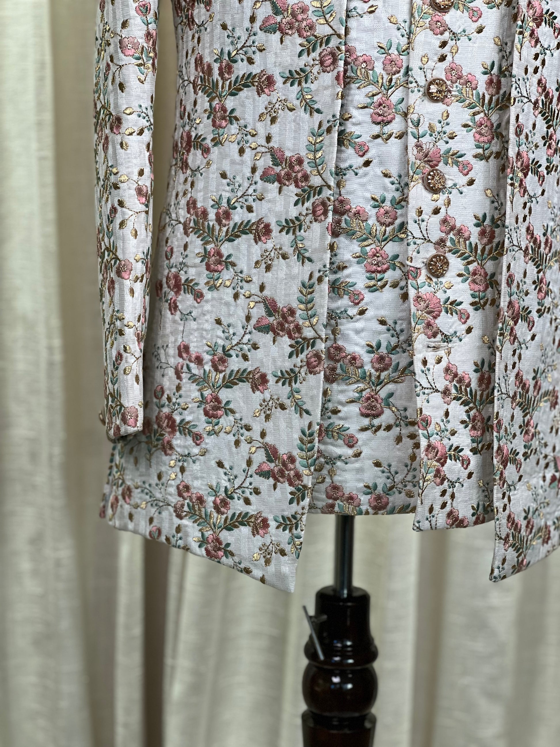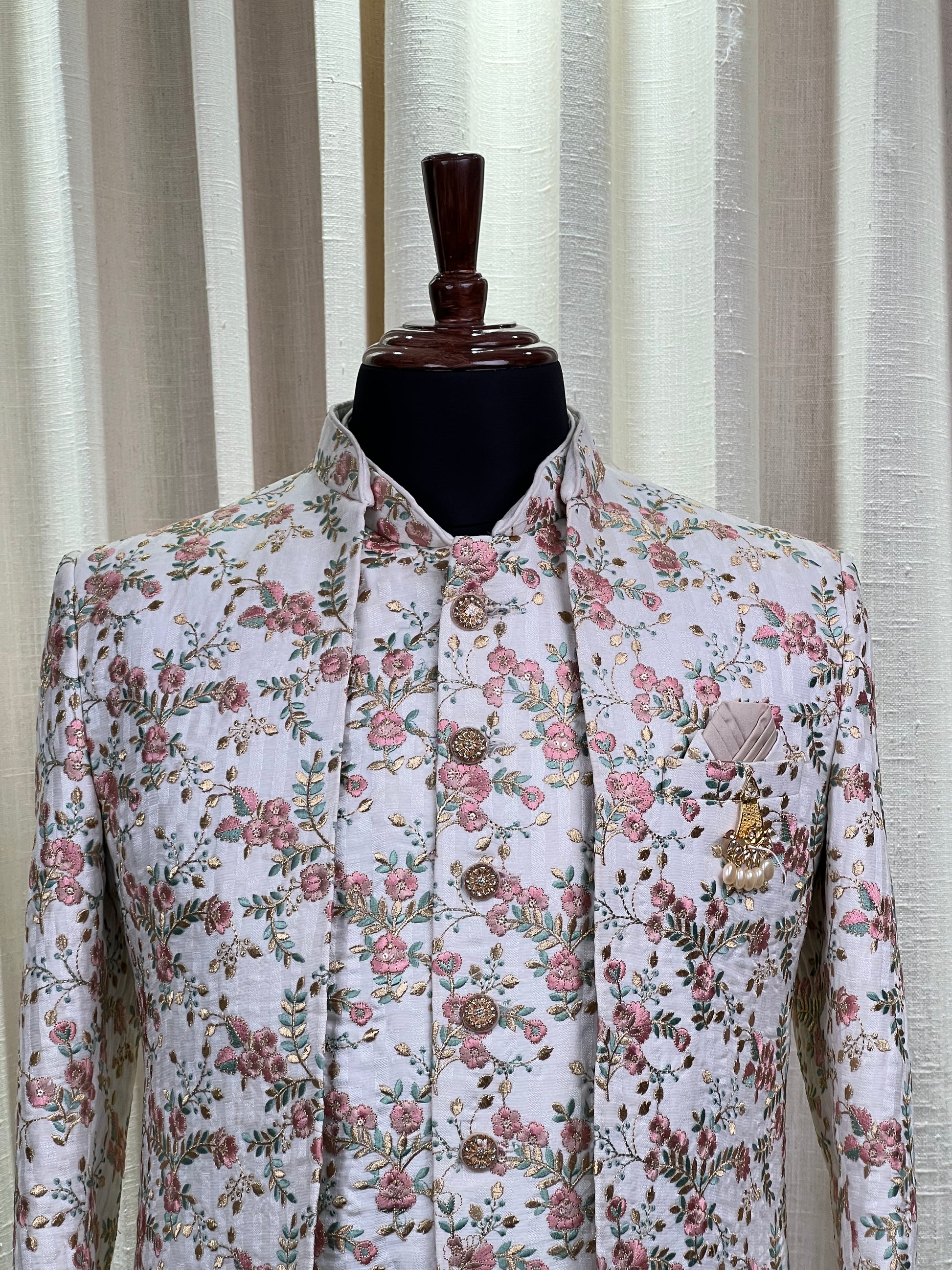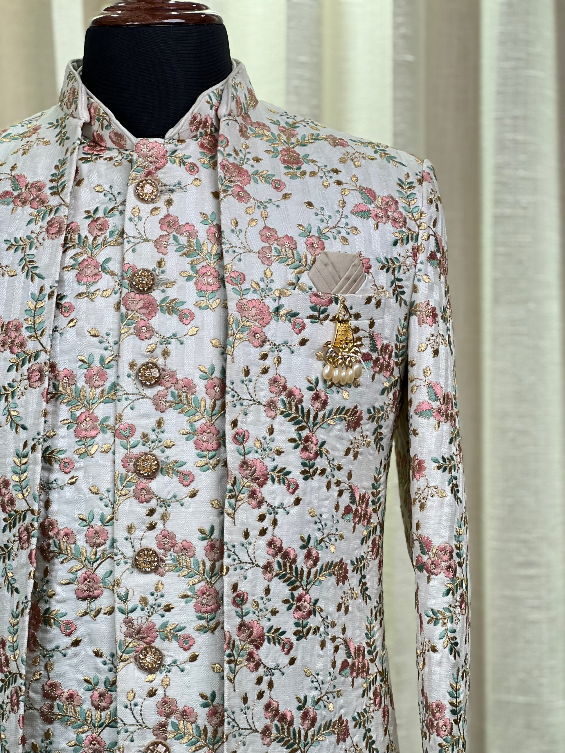 Exude timeless elegance with this ivory Jodhpuri suit, intricately adorned with pastel floral embroidery in hues of rose pink, sage green, and shimmering gold threadwork. The design features a structured silhouette with ornate gold-toned buttons, a regal bandhgala collar, and a statement brooch with pearl detailing that adds a touch of royal flair. The matching inner kurta continues the floral motif for a seamless, layered look. Perfect for daytime weddings, festive occasions, or cultural celebrations, this piece blends classic sophistication with romantic charm, making it a standout choice for the modern gentleman.